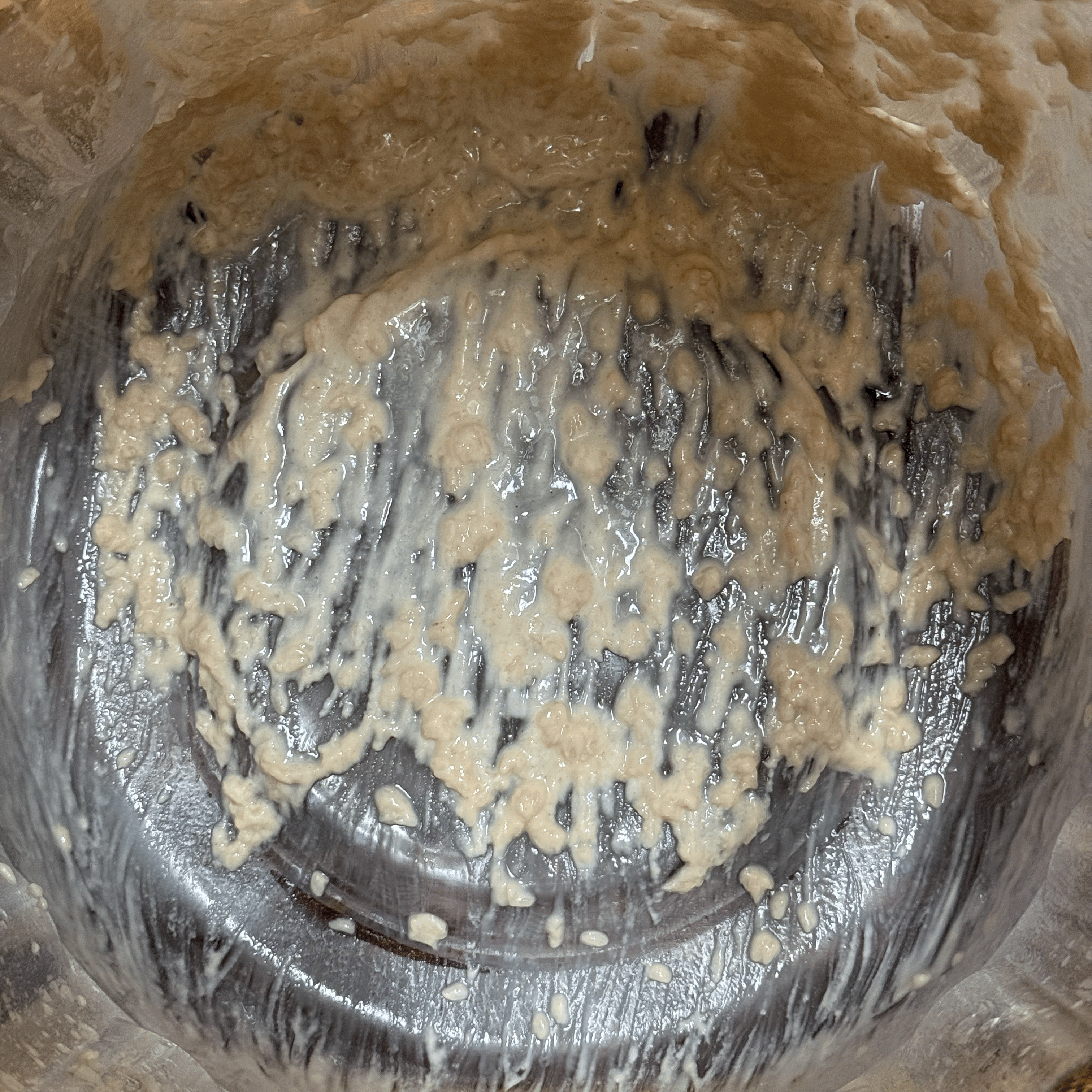 - 양푼에 통쌀죽을 덜어내고 누룩과 함께 풀어주기를 20여분 정도 진행하니 충분히 풀어져서 술덧을 안침.