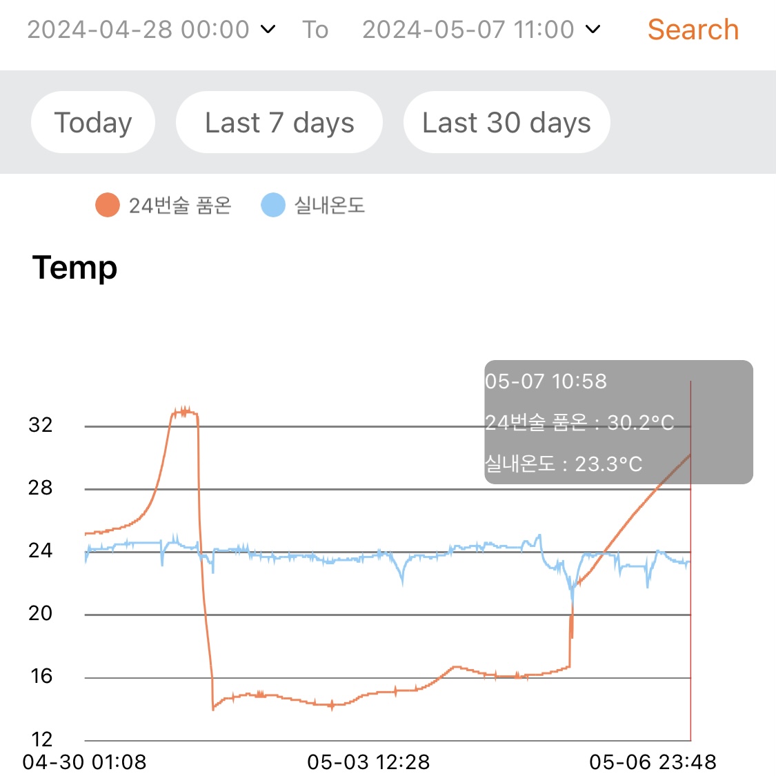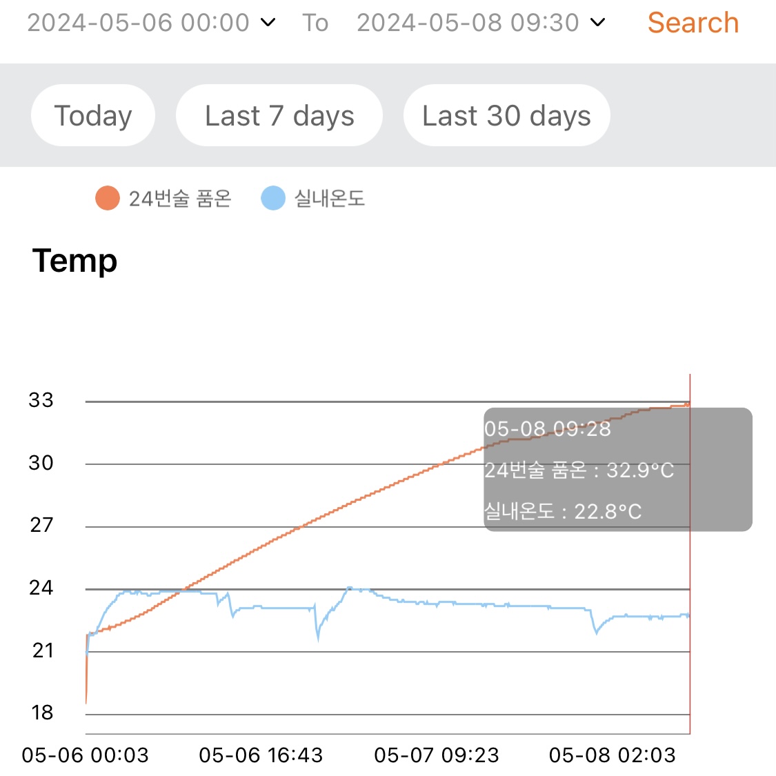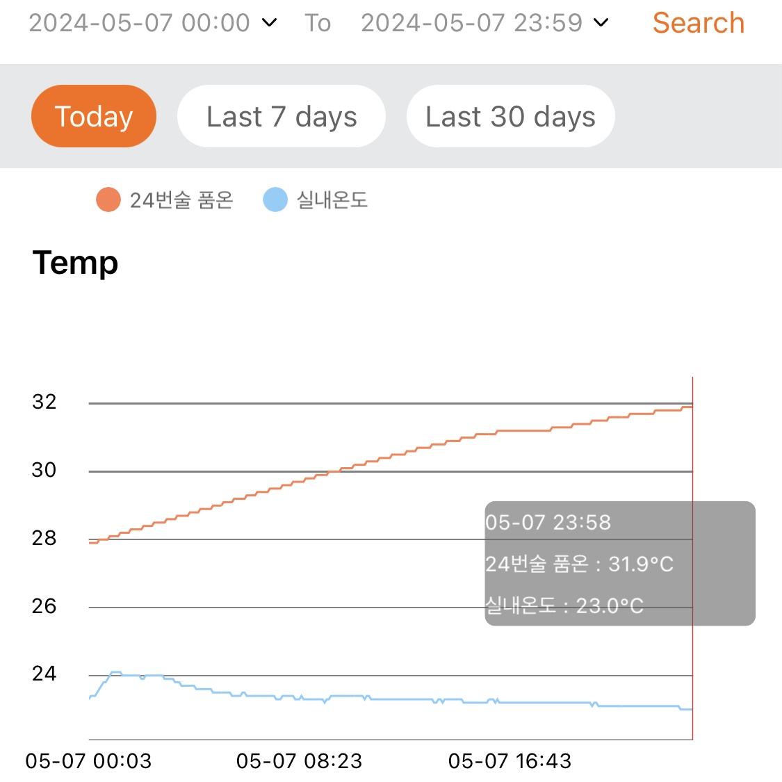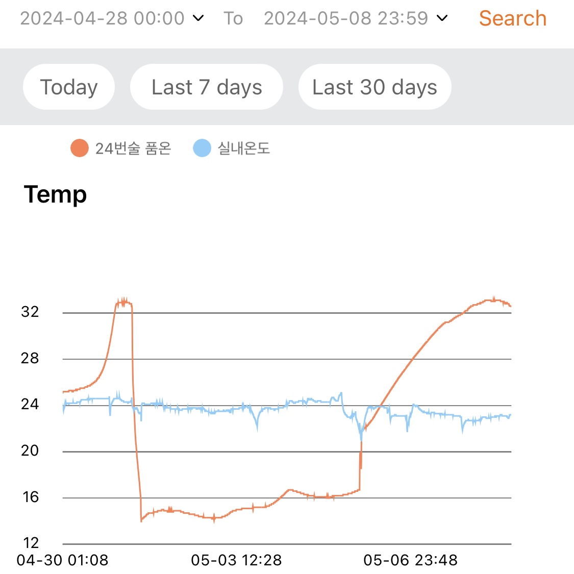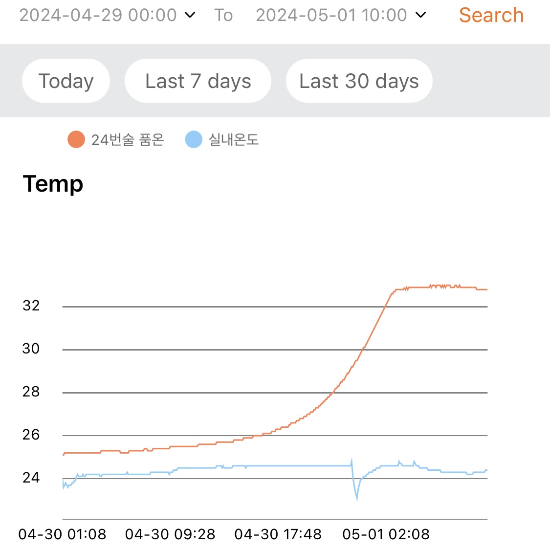 - 지난 1주일 동안 낮 시간대의 실내온도는 대략 29~30℃ 수준이고, 밤 시간대에는 환기 시키고 에어컨 틀면 대략 27~28℃ 수준이다.