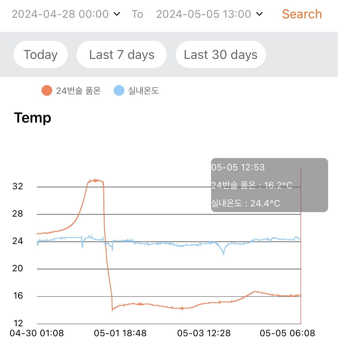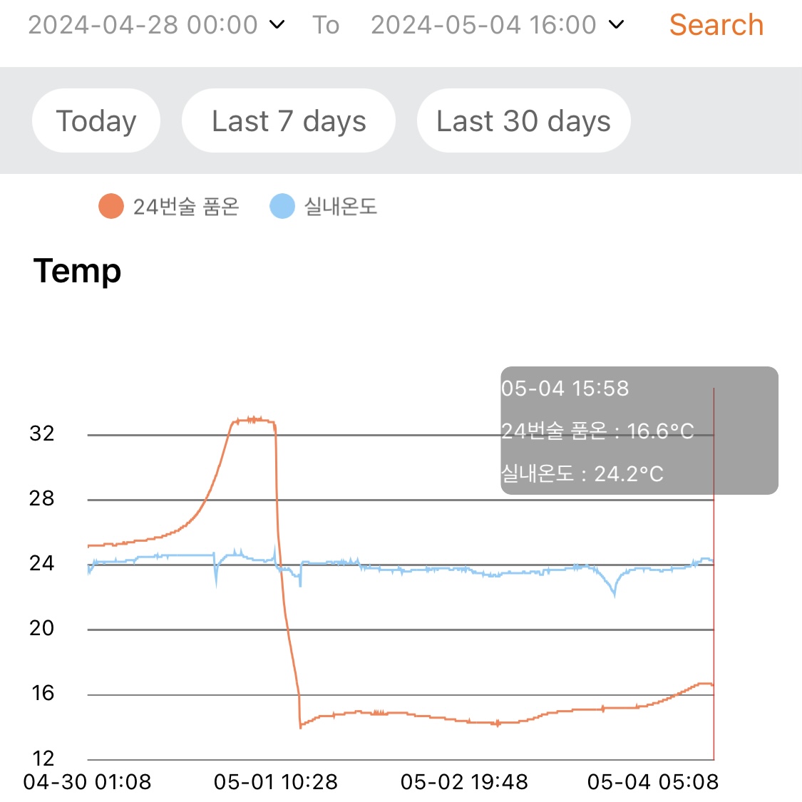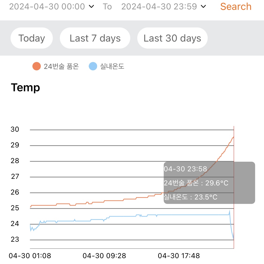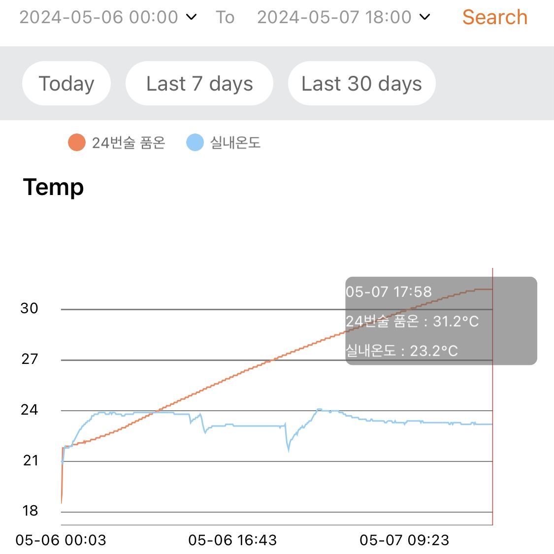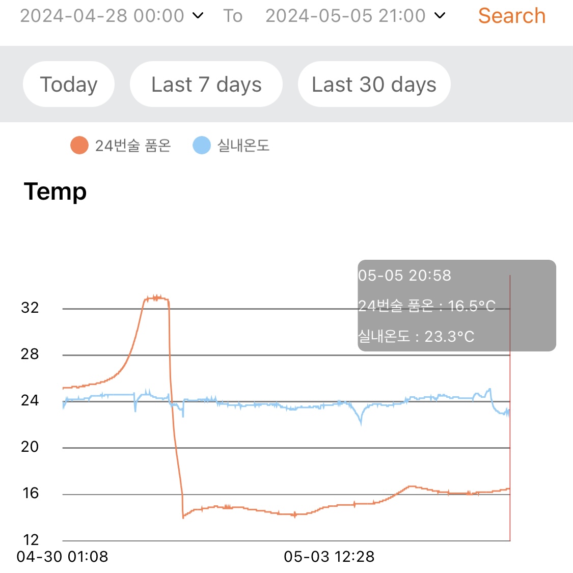 - 지난 1주일 동안 낮 시간대의 실내온도는 대략 29~30℃ 수준이고, 밤 시간대에는 환기 시키고 에어컨 틀면 대략 27~28℃ 수준이다.