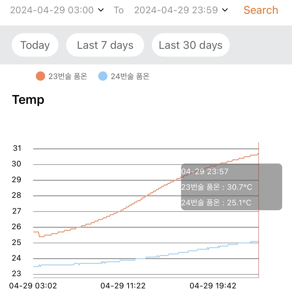 - 품온 25.1℃. (품온기록계의 왼쪽은 23번술의 품온, 오른쪽은 24번술의 품온)