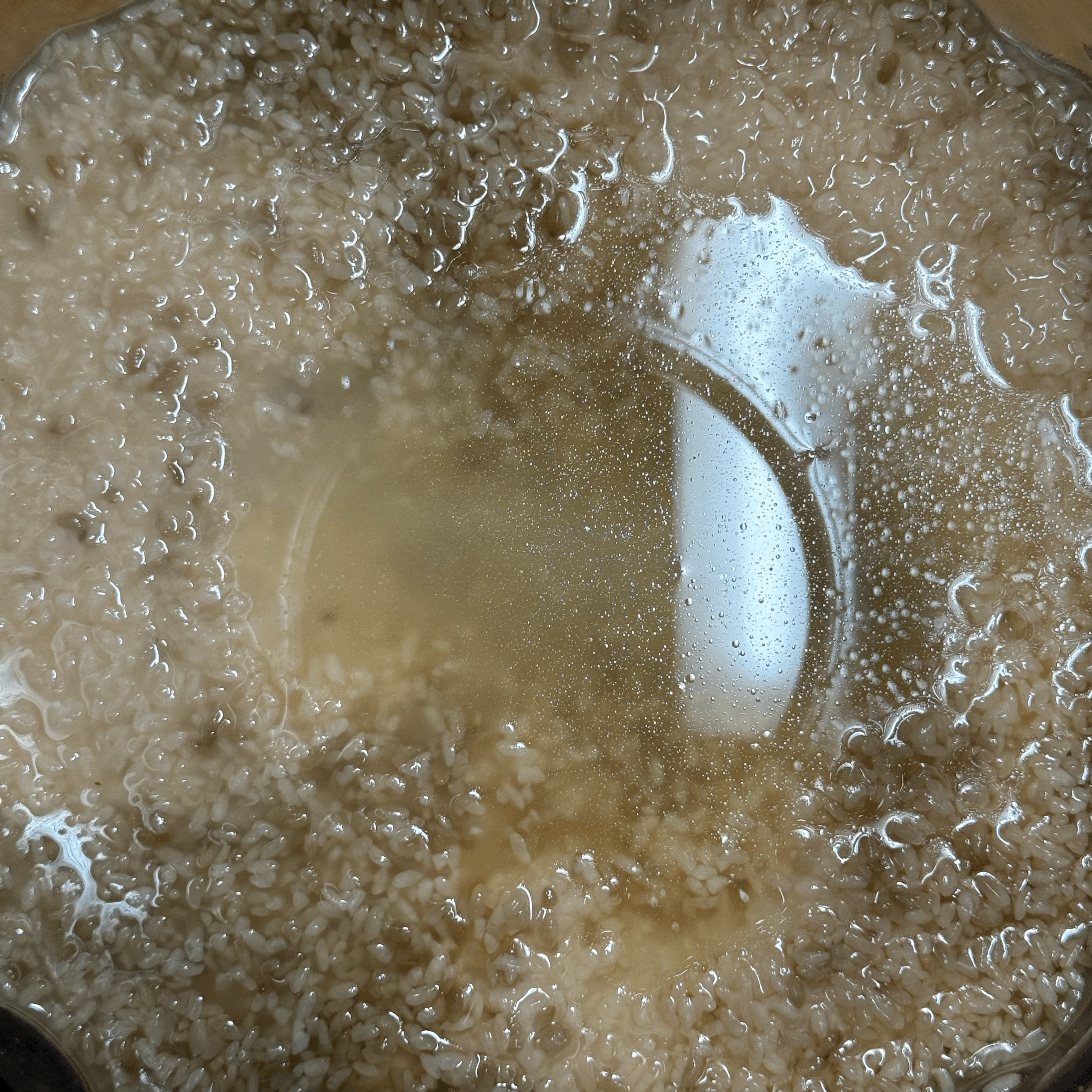 어차피 팔팔 끓는 물에서 30분 이상 끓인 뒤에도 불 끄고 뜸들이면서 천천히 식힐 것이라 1시간 정도만 불려도 충분하겠더라. - 팔팔 끓인 수돗물 10L에 불린 멥쌀을 건져내 넣고 다시 끓이기를 3번 반복해서 5분 동안 불린 멥쌀을 넣고 끓임.