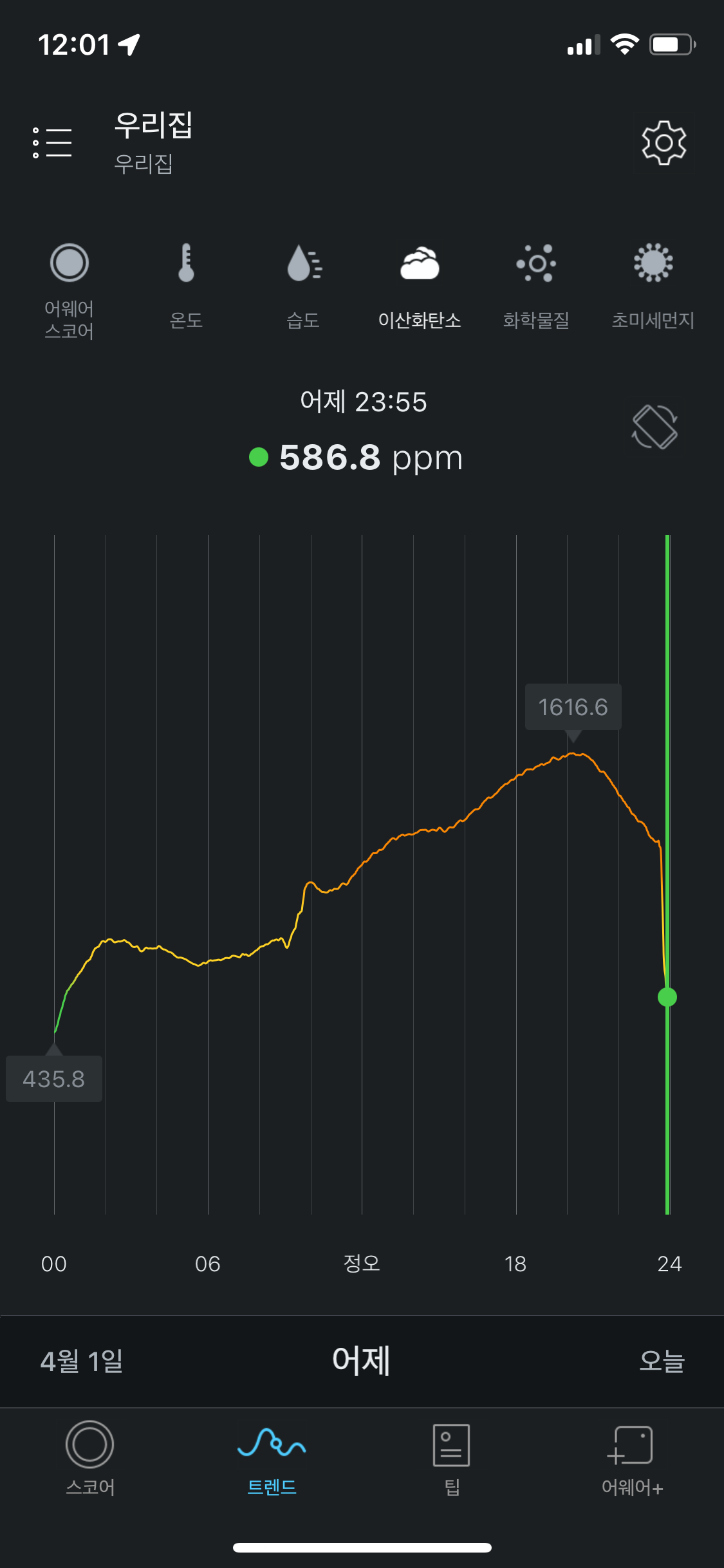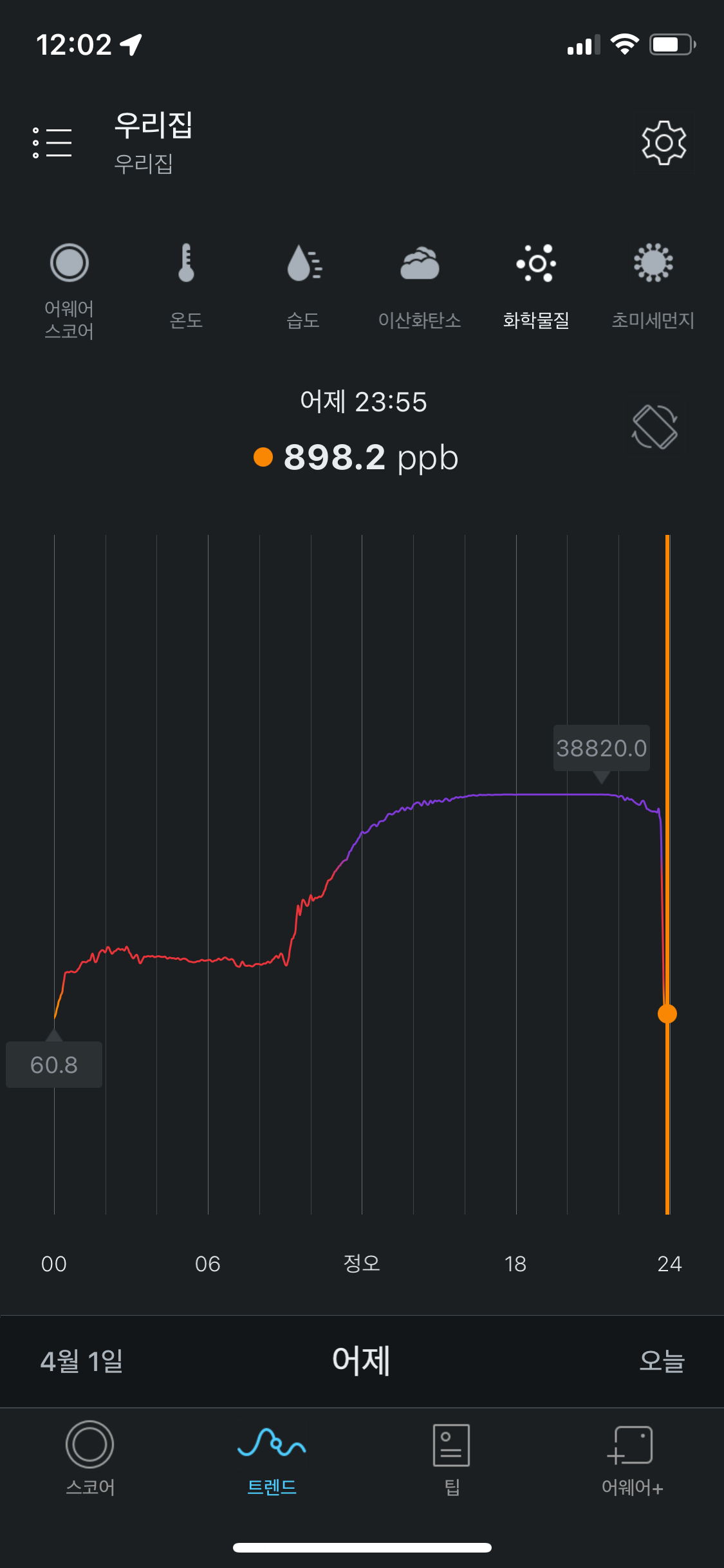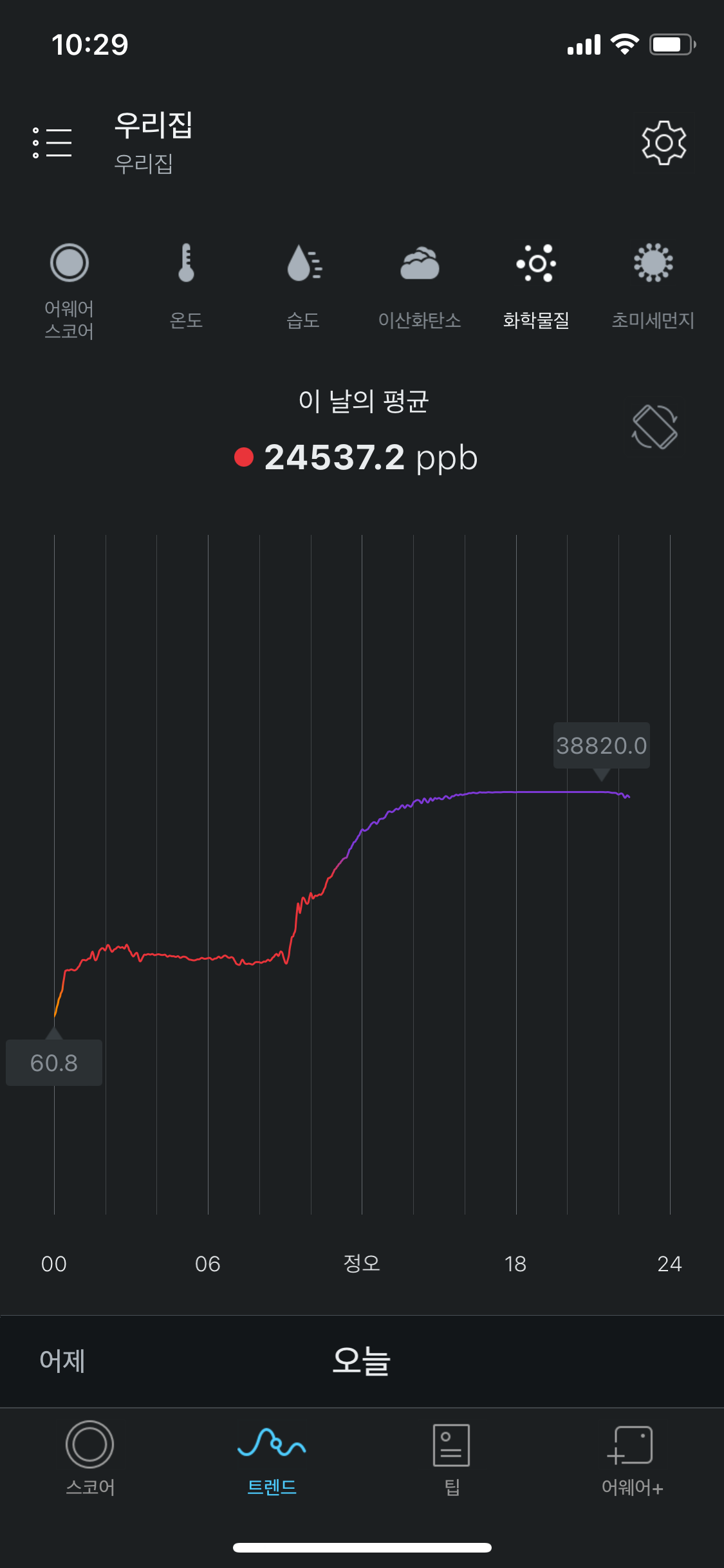 예상대로 화학물질 농도가 아침에 창문 닫아놓은 이후로 급격하게 증가해서 이미 포화상태다.