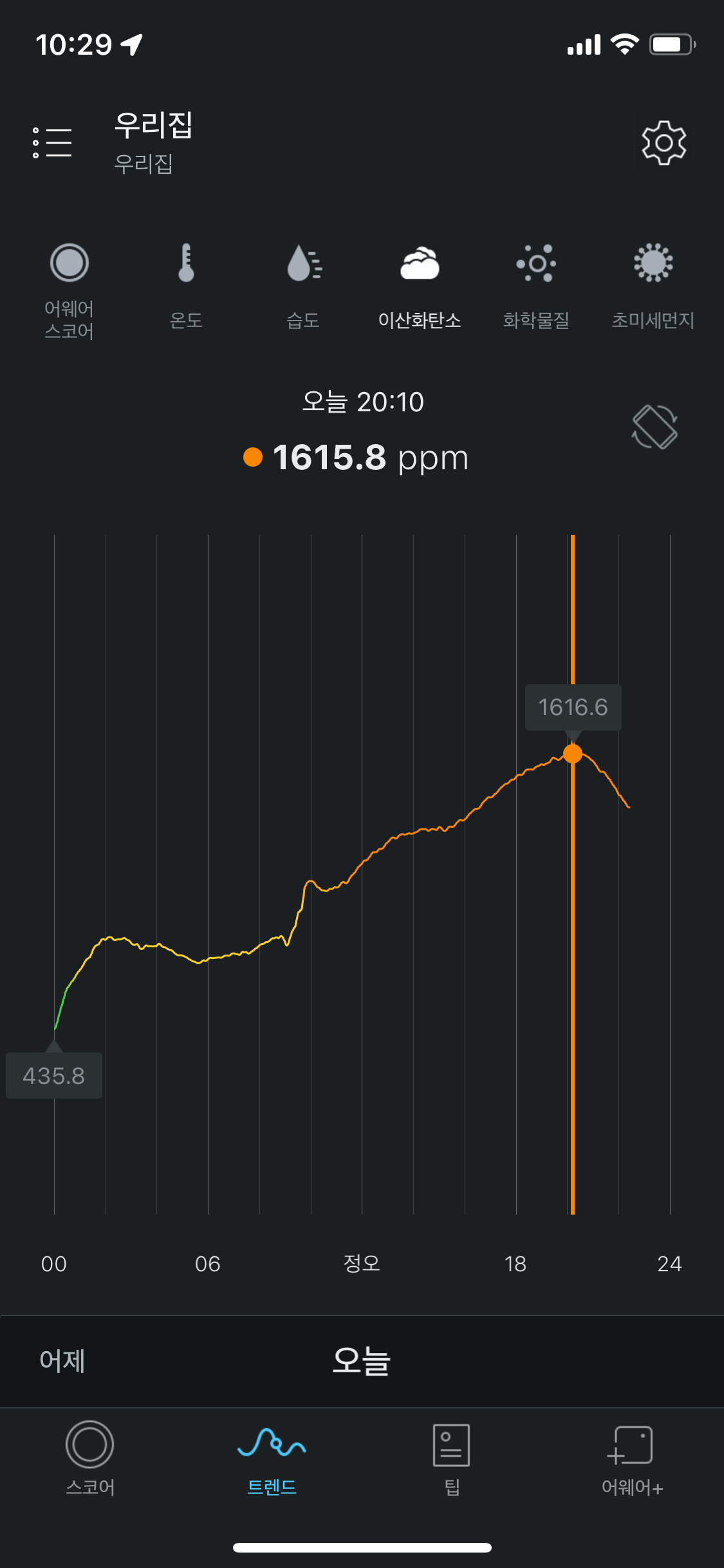 품온 그래프의 기울기가 둔화되고 품온이 35.4℃를 찍은 뒤 다시 35.3℃를 찍었길래 이제 슬슬 정점인가보다 싶어 실내 공기 모니터를 확인해봤다.