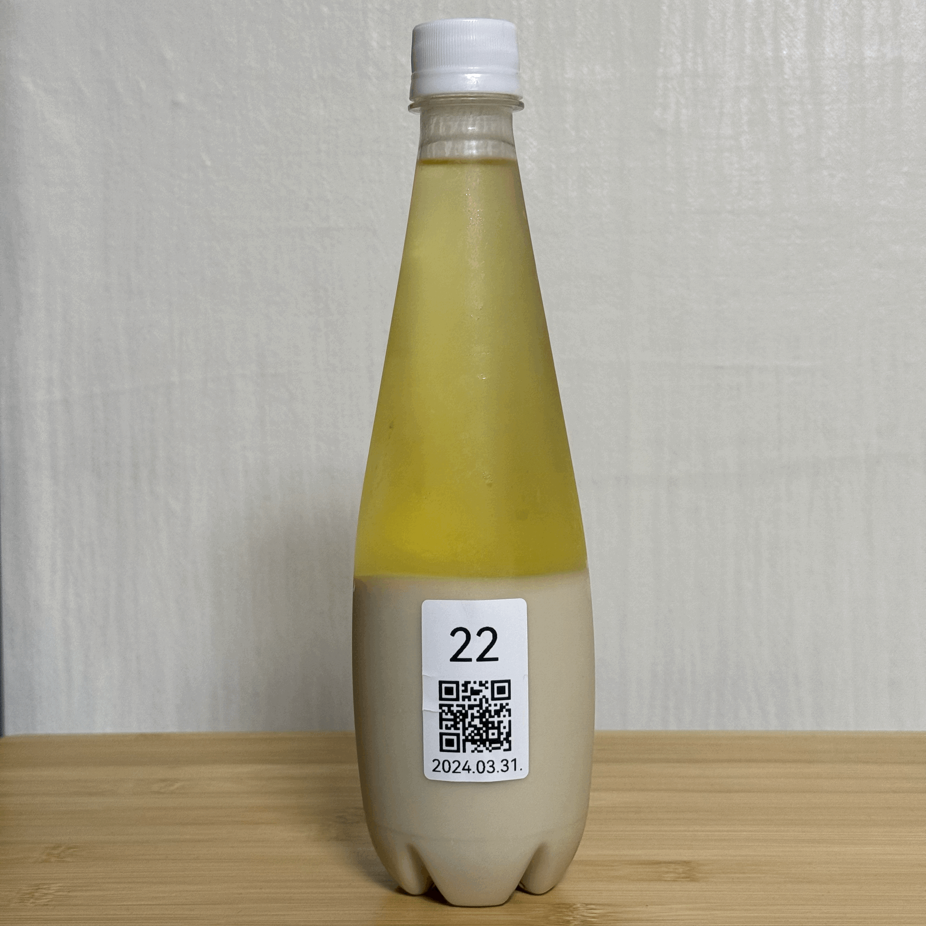 전내기(원주)는 1L 8병과 500mL 7병이 나왔고, 자투리로 600mL 정도 1병 더 나왔다. 술병에 담을 때 금방 마실 병은 정량보다 조금 더 많이 담기도 했으니 대략 1L 9병, 500mL 7병으로 봐도 될 것 같다. 그렇게 보면 대략 전내기는 12.5L 나왔다고 봐도 될 것 같다.