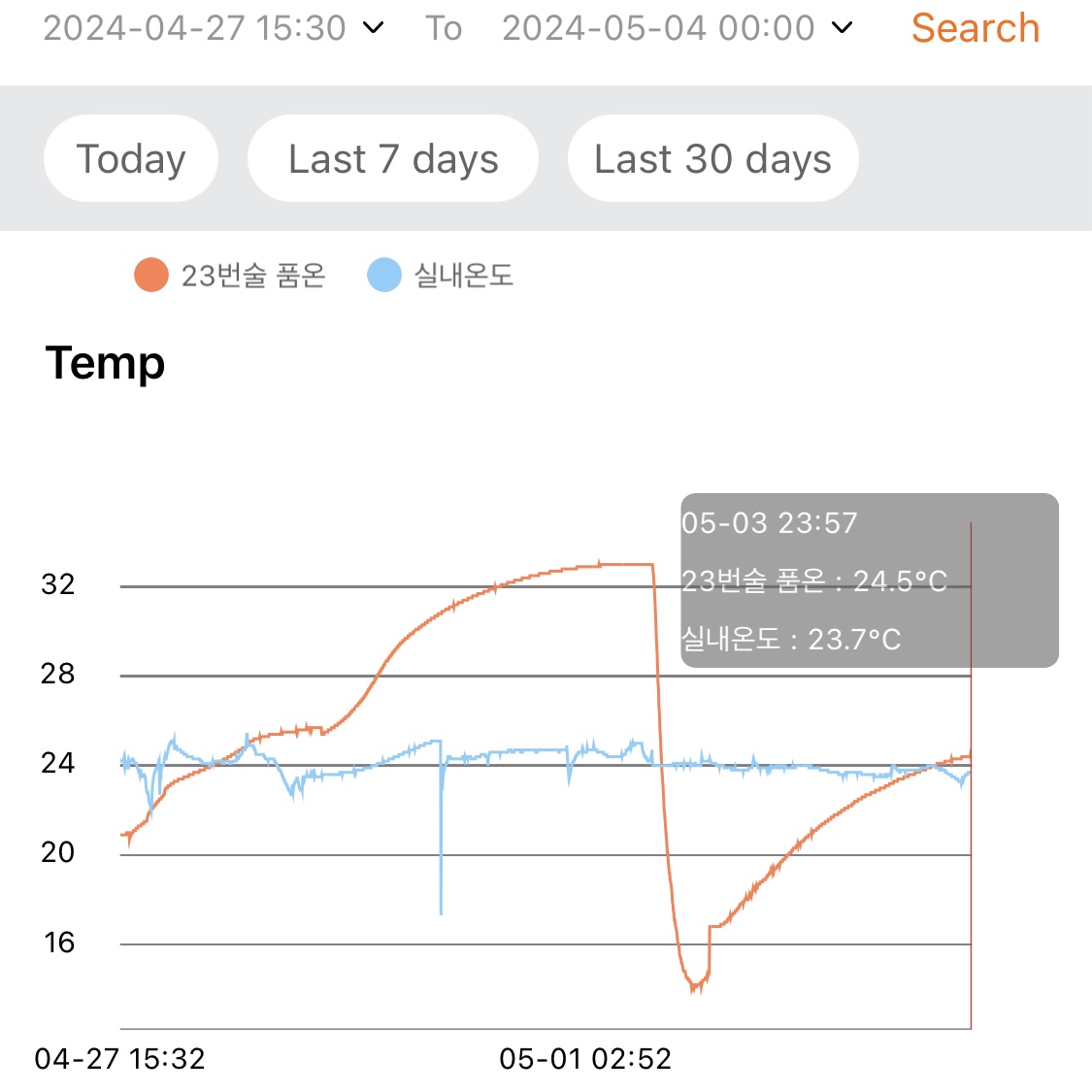 - 품온이 실내온도 수준으로 올라온 후 품온 기록계를 빼고 뚜껑을 닫아줄 예정이다.