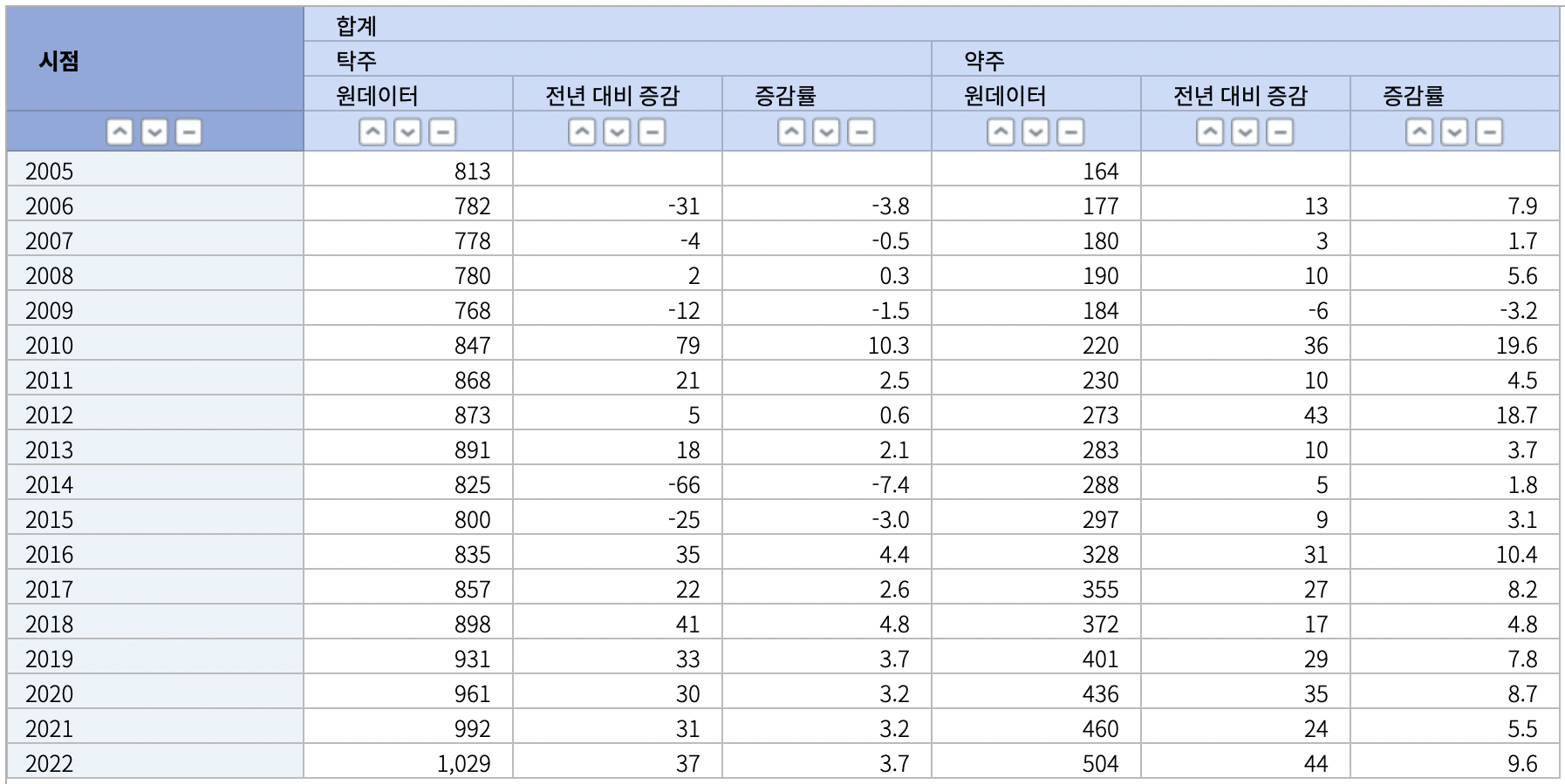 2022년 기준 탁주 제조 면허는 1,029개, 약주 제조 면허는 504개로 약주 제조 면허의 증가세가 탁주 제조 면허의 증가세보다 더 크다.