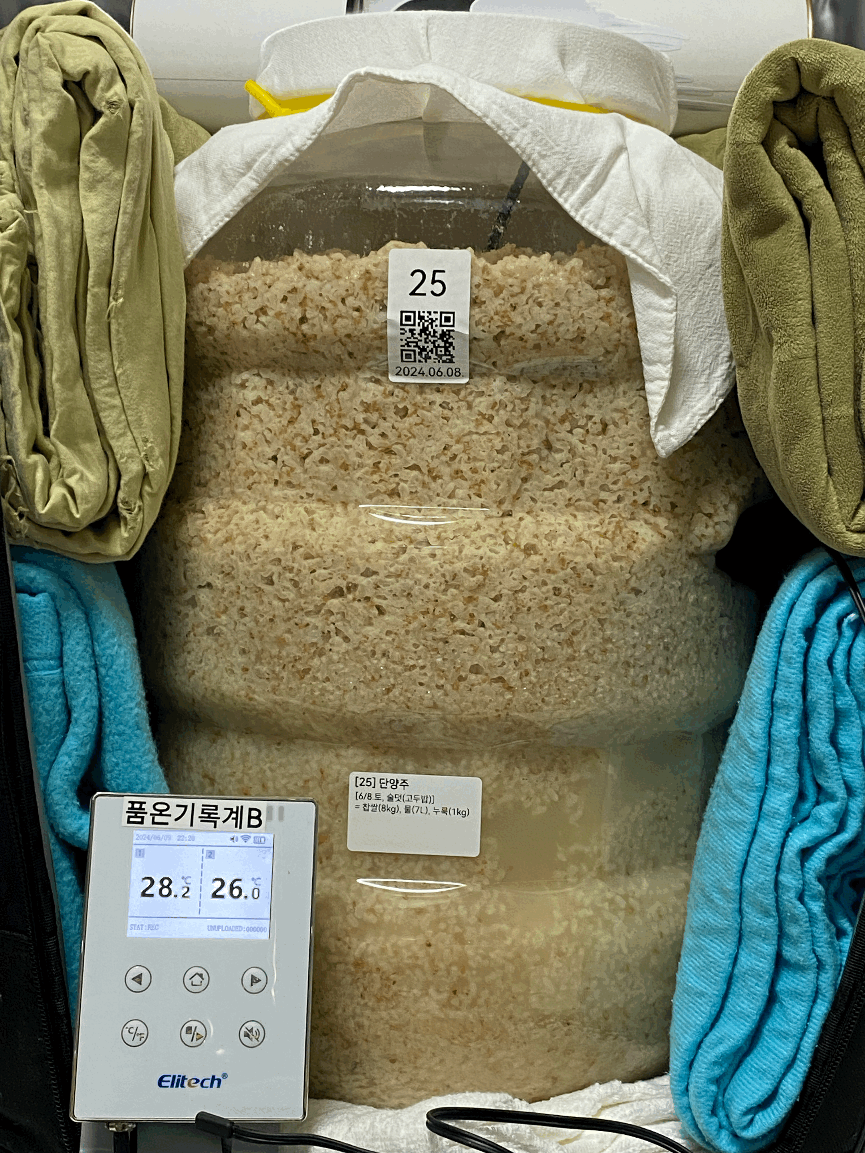 - 20L 술독에 술덧을 안치면서 품온계 센서를 설치하고 면포 덮은 뒤 고무줄로 묶고 보냉백에 넣어 보쌈해둔다.