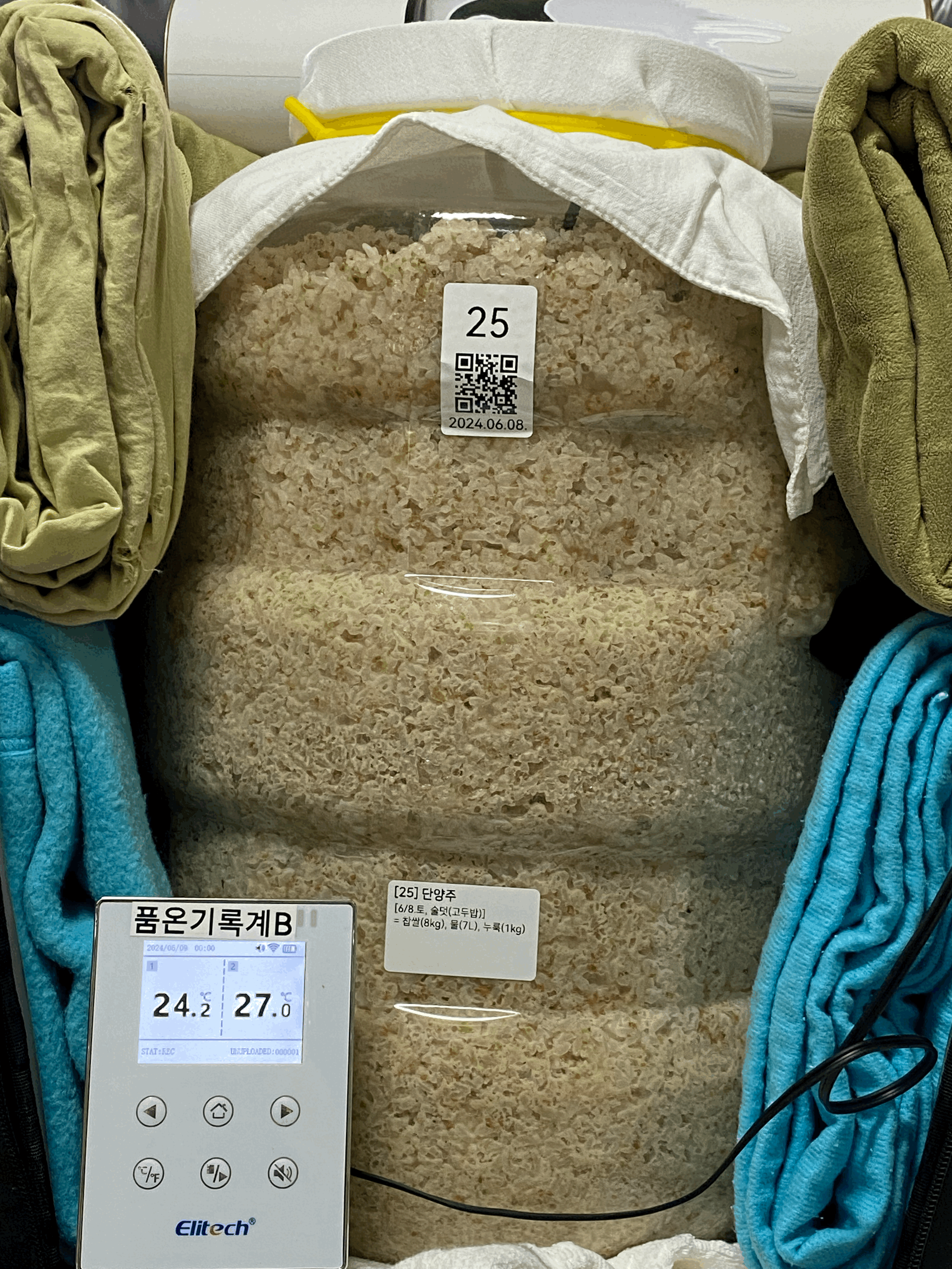 - 술독 뚜껑의 면포 위에 비닐을 덮고 고무줄로 묶어 혐기성 환경을 조성해주고, 품온 센서는 그대로 유지한다.