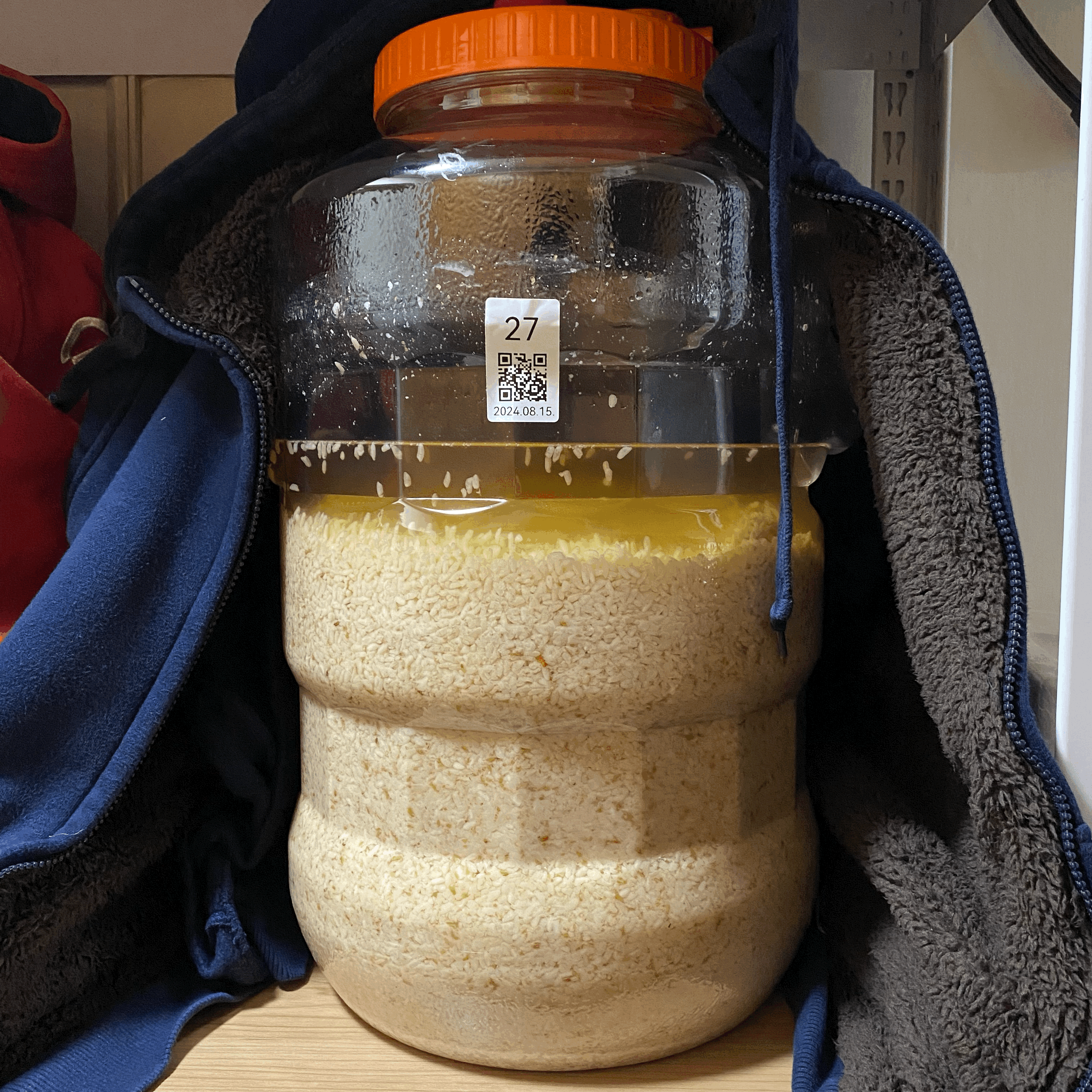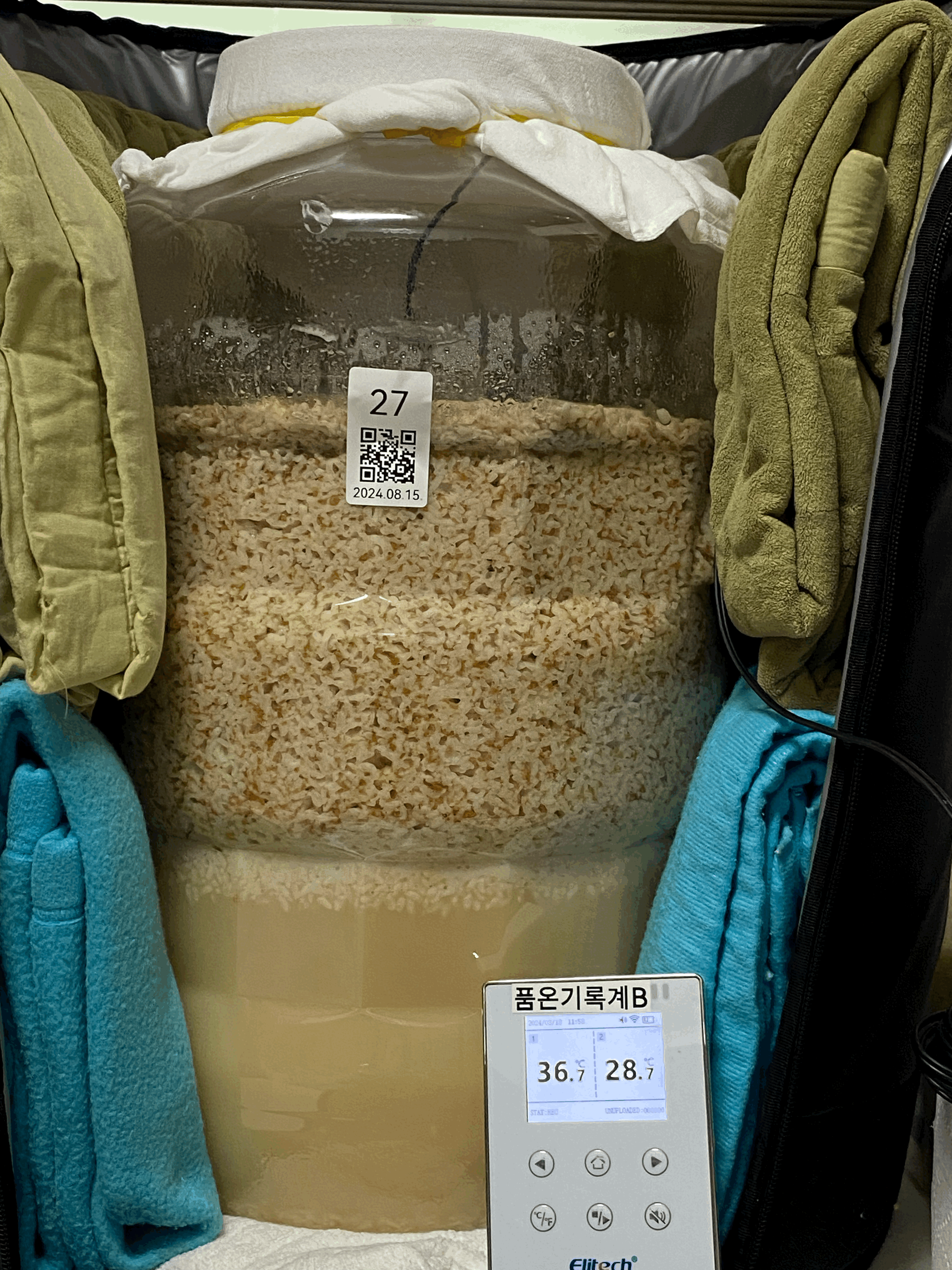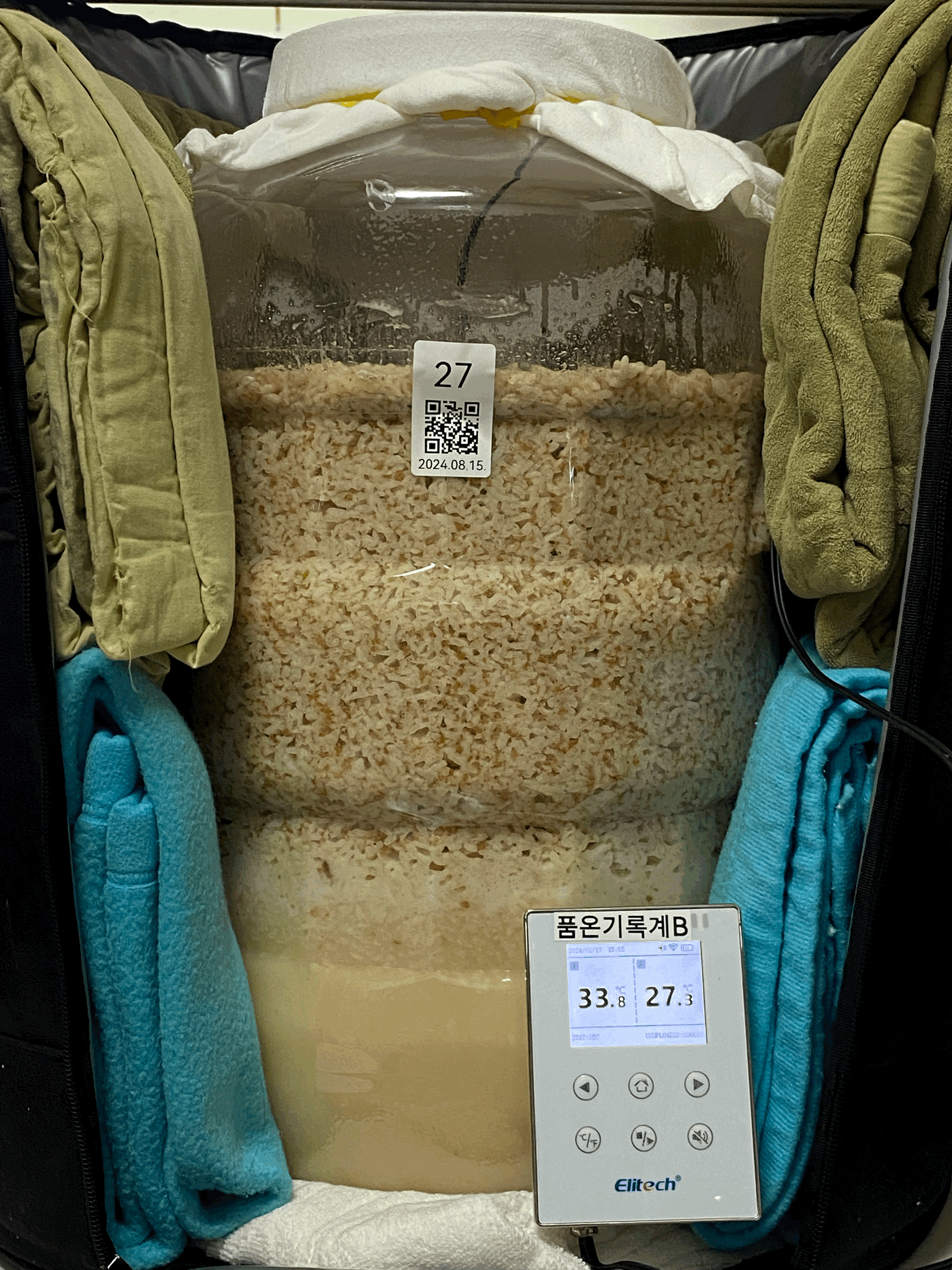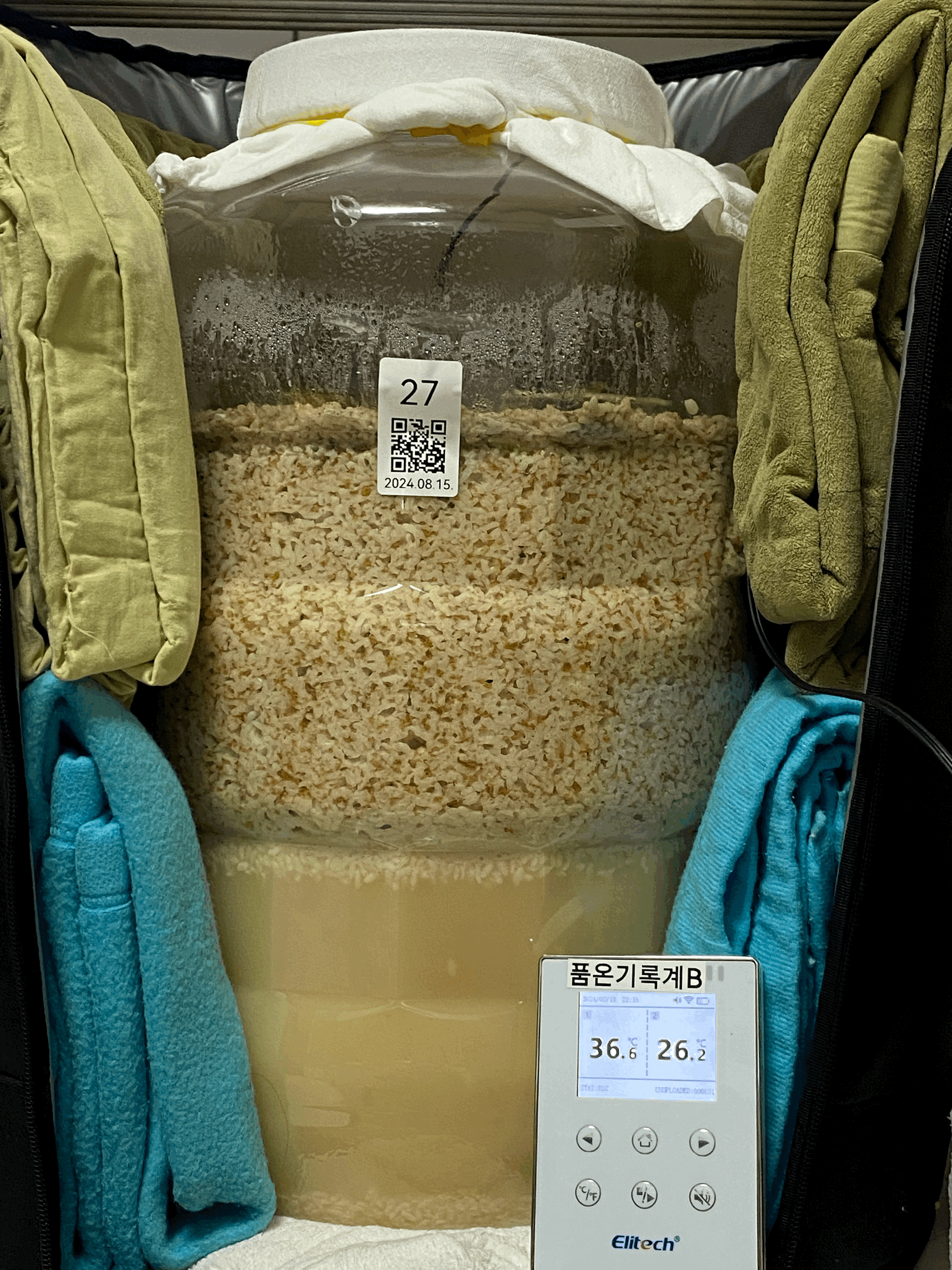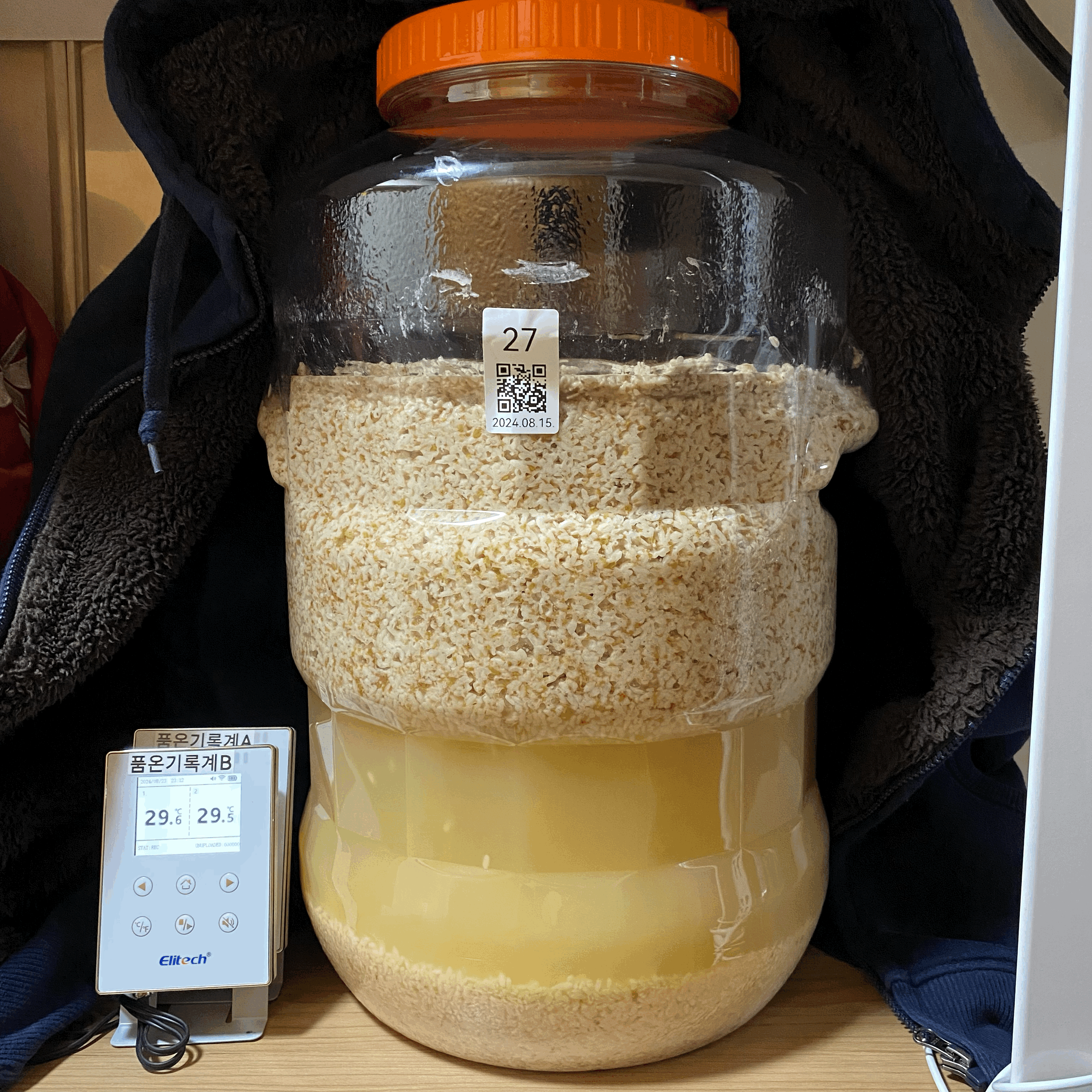 2024년 8월 15일 15:30, 품온 21.0℃, 실내온도 27.5℃ → 술 안침. 주발효 시작.
