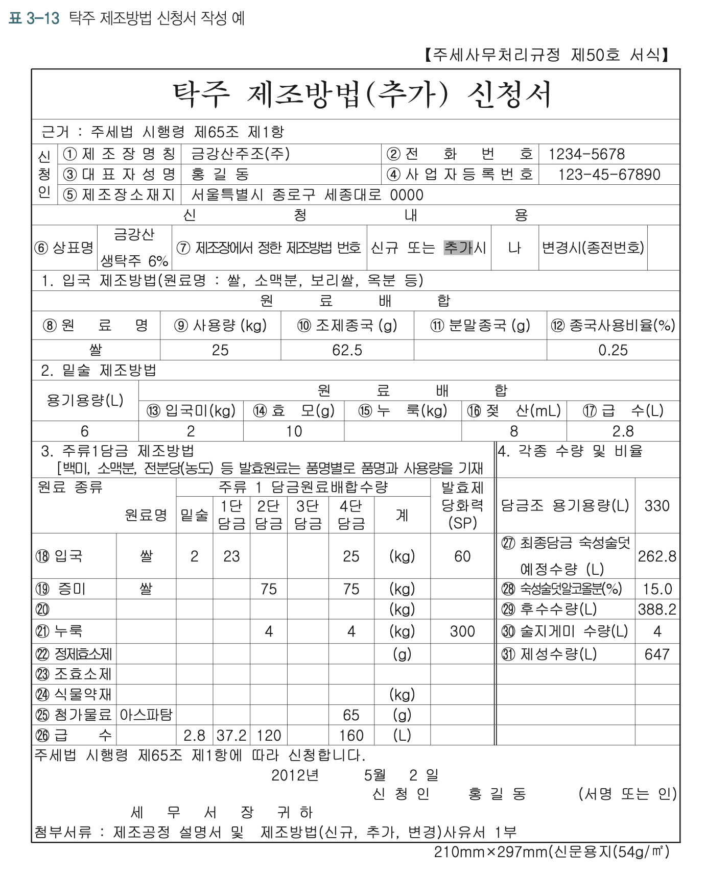 이 때 사용한 데이터는 아래와 같이 '탁주 제조방법 신청서'의 원료 명세를 기준으로 계산한 것이다.