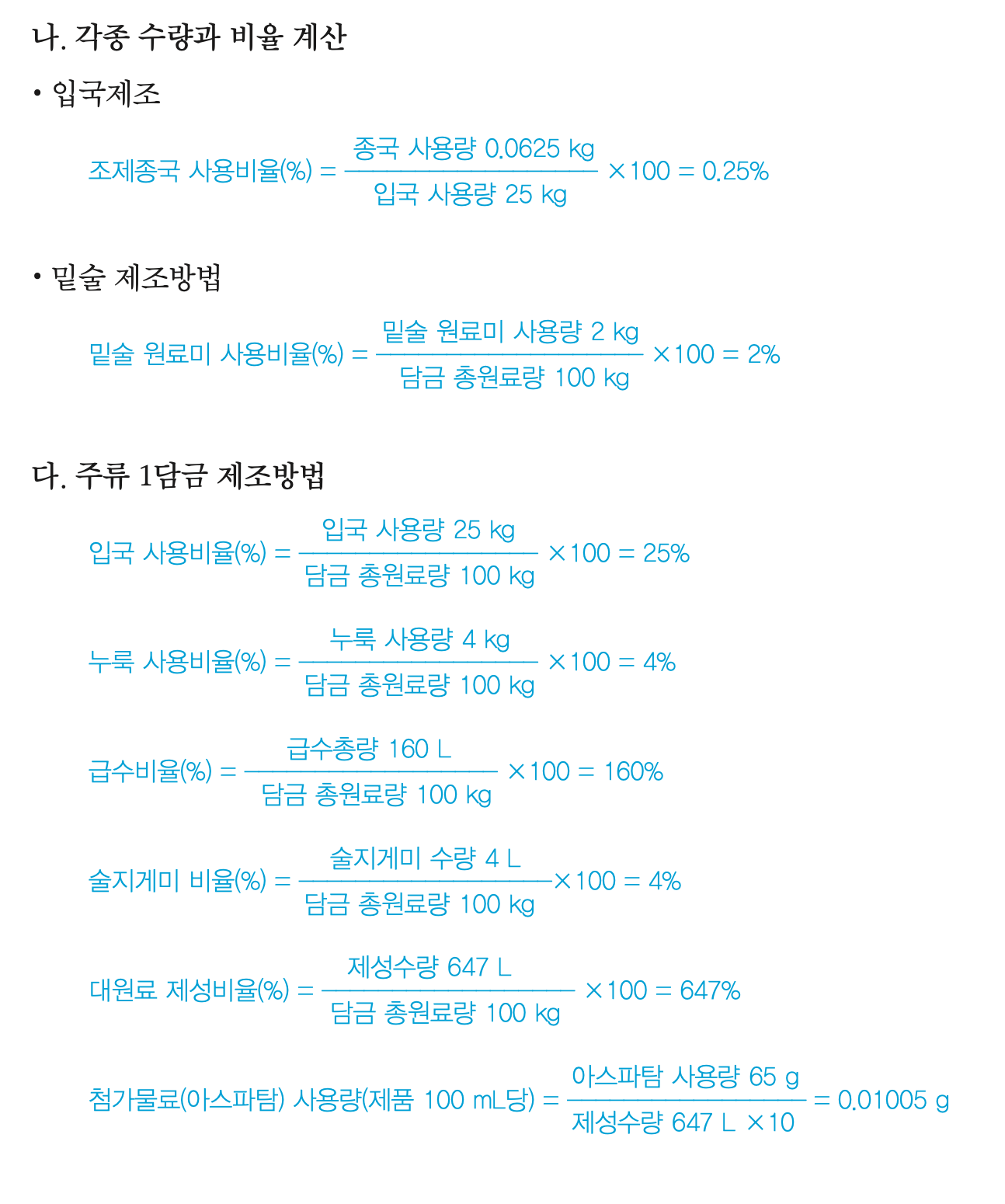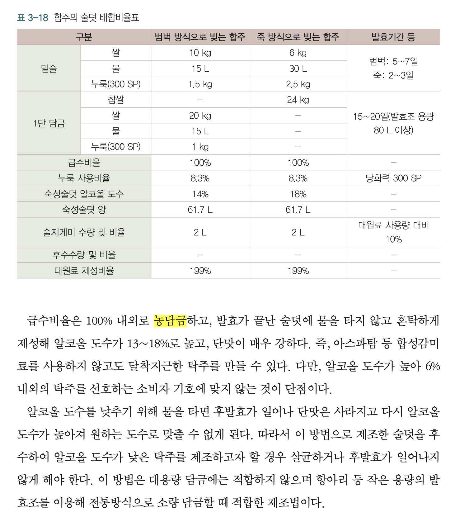 계산을 위한 급수총량과 담금 총원료량은 아래 자료를 참고하면 된다.