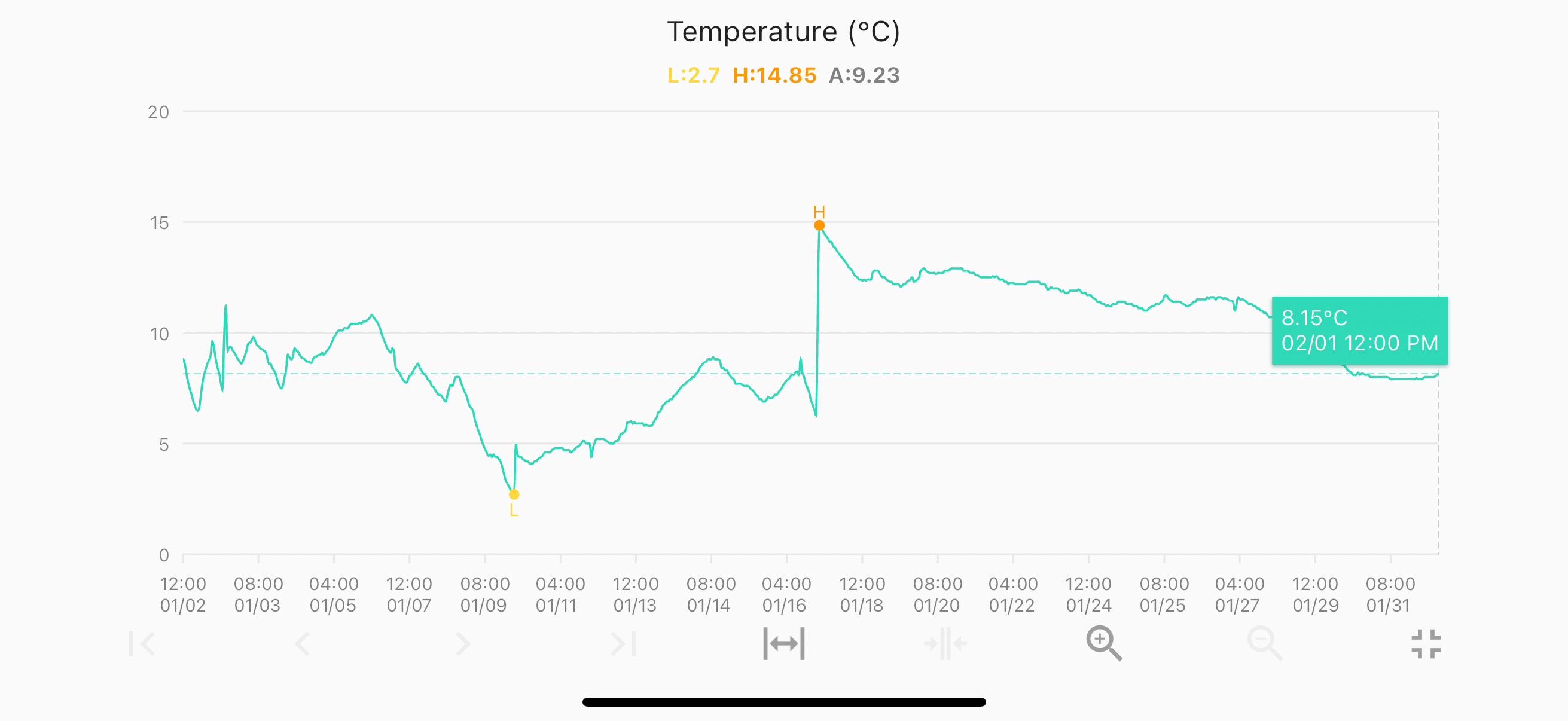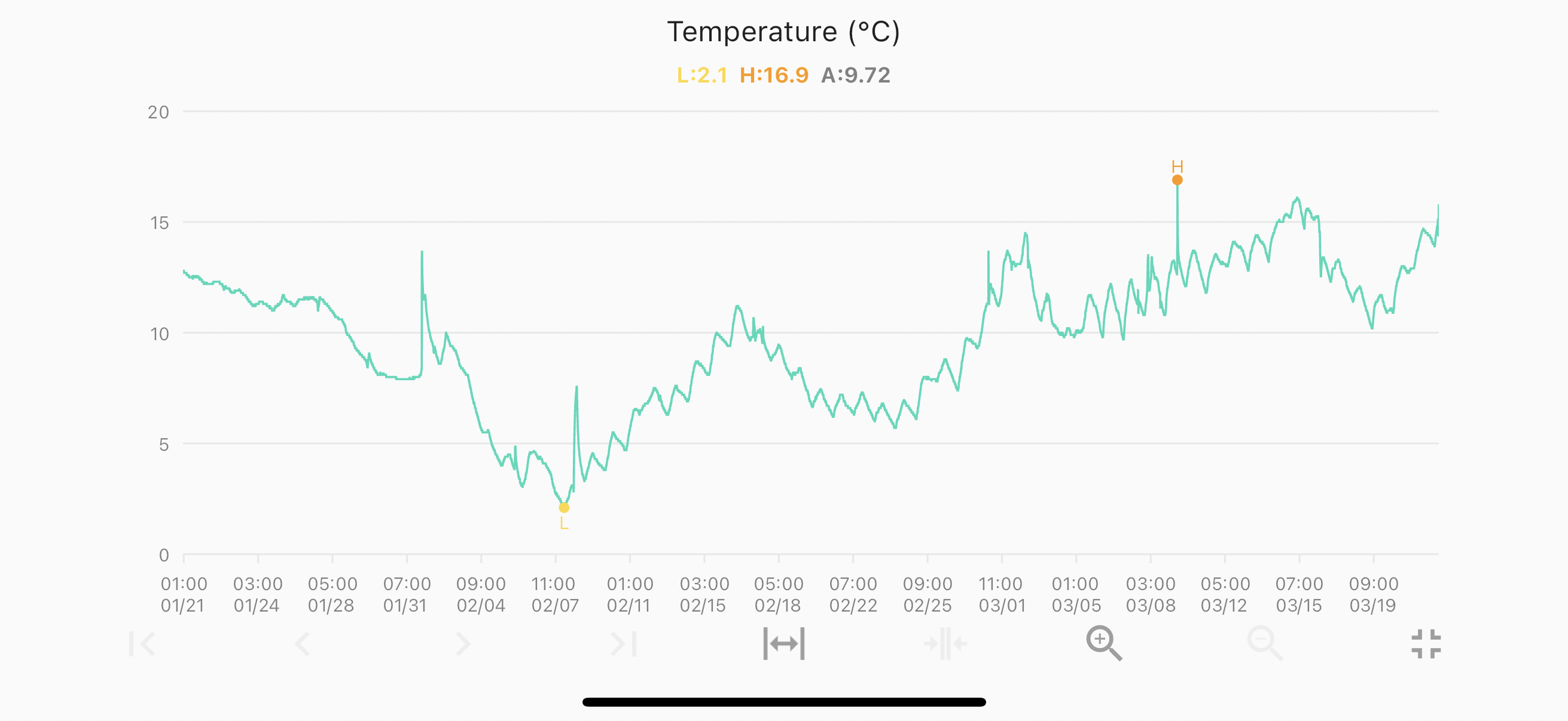 간만에 보냉백 속 온도 기록을 살펴봤다. 지난 주 목요일(1/10) 아침 최저 기온이 -13℃를 찍을 정도로 한파였는데 수요일 자정 쯤 보냉백 속에 담요를 채워줬더니 온도가 더 이상 떨어지지 않은 채 5℃ 내외를 유지하다가 조금 씩 오르고 있다.