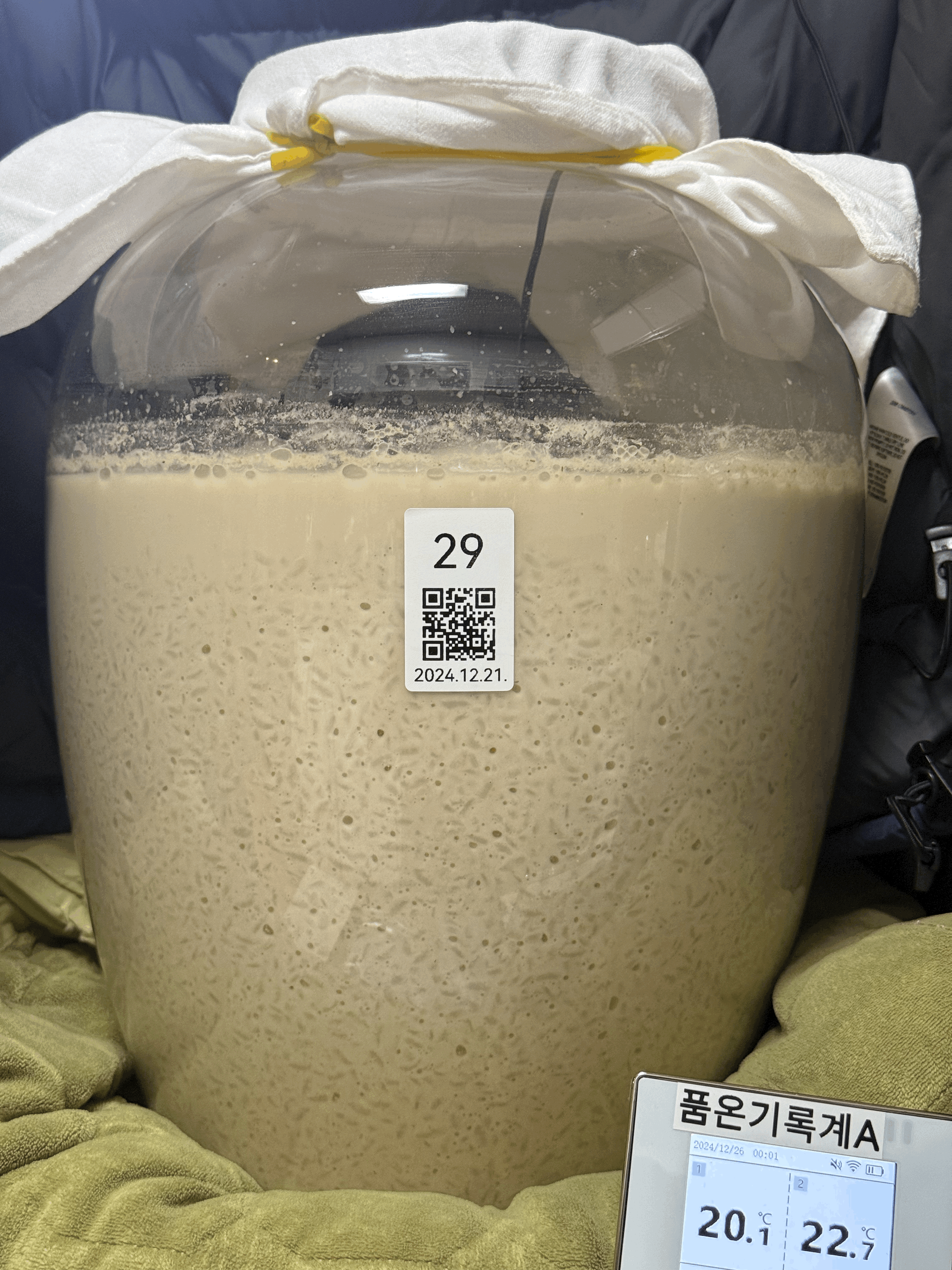 2024.12.21.토.14:40, 주발효 시작 → 품온 20.1℃, 발효환경 22.2℃, 술독 무게 5.98kg