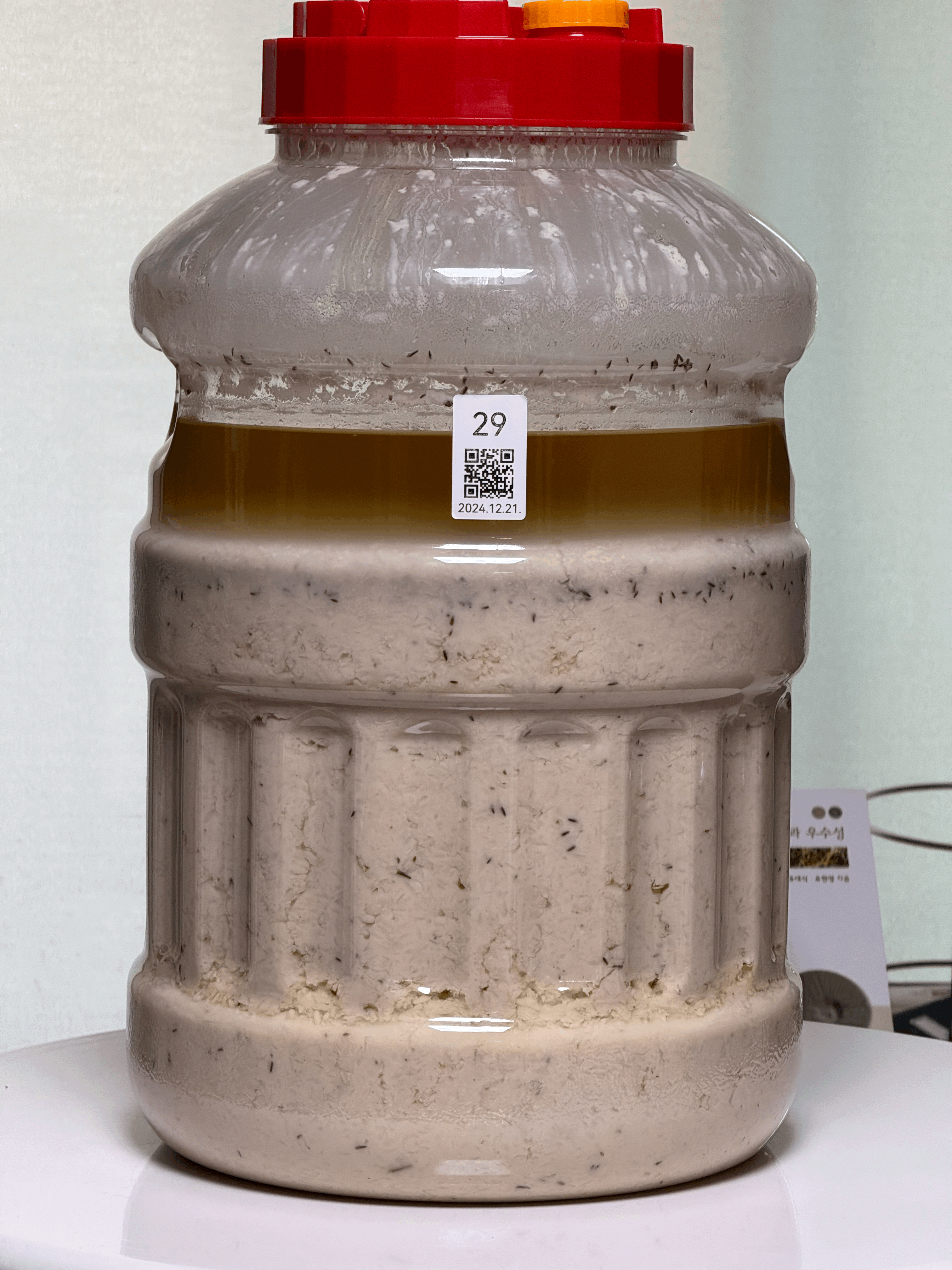 2024.12.29.일.00:05, 주발효 시작 → 품온21.1℃, 발효환경 22.3℃, 술독무게 23.16kg
