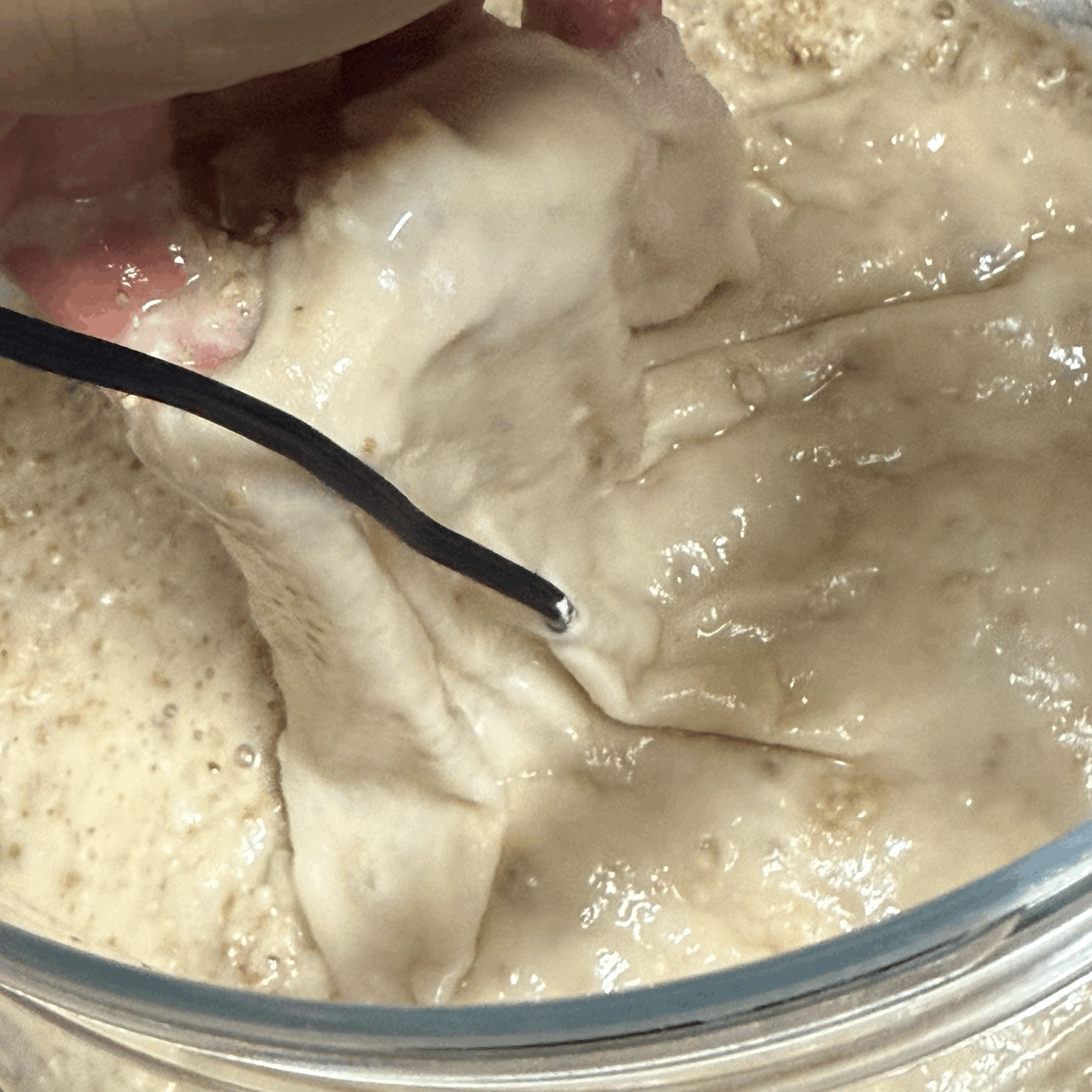 바닥에 앙금이 가라앉아 굳었는지 확인해보니 만져지지 않았다. 윗막지와 함께 1~2분간 술덧을 저어주며 술덧 속 이산화탄소를 빼주고, 술덧에 산소를 공급해줬다.