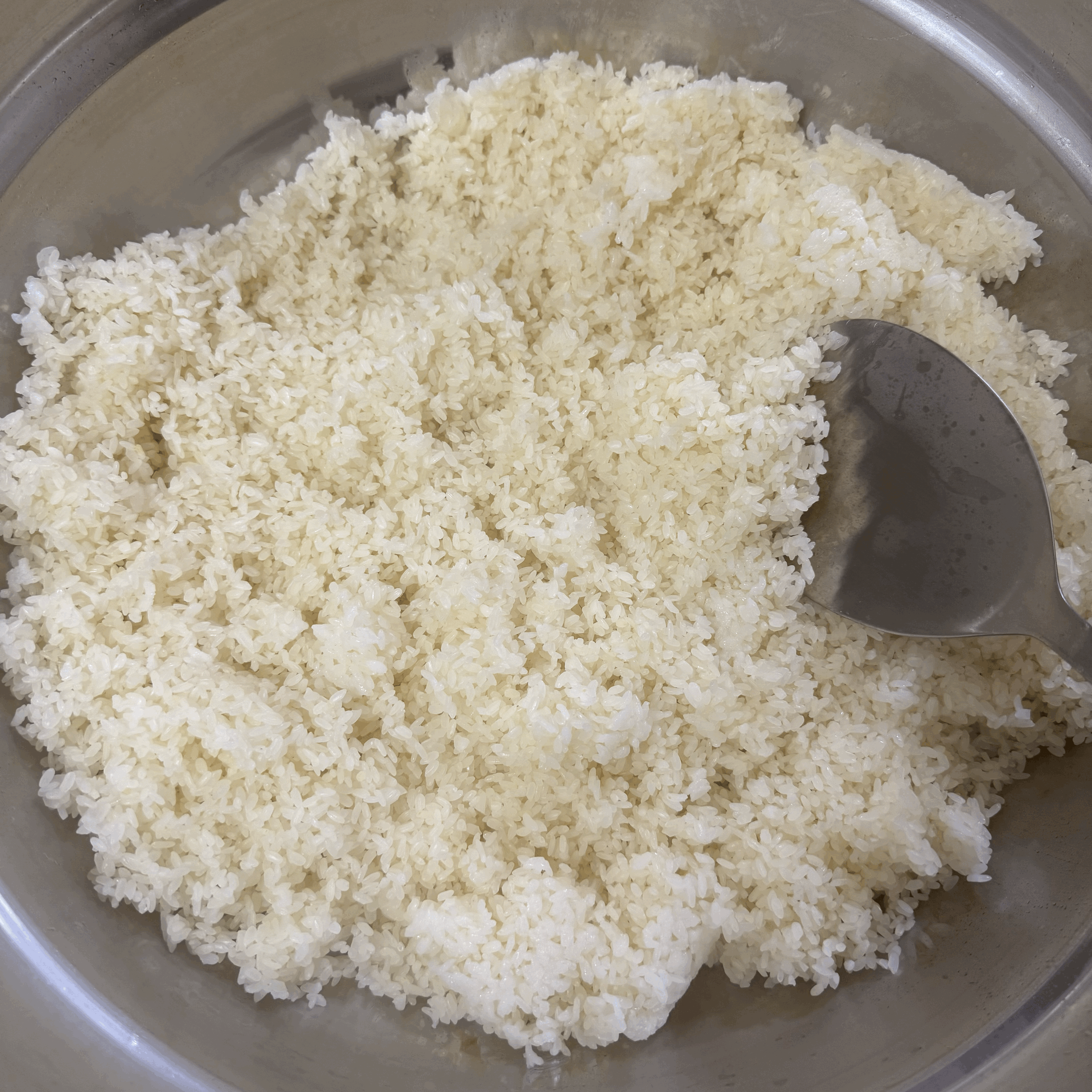 팔팔 끓는 물의 1/3을 부어주고 나머지는 계속 끓임. 고두밥을 주걱으로 계속 뒤집어주면서 고두밥이 물을 고루 흡수하게 함. 이 과정을 3회 반복 후 고두밥 품온을 재보니 약 69℃