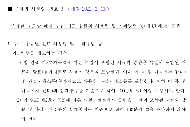 현행 주세법시행령에 의하면 부재료 함량 기준은 '쌀 대비'가 아니라 '합계중량 대비'이고, '미만'이 아닌 '이하'이므로 부재료를 좀 더 써도 되는데 아쉽다.