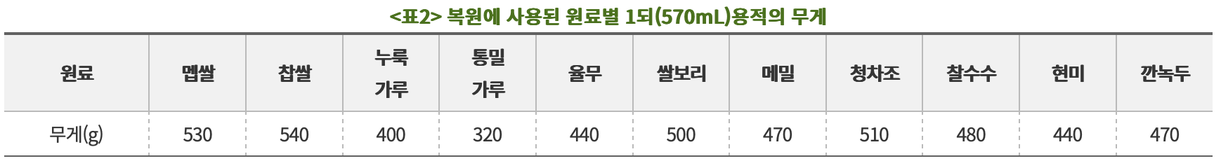 즉, 고문헌의 '1되'라는 단위는 부피 단위이며, 계량컵으로 계량하면 어렵지 않게 그 당시의 단위를 복원할 수 있다.