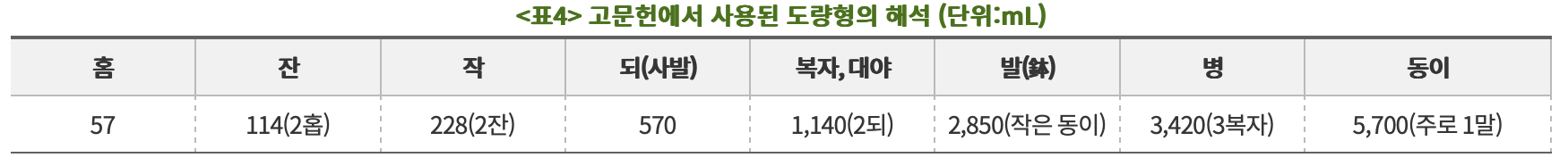 이런 단위들은 그 당시 주방문을 작성한 사람이 쓰던 용기를 지칭하는 용어일텐데, 문제는 그 당시 그가 쓴 용기의 부피를 알 수 없다는 것이 문제다.