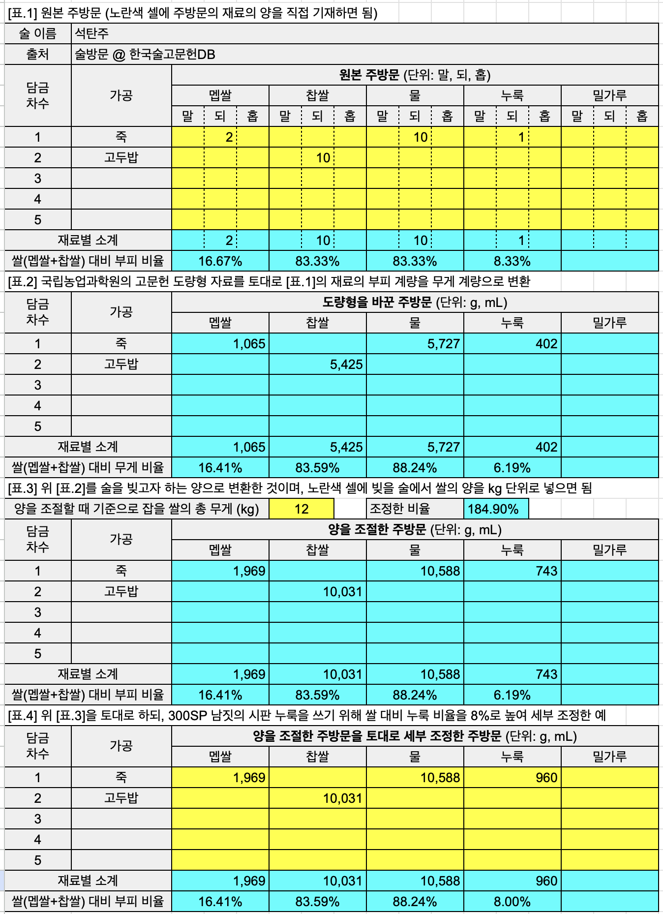 아래 그림은 시트에서 한국술고문헌DB의 술방문 석탄향을 참고하여 주방문을 부피 계량에서 무게 계량으로 바꾸고, 쌀의 양을 12kg로 조정하고, 300SP 남짓의 시판누룩을 쓸 때를 대비해 누룩 비율을 쌀 무게 대비 6.19%에서 8%로 늘린 예다.