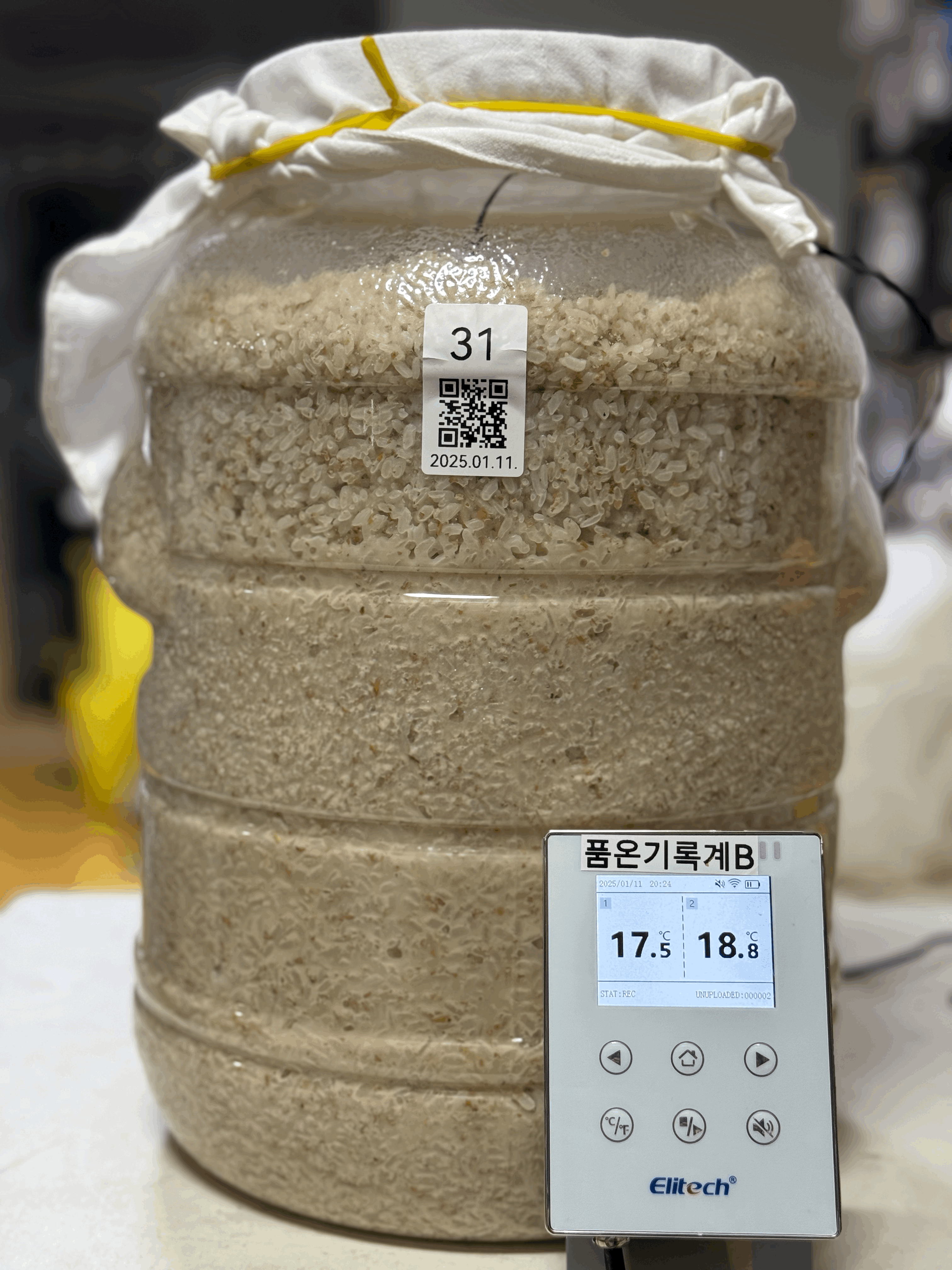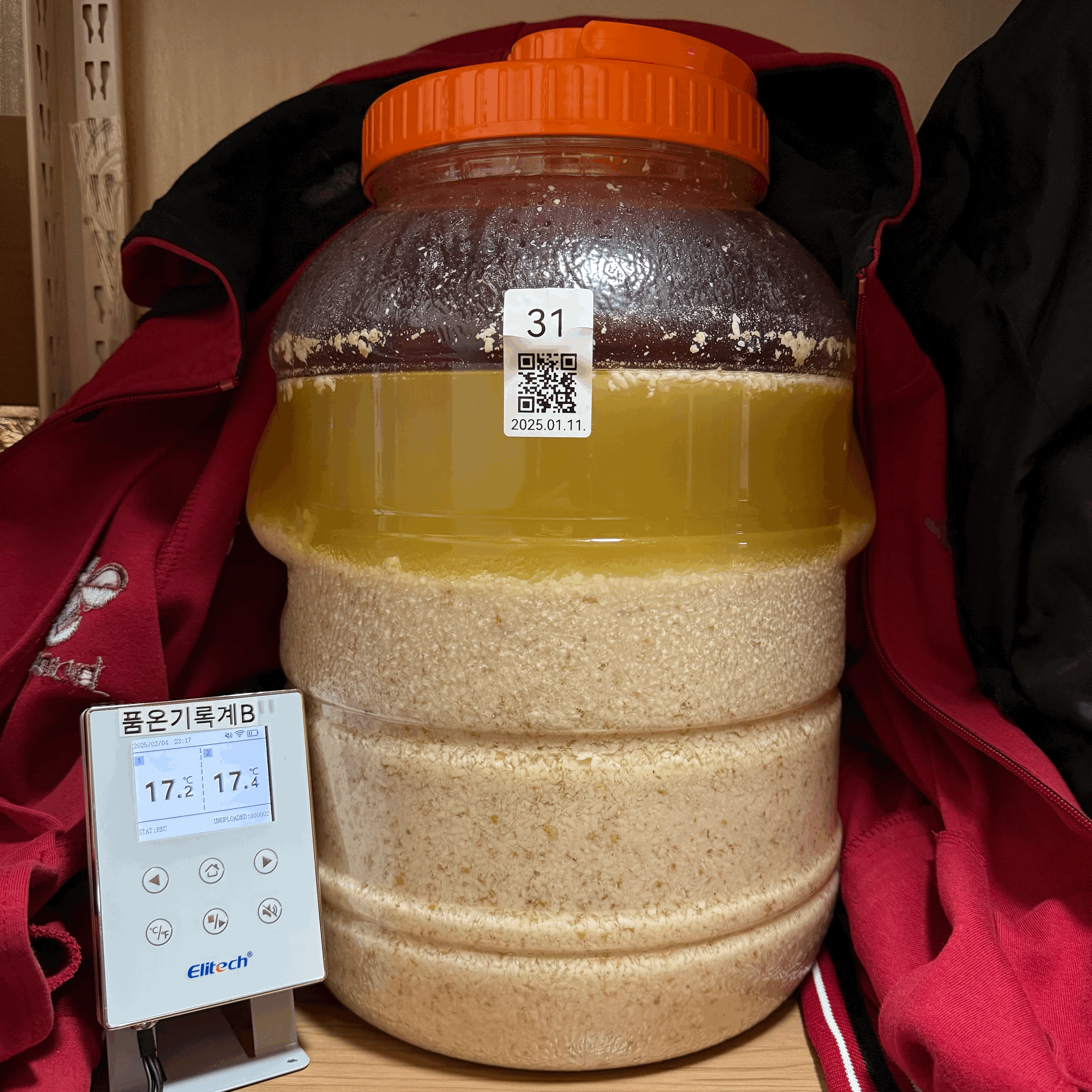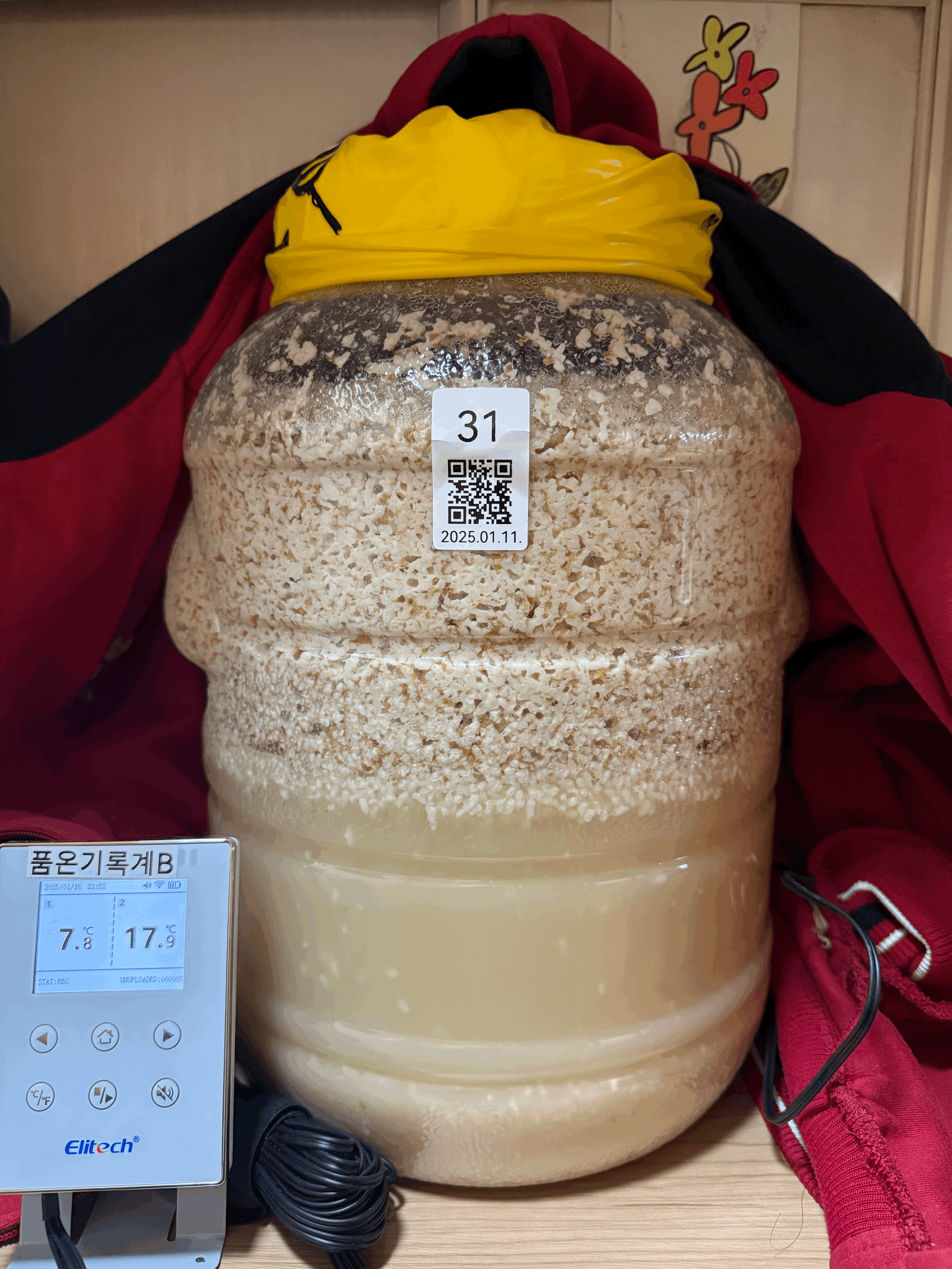 2025.01.11.토.20:20 → 주발효: 품온 17.5℃, 발효공간 온도 18.8℃, 술독 무게 15.26kg