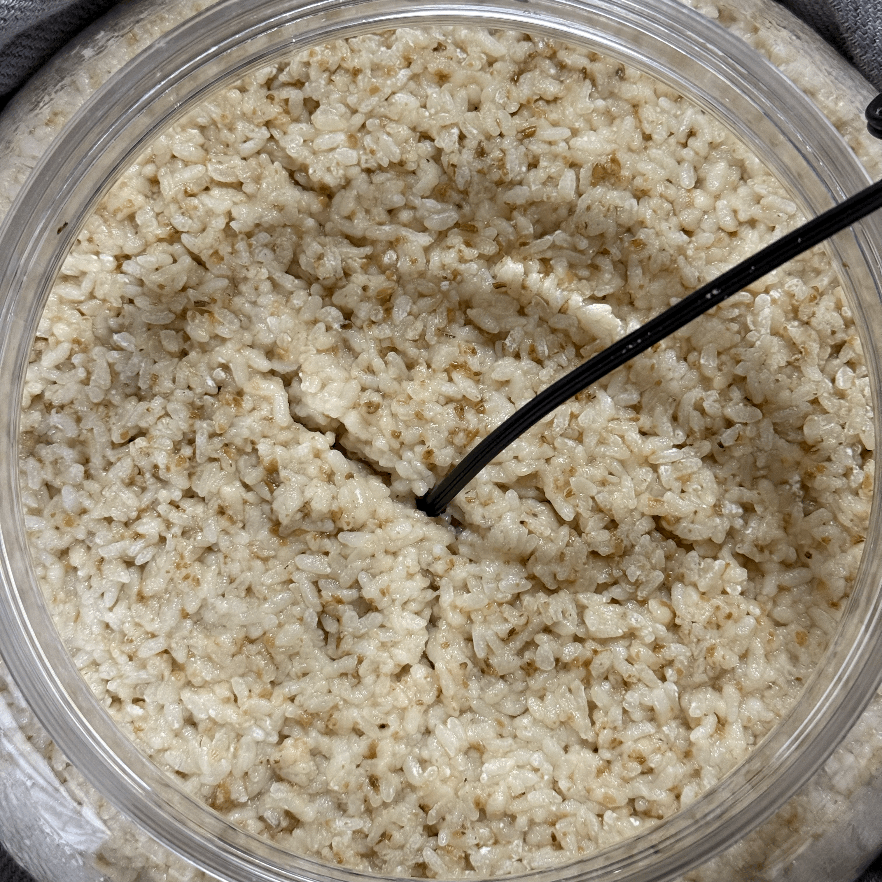 술독 아래쪽을 확인해보니 꽤 많이 당화되어 층분리 된 상태다. 그 위 층은 공기가 잘 통할 것 같지 않을 정도로 고두밥이 뭉쳐 있는 것으로 보인다.
