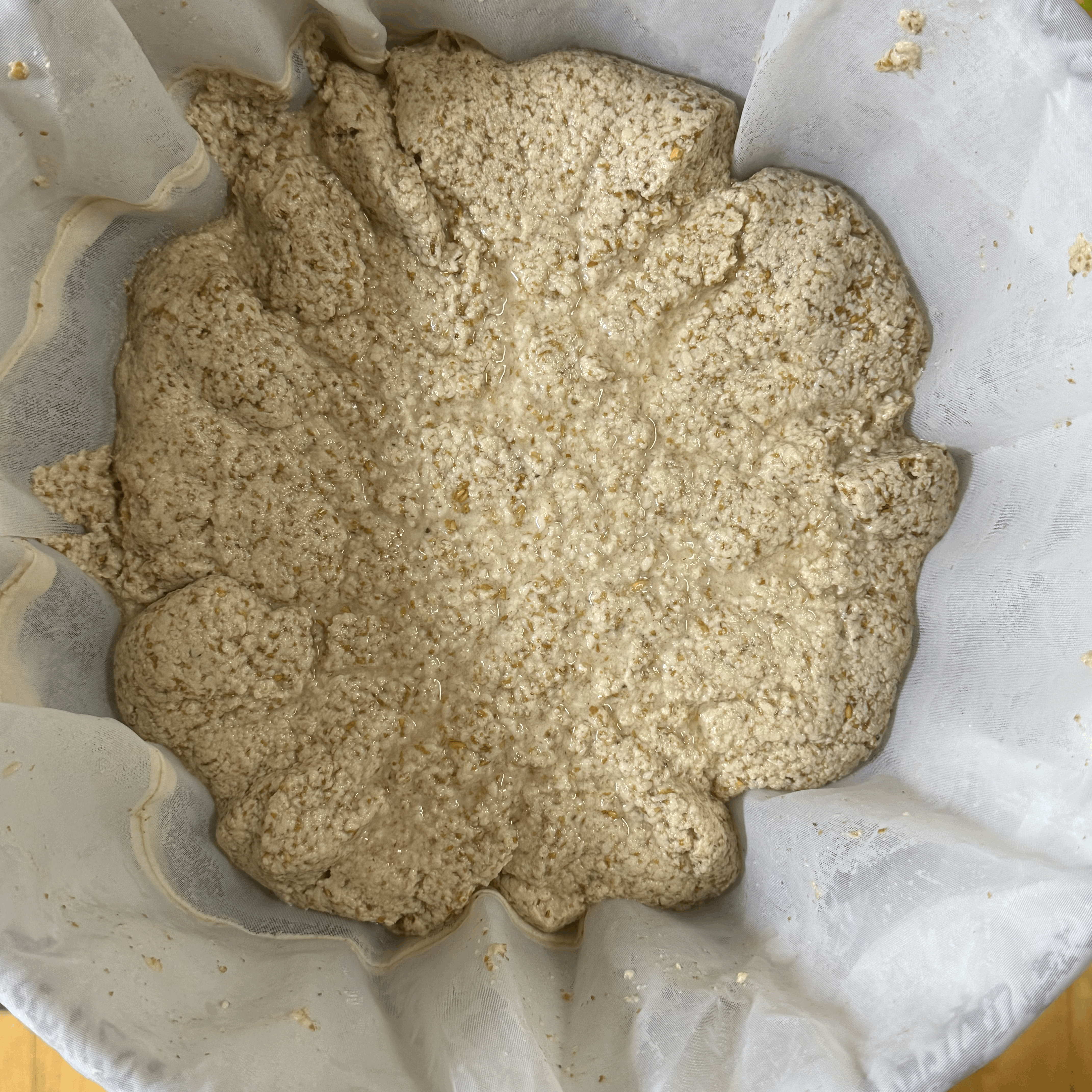 중력에 의해 걸러진 술덧에 아직 수분이 많지만 부피는 상당히 줄었다.
