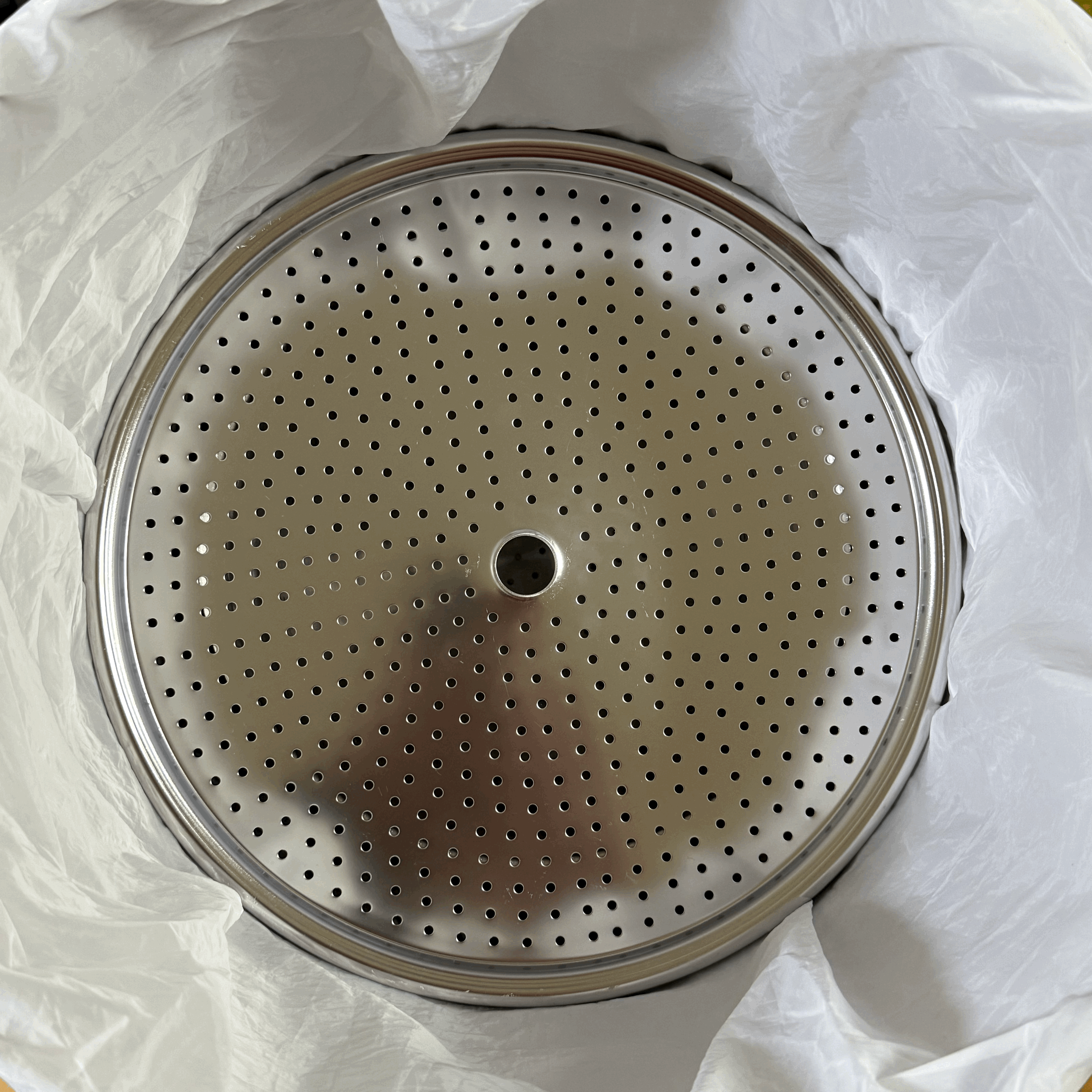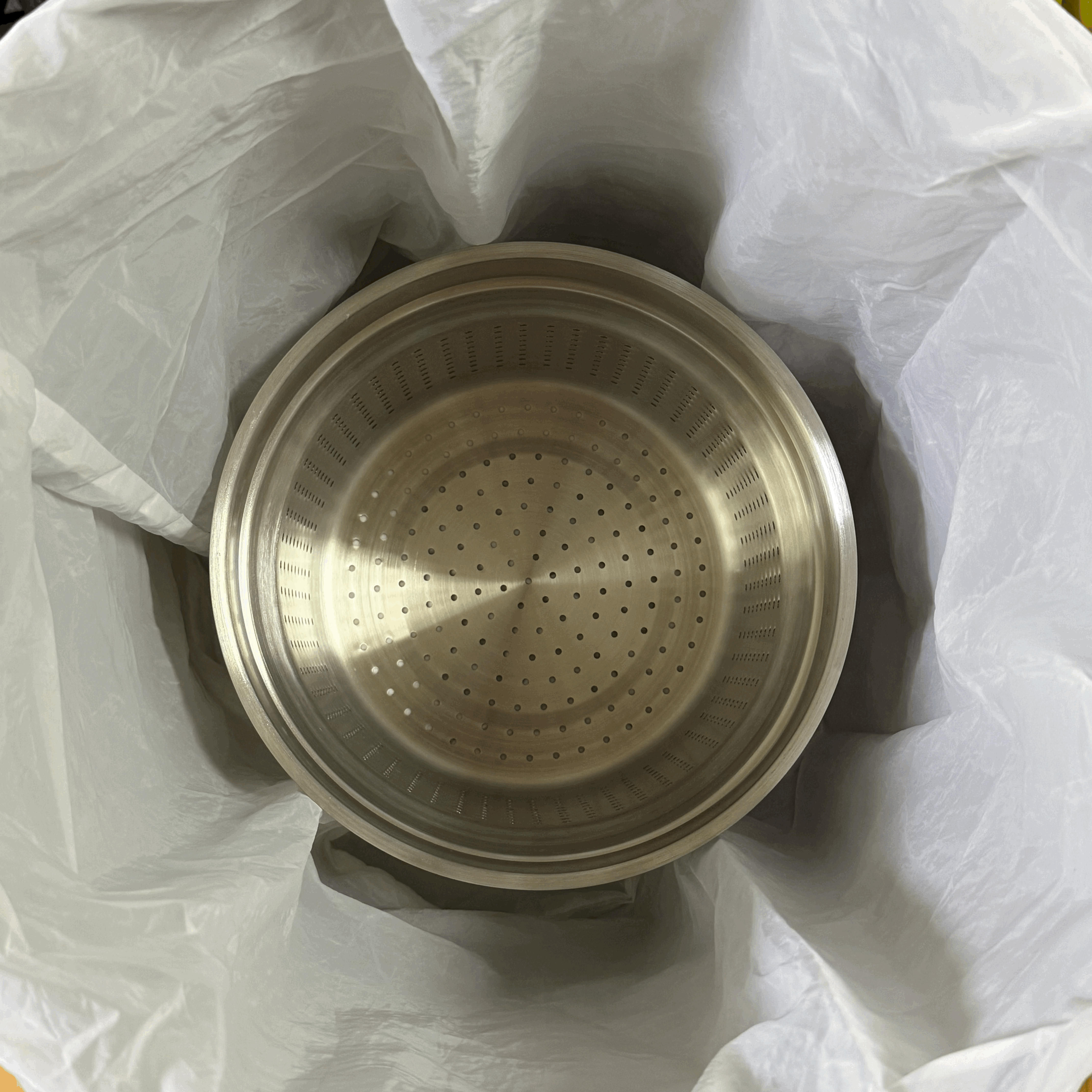 이번엔 술 거르는 도구들을 아래 설명처럼 바닥부터 배치했다. 혹시 거름망을 통해 모세관 현상으로 거름망을 타고 올라와 술덧이 흘러나올까봐 식깡 아래엔 스텐 양푼을 받쳐둠. (거름망 소재가 폴리에스터인데 혐수성이라 그런지 술이 거름망을 타고 식깡을 넘어오지 않아 술이 흘러나오지 않은 것을 확인했으니 다음부터는 안해도 됨.) 다음은 아래 그림에 대한 설명이다. [15] 35L 식깡을 가장 먼저 소독해서 준비한다. [16] 200메쉬 2차 거름망거름망을 식깡 속에 펼쳐 넣은 뒤 거름망 묶은 끈을 식깡 손잡이에 묶어둔다. → 거름망 속에 식깡이 통째로 들어갈 수 있는 사이즈로 주문제작함. (기존에 쓰던 것) → 이번 실험에서 2차 거름망의 용도는 1차 거름망을 통해 자연 여과된 술의 입도를 확인 후 한 번 더 걸러야할 가능성에 대비함. [17] 2차 거름망 위에 18cm 높이의 스텐 찜기 넣음. → 1차 거름망과 2차 거름망 사이를 공간을 띄워주는 역할을 함. [18] 33.5cm 지름의 스텐 찜판 올림. →1차 거름망을 받쳐줄 받침대 [19] 50메쉬 1차 거름망 →거름망 속에 식깡이 통째로 들어갈 수 있는 사이즈로 주문제작함. (기존에 쓰던 것) →1차 거름망을 통해 걸러진 술은 그 아래의 2차 거름망 속으로 모임 [20] 1차 거름망에 술덧을 전부 부어 냄. → 술독을 뒤집어도 떨어지지 않고 술독 바닥에 붙어 있는 잔여물은 절대 손대지 않음. 이후 식깡 뚜껑을 닫고 뚜껑 틈새를 막기 위해 뚜껑 위에 아령을 올려두고눌러줌. 내가 쓰는 도구들 설명은 이 링크 참고: https://dspman.tistory.com/183