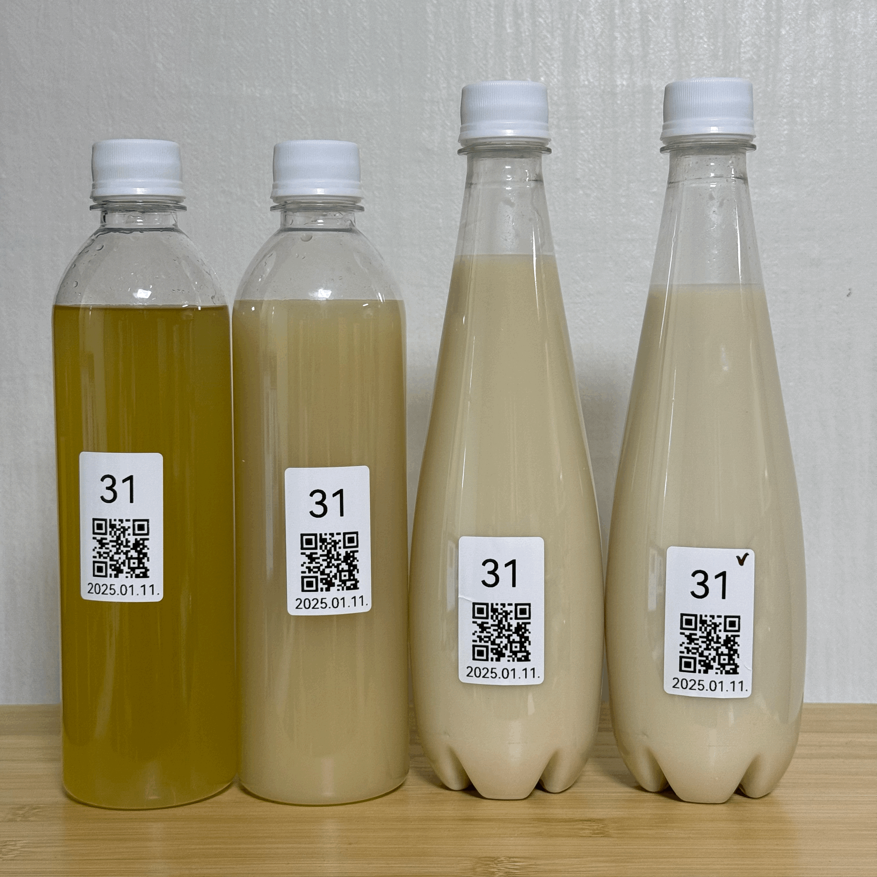 D = C를 거르고 남은 술덧 2kg에 물 1L를 넣고 주물러 짜낸 술. 물을 너무 많이 타서 밍밍하다. 예상한대로 역시 전내기 짜고 나서 남은 지게미에 물 타서 먹는 것은 내 취향엔 그리 적합하지 않다. 다음 부터는 굳이 전내기에 물 타서 짜낸 막걸리 실험은 안해도 될 것 같다. 해오던대로 적당히 먹을만큼만 짜내고 남은 지게미는 버리는 편이 낫다.