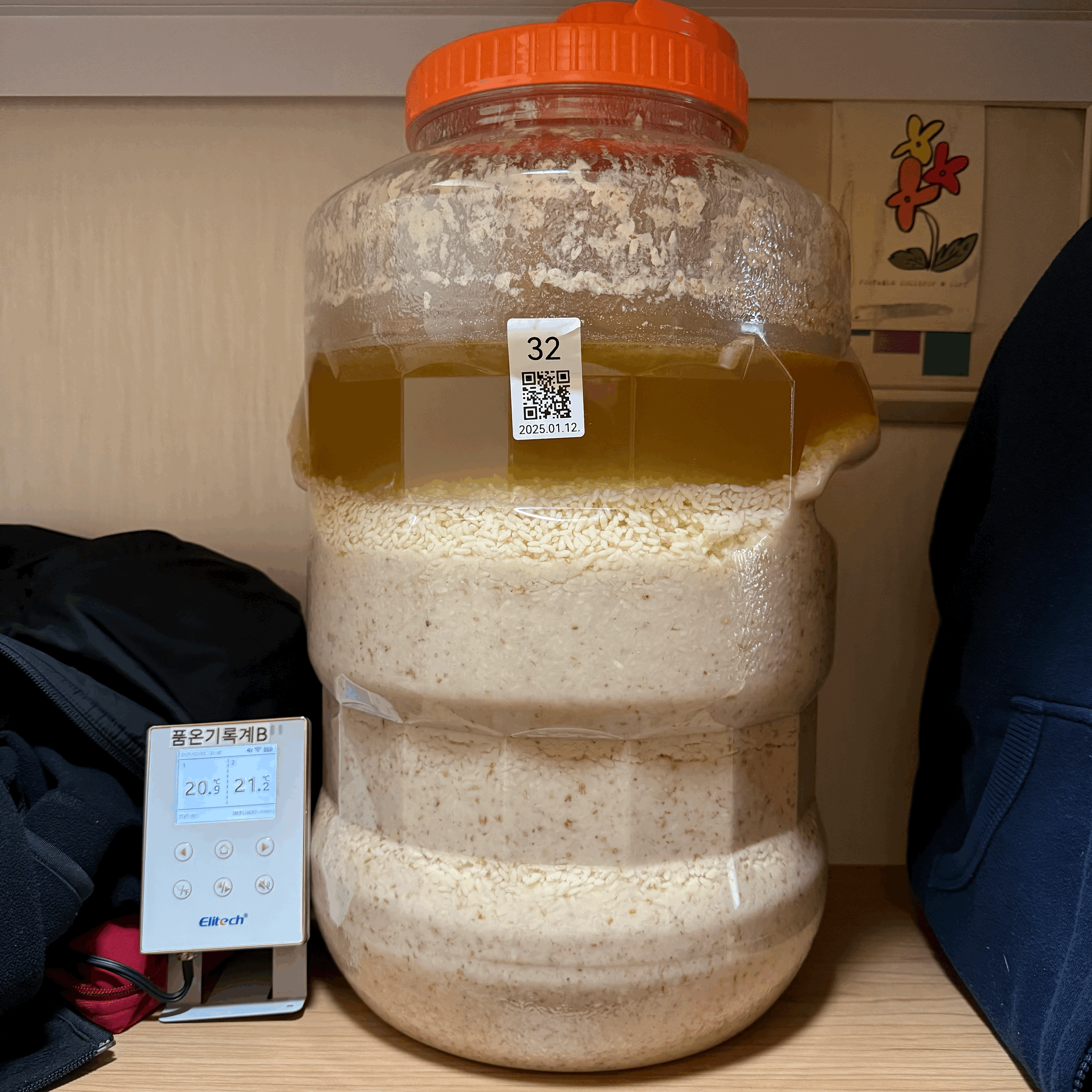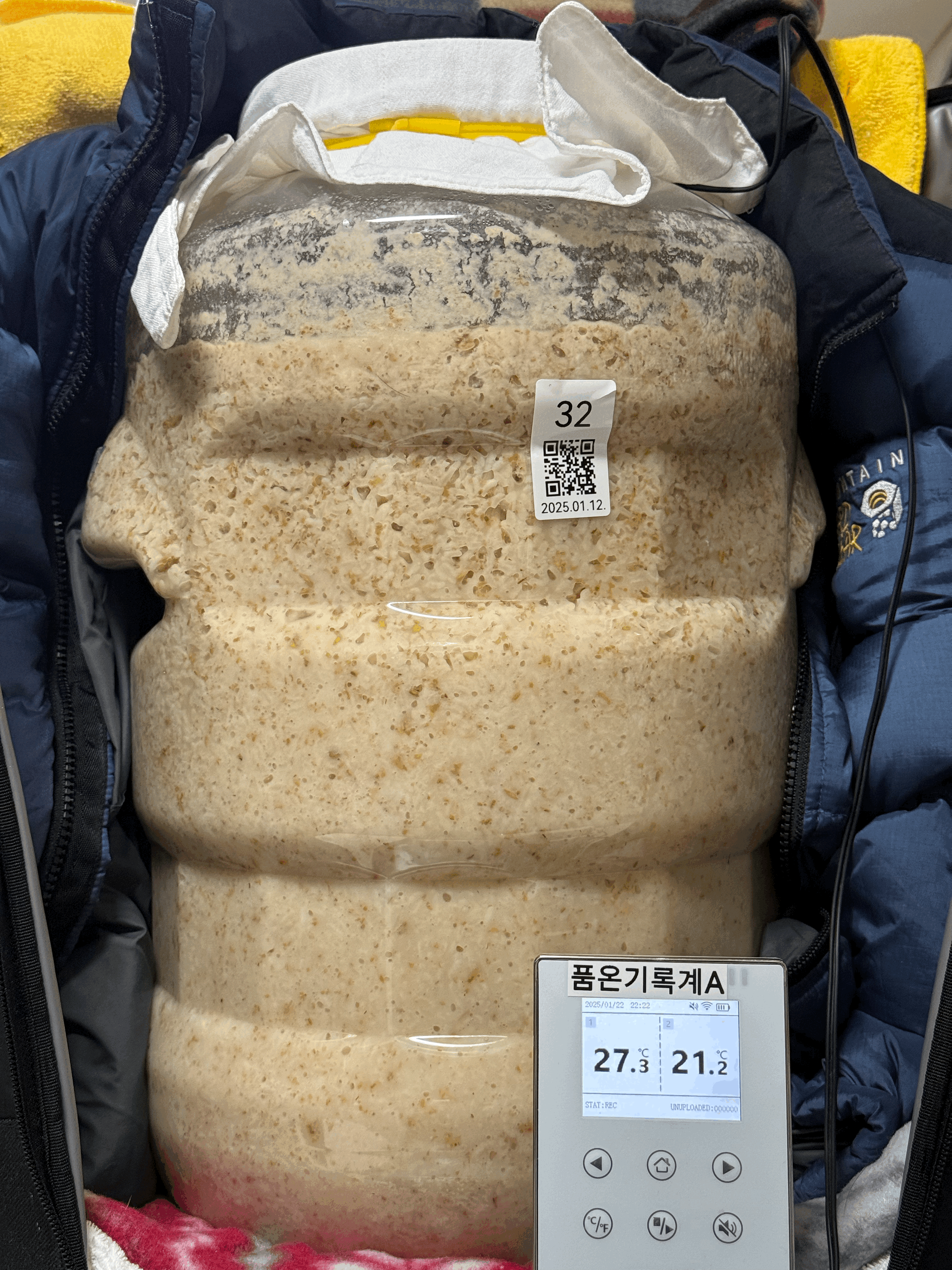 - 2025.01.23.목.11:00 (덧술 +3일 20시간) → 덧술 후발효: 품온 12.2℃, 발효환경 22.0℃, 20.58kg (뚜껑 닫음)