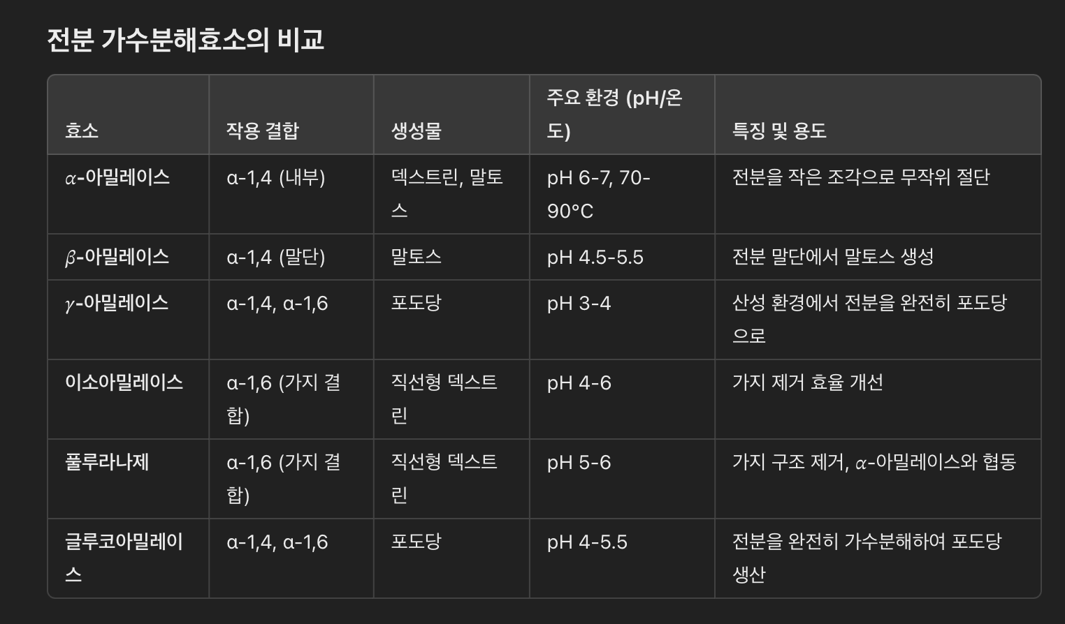 이처럼 각각의 전분가수분해효소들의 역할이 서로 다르고, 재료마다 전분의 구성 성분도 아밀로스와 아밀레이스의 함량이 다르니 재료마다 적합한 효소가 따로 있을 수도 있겠다.