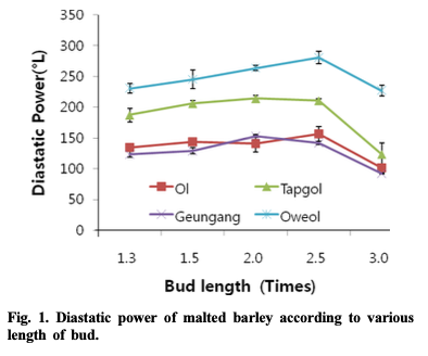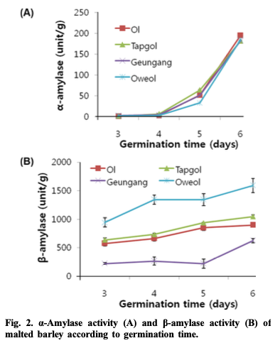 논문에서는 4품종(올보리, 오월보리, 탑골보리, 건강보리)의 보리를 선정하여 싹을 틔우는 길이별 당화력, 싹을 틔우는 날짜별 α-amylase와 β-amylase의 활성도를 측정한 결과를 결과 및 고찰에서 설명하고, 표에서 요약하였다.