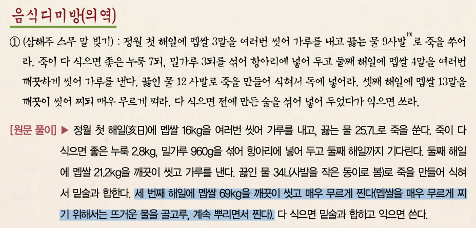 원 주방문엔 "백미 5말을 백 번 씻어 물에 하룻밤 담갔다가 충분하게 쪄내고 따뜻할 때 독에 넣고 완전히 밀봉한다."라 설명하고 있다.
