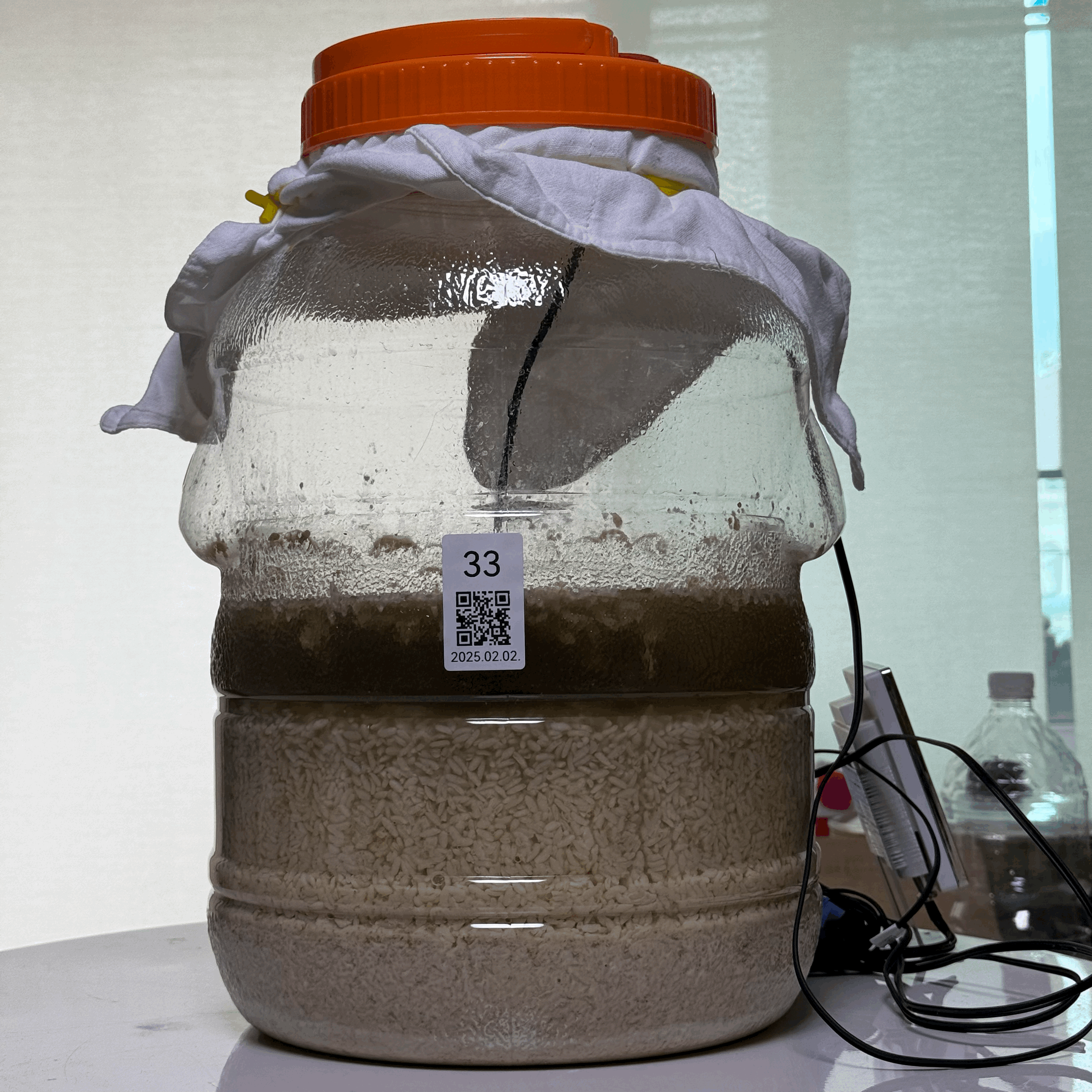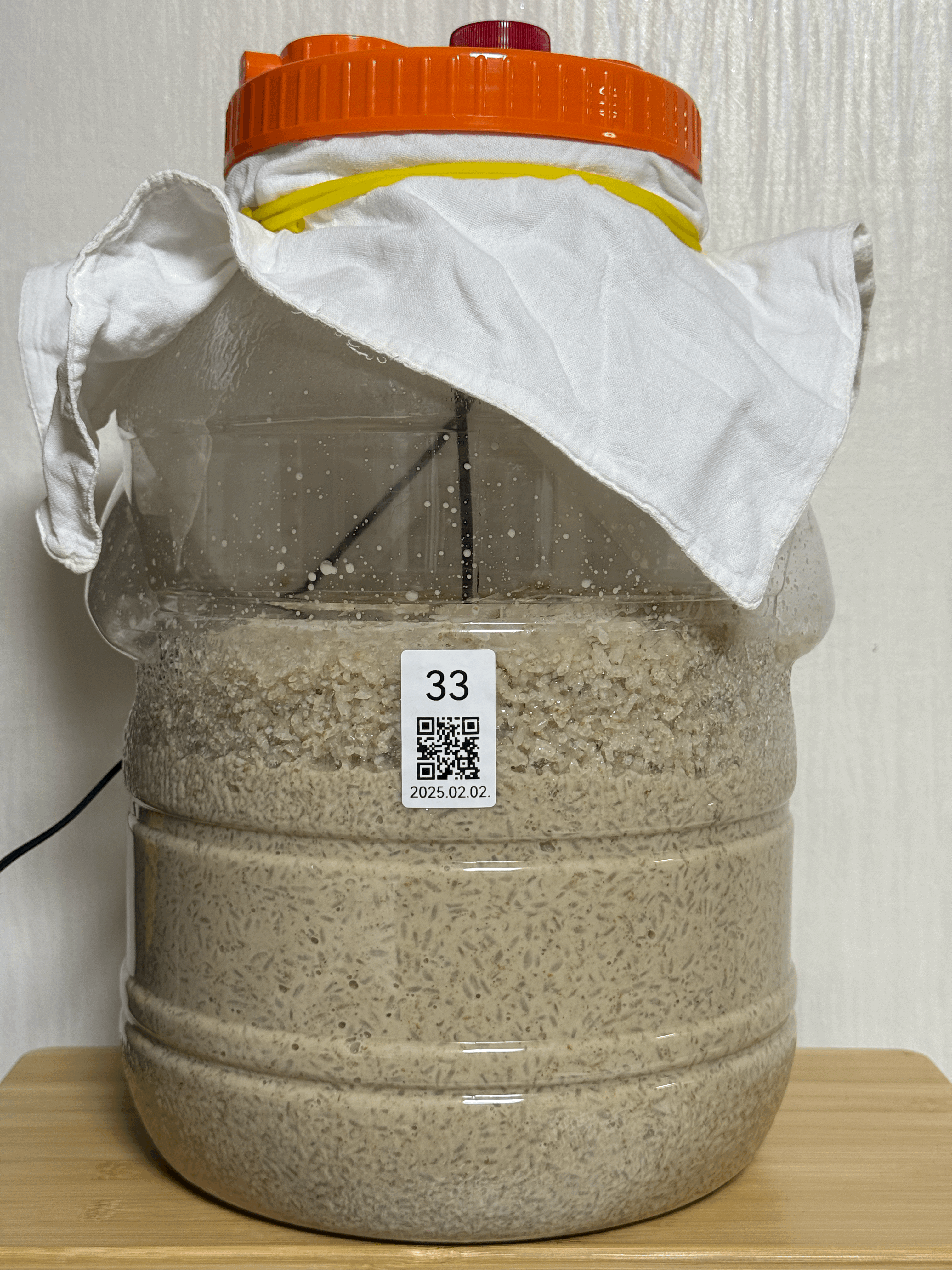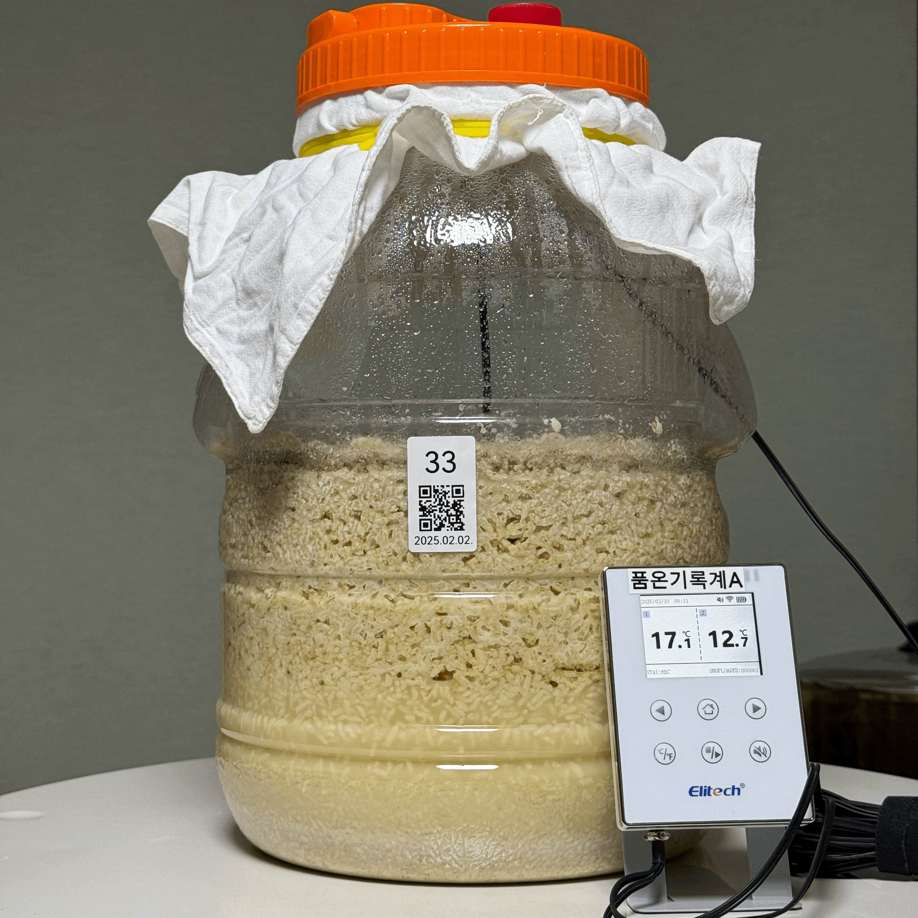 - 2025.02.17.월.22:30 (수곡 +2주 1일 6시간반) → 밑술 발효: 품온 34.7℃, 발효공간 25.0℃, 술독무게 10.09kg