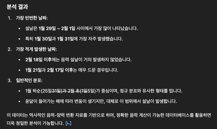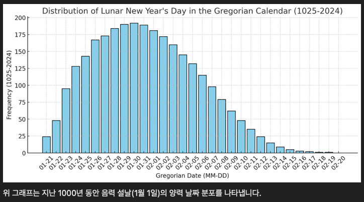 좀 더 객관적인 데이터를 기반으로하여 일정을 잡기 위해 ChatGPT에게 지난 1000년 동안 음력 설날의 양력 날짜 분포 통계를 요청하여 다음과 같은 답변을 받았다.