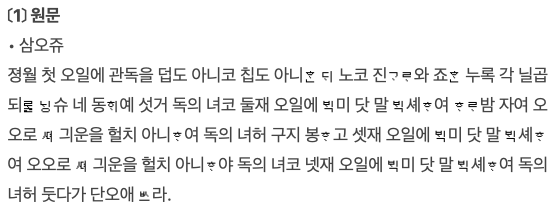 [참조.2]의 여러 삼오주 주방문 중 음식디미방(규곤시의방)에서 고두밥 만으로 빚는 아래 [그림.1]의 삼오주를 선택했다.
