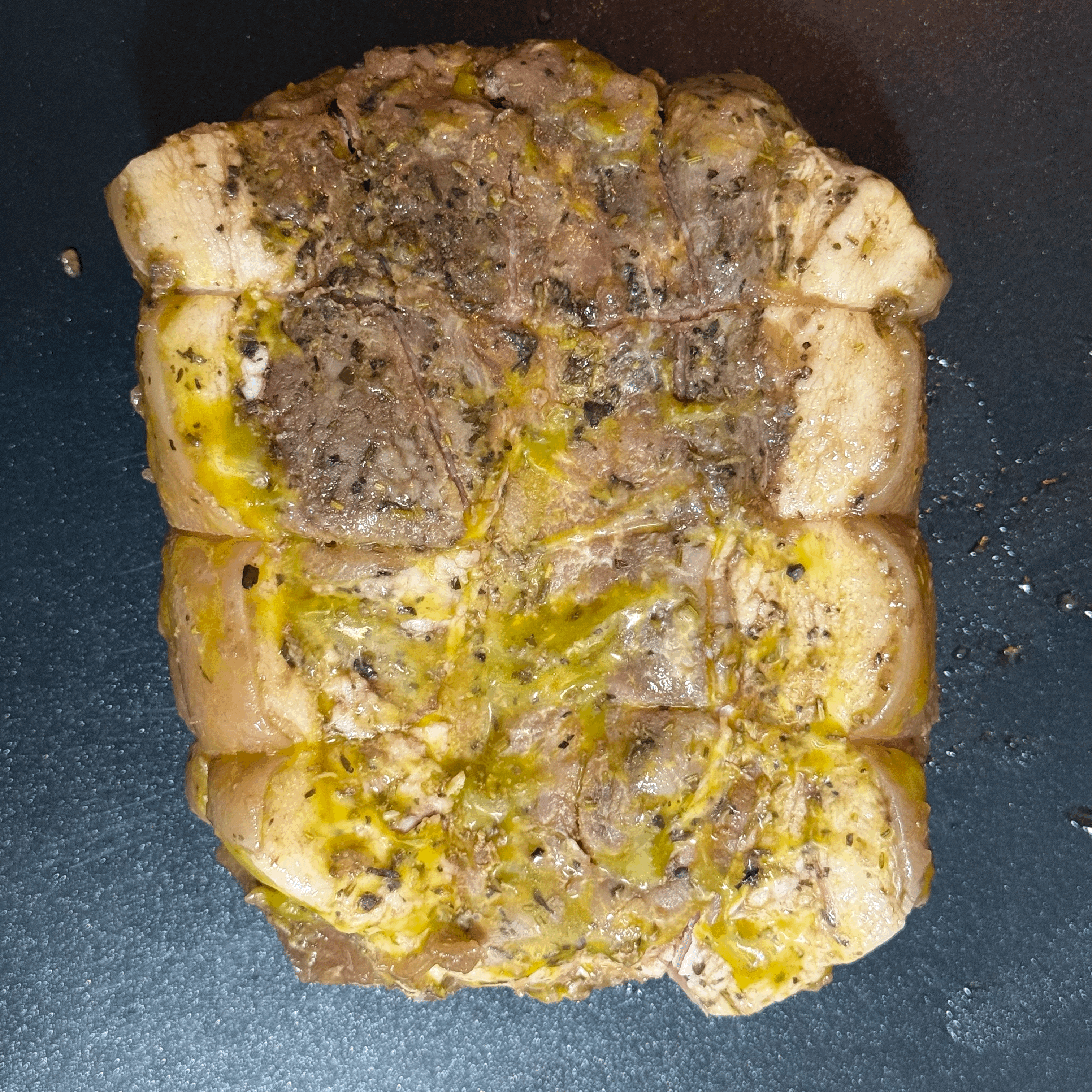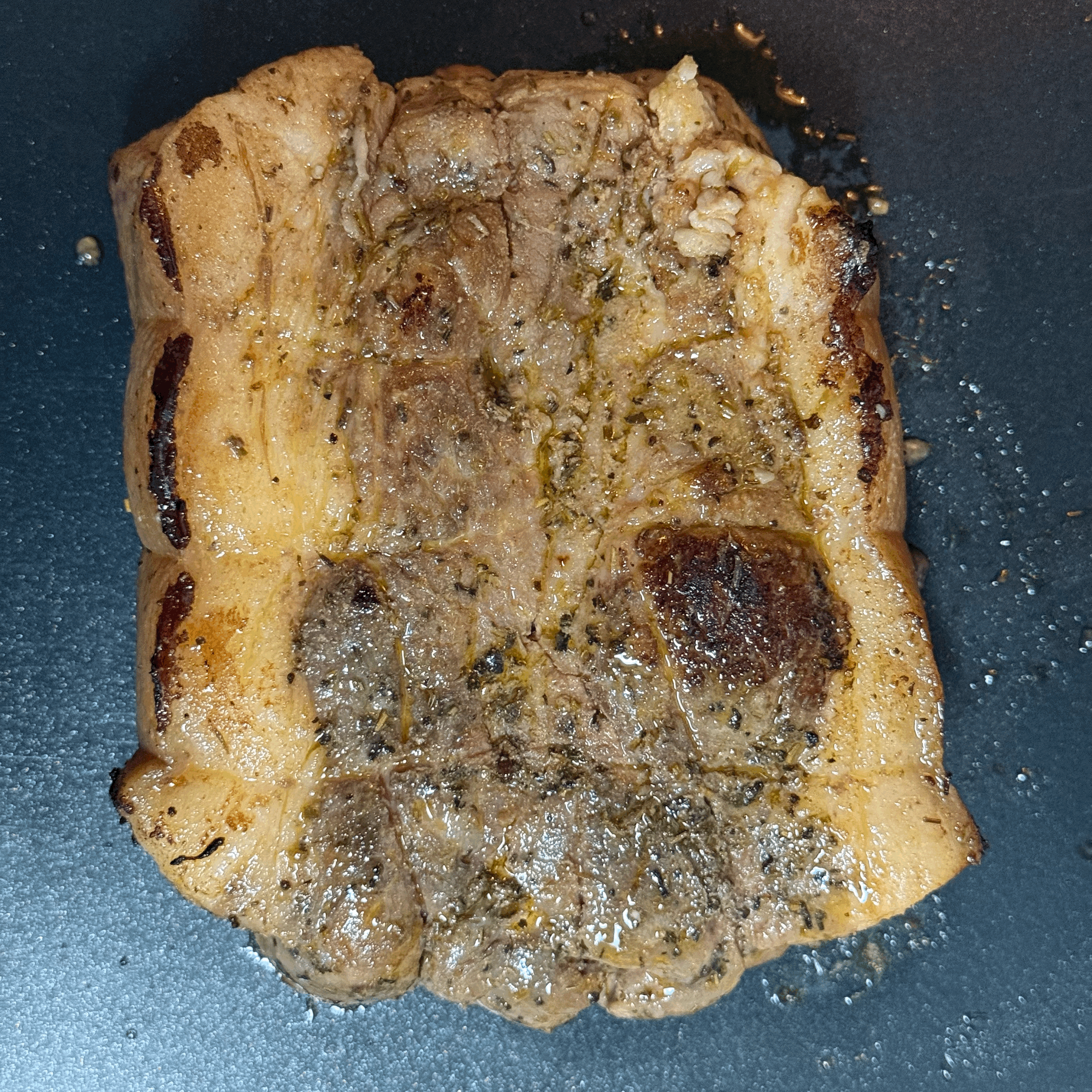 겉면에 마이야르 현상이 생겨 갈색으로 익으면 불을 낮추고 버터, 오레가노, 타임을 넣고 베이스팅하며 향을 입힌다.