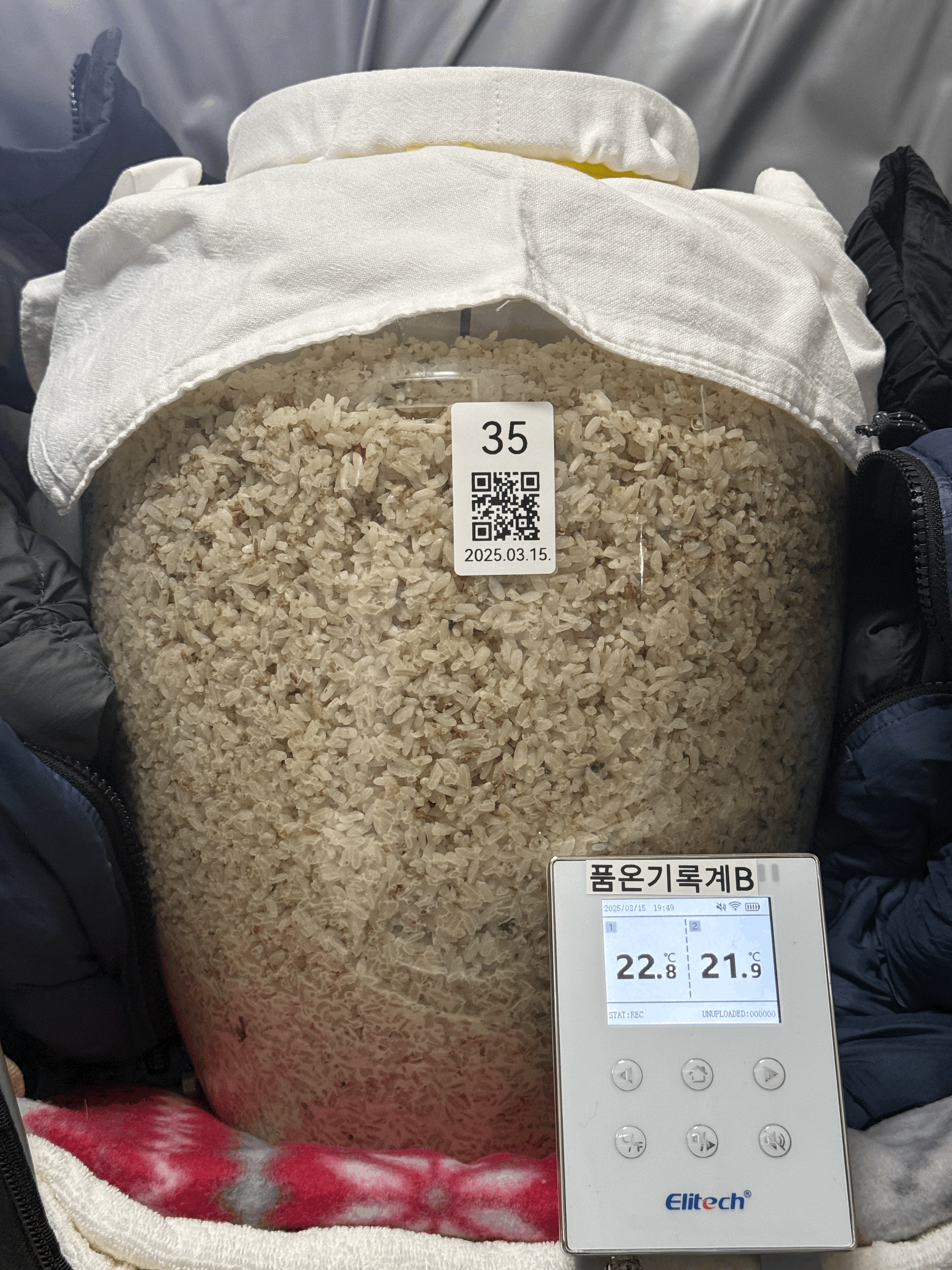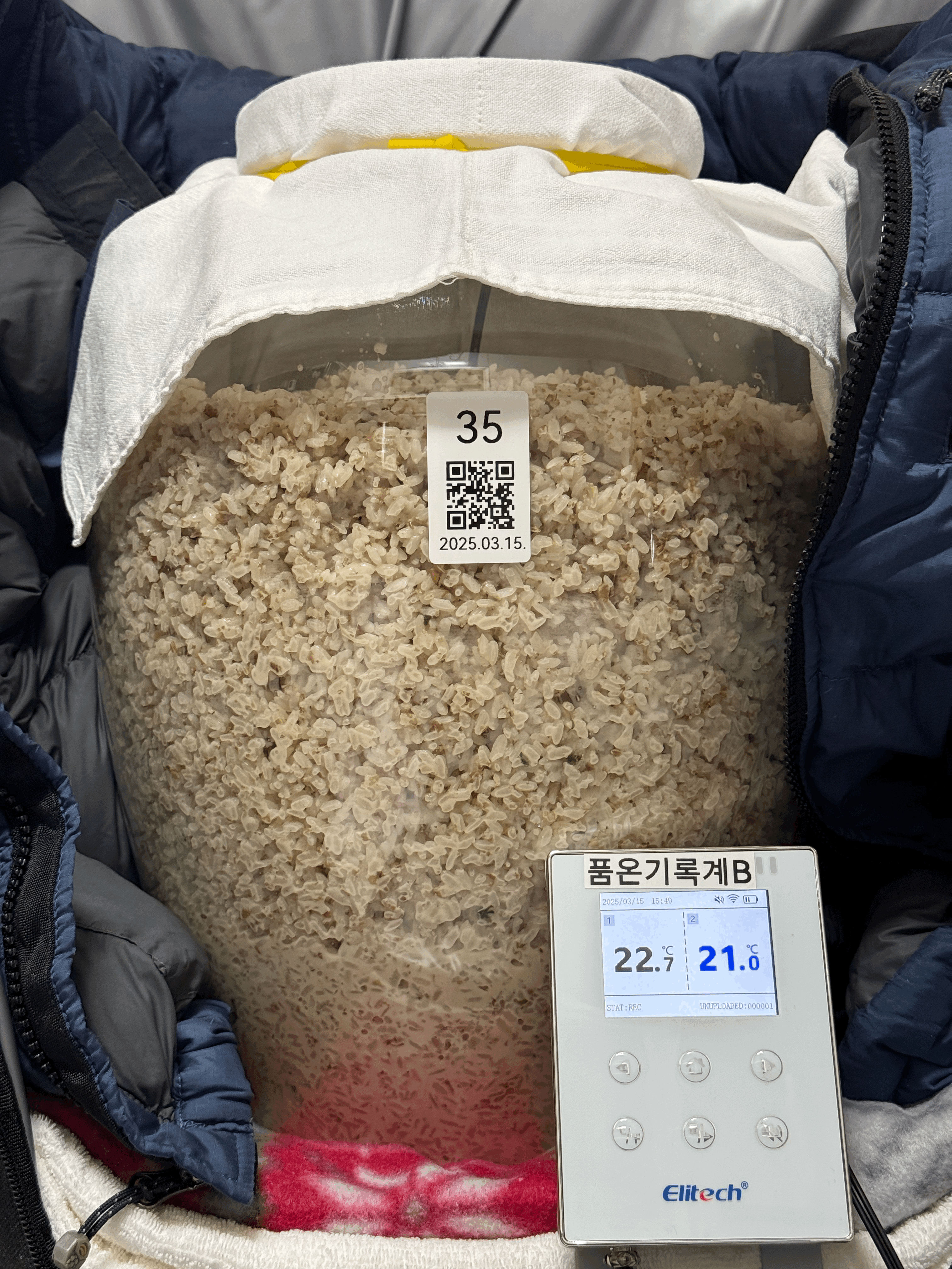 고두밥의 중심부 품온은 30℃ 수준으로 식혀 쓴다. 고두밥의 주변부 품온은 중심부보다 더 낮을테고, 실온의 수곡, 실온의 생수(2.5L)와 고두밥을 함께 섞으면 결국 술덧의 품온은 더 식어 25℃ 전후로 식을 것이다. 참고로, 우리 집의 요즘 실온은 21~23℃ 수준이다.