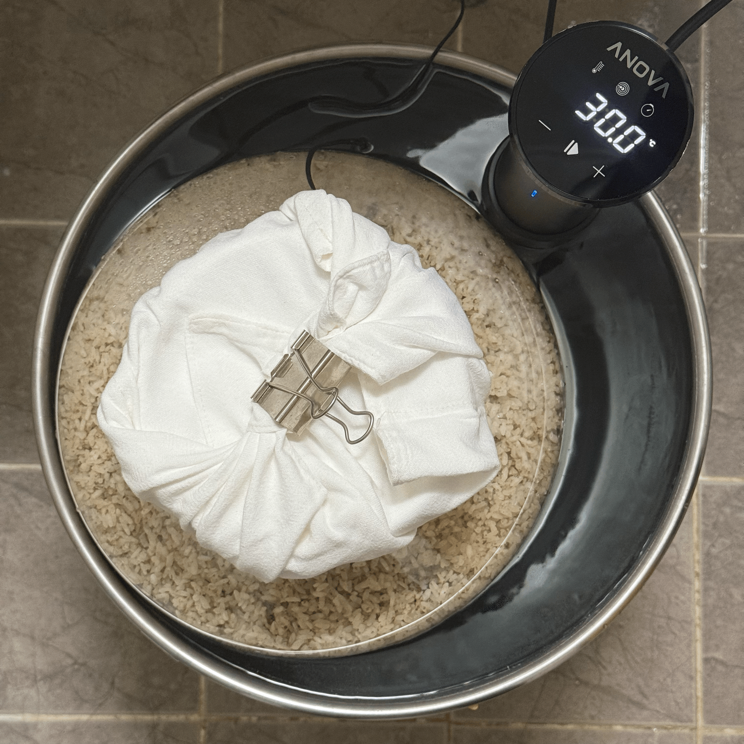 이번 술은 수비드 머신으로 가열하여 당화를 촉진하는 실험을 진행했다. 모 양조장 대표님께서도 조언을 해주실 때 술덧을 안칠 땐 18℃ 수준에 맞춰 안치되, 보쌈해서 발효시켜 죽은 24시간, 범벅은 36시간, 고두밥은 48시간에 맞춰 술덧의 품온이 35도에 도달하도록 하여 발효시켜보라 하셨다. 이 때 발효 공간의 실내온도가 25℃보다 낮을 때는 술독 바닥에 전기장판을 켜놓고 보쌈 속을 데워주는 것이 도움이 될 것이라 하셨다. 나는 여태 술을 발효시키면서 술에 인위적으로 열을 가한 적은 없었지만, 이번 술은 별로 기대되지 않는 술이라 실험적으로 가열해봤다. 이번 술은 가열하지 않은 채 보쌈하여 22℃쯤에서7시간 동안 발효시킨 뒤, 수비드 머신으로 가열하여 30℃쯤에서 10시간 동안 발효시킨 뒤, 다시 가열하지 않은 채 보쌈하여 7시간 동안 발효시켰다.