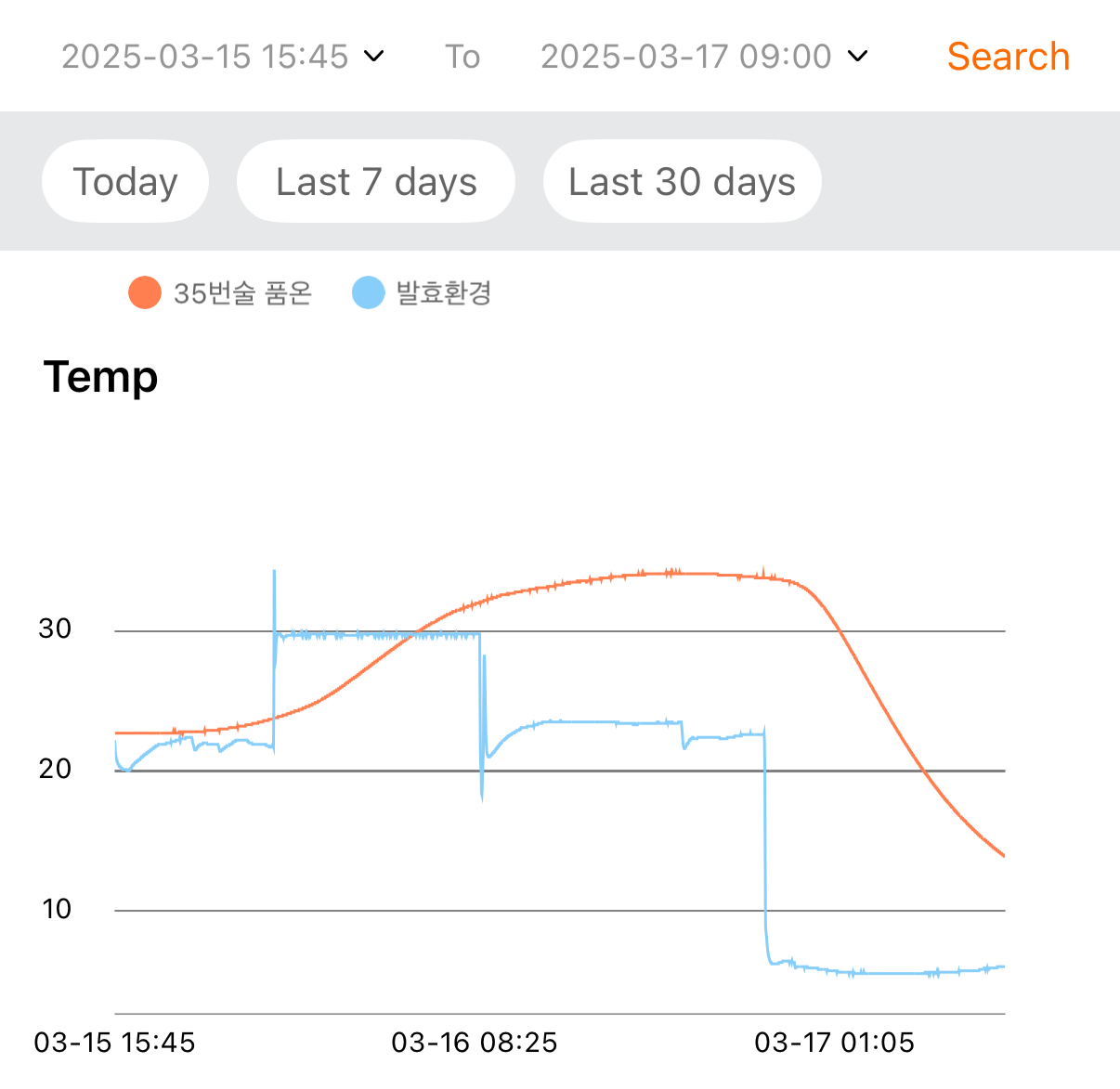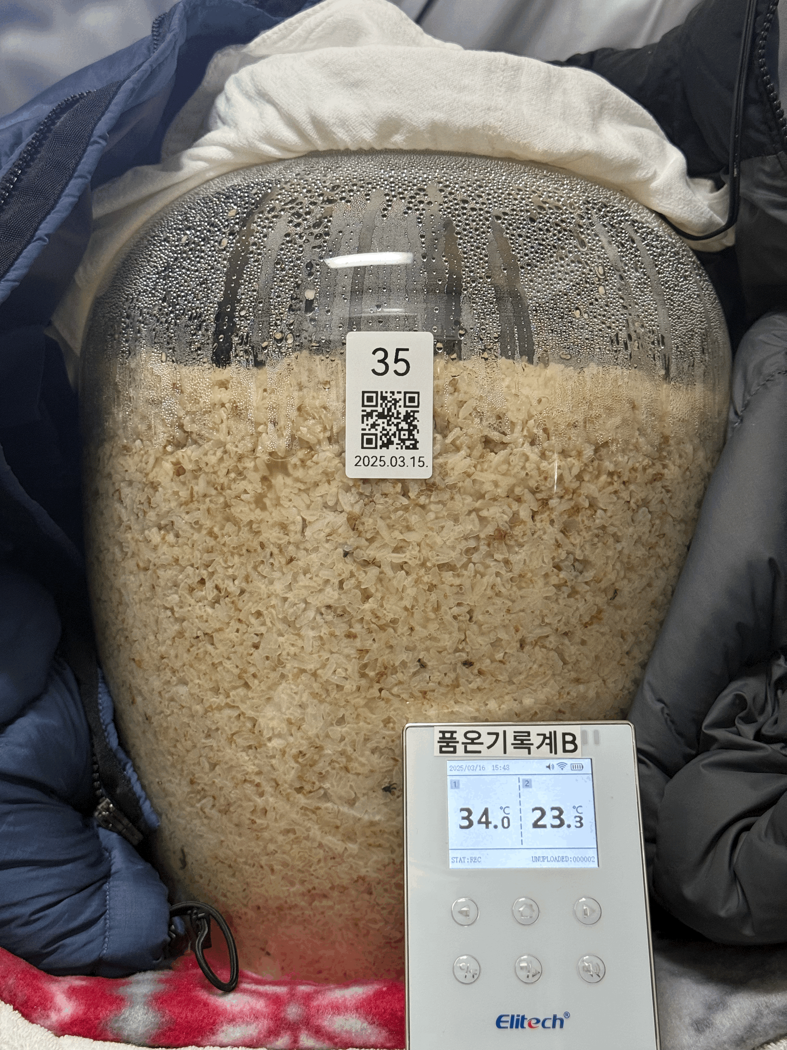 24시간만에 22.7℃에서 시작한 품온이 34.0℃까지 올랐다. 술덧 중심부 품온이 35℃에 도달하면 냉각시켜주려고 알람을 맞춰뒀다. 이 추세라면 술 안친지 36시간이 채 되기도 전에 냉각시킬 것 같다. 혹시 지연된다면 내일 아침에 냉각시킬 수도 있을 듯 하다. 이렇게 되면 품온이 오르기 전 기간이 비교적 짧아 효모가 증식할 시간이 비교적 부족할테니 이번 술은 효모의 개체 수가 모자라서 알코올 도수가 좀 낮게 나오지 않을까 싶다.
