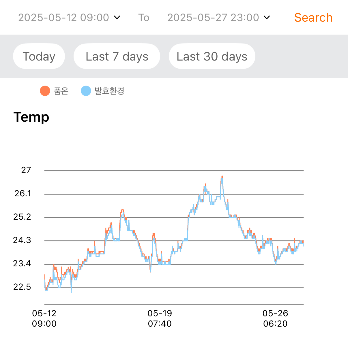 품온 28.0℃, 발효공간 23.2℃