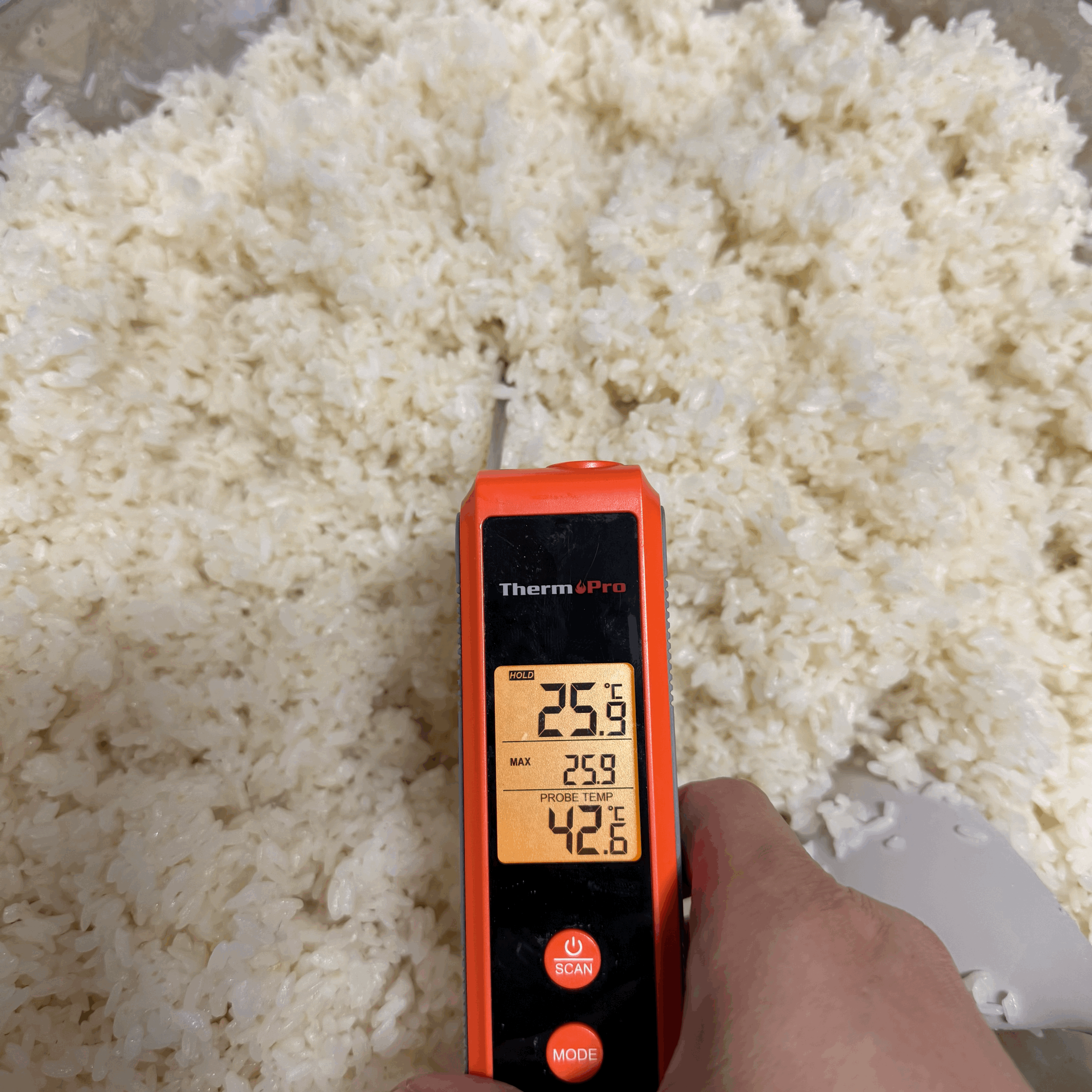 고두밥 품온이 36℃ 쯤 됐길래 슬슬 술덧 치댈 준비를 한다.