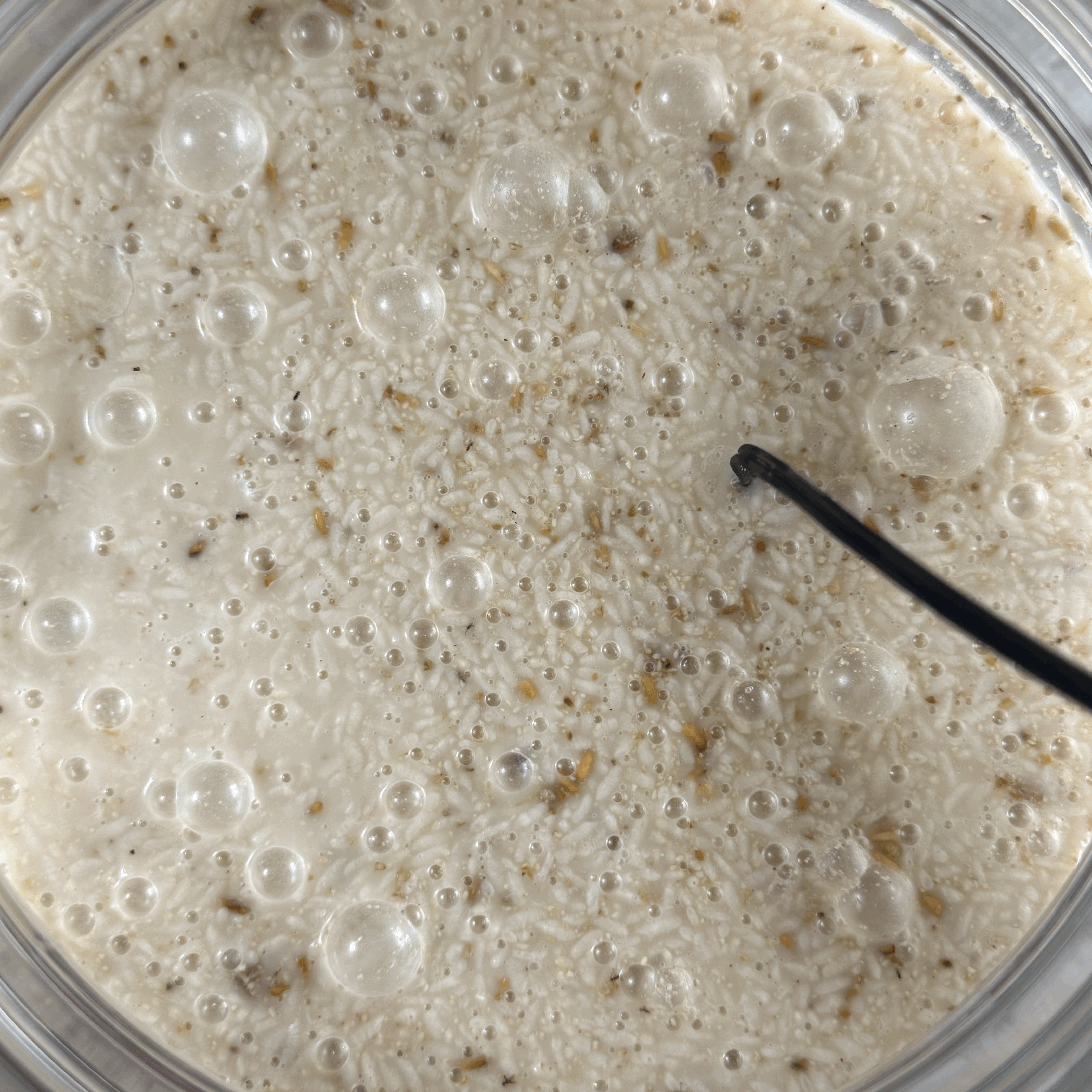 집안에 풋사과향(아세트알데히드)이 가득하다. 술덧 표면을 보니 알코올 향도 난다. 술덧 표면은 꽤나 꾸덕하지만, 저어줘야할 정도로 건조해 보이지는 않는다. 술 끓는 소리도 아침보다 활발하다.