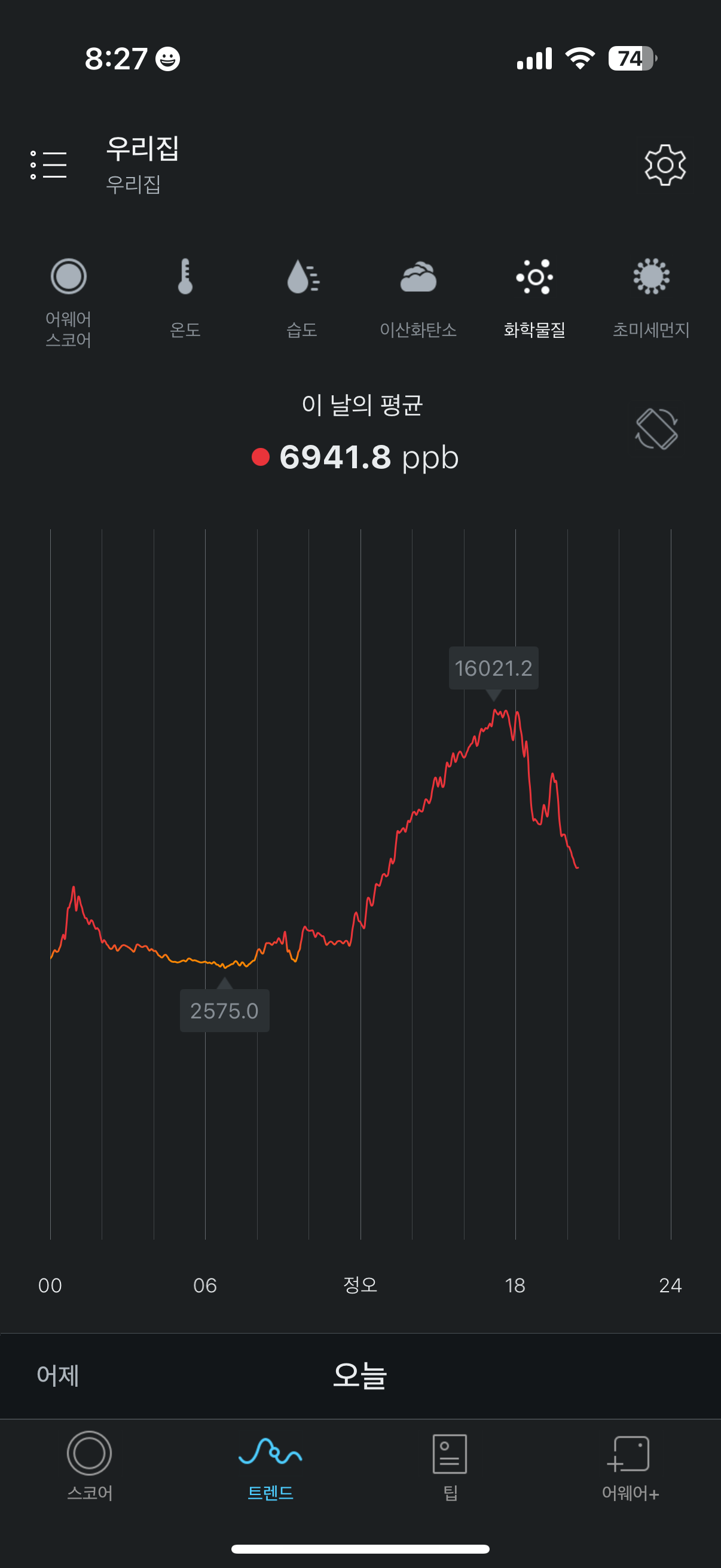 아래 [그림.31]~[그림.34]는 각각 실내공기측정기로 기록된 온도, 습도, 이산화탄소 농도, VOC 농도다. 이산화탄소 농도는 아침에 출근 후급격이 하락했고, 오후에 다시 급격히 올랐다가 18시쯤 부터 다시 하락하고 있다. VOC 농도는 이산화탄소 농도가 급격히 증가하기 직전부터 급격히 오르다가 18시쯤부터 이산화탄소 농도와 함께 다시 하락하고 있다. [그림.35]를 보면, 실외 습도는 오히려 저녁에 더 높은데도 불구하고 실내 습도는 오히려 18시쯤 부터 하락하고 있다. 18시 쯤에 윗막지가 굳어 이산화탄소와 VOC가 술독에서 배출되지 못해서 농도가 낮은 상태인건지, 오후엔 실내와 실외의 기온 차이가 크지 않아 환기가 원활하지 않다가 저녁 되면서 환기가 잘 되어 농도가 낮아진 것인지는 이 데이터들 만으로는 단정지을 수 없을 것 같다. 오늘 밤 귀가하면 확인해봐야할 것 같다.