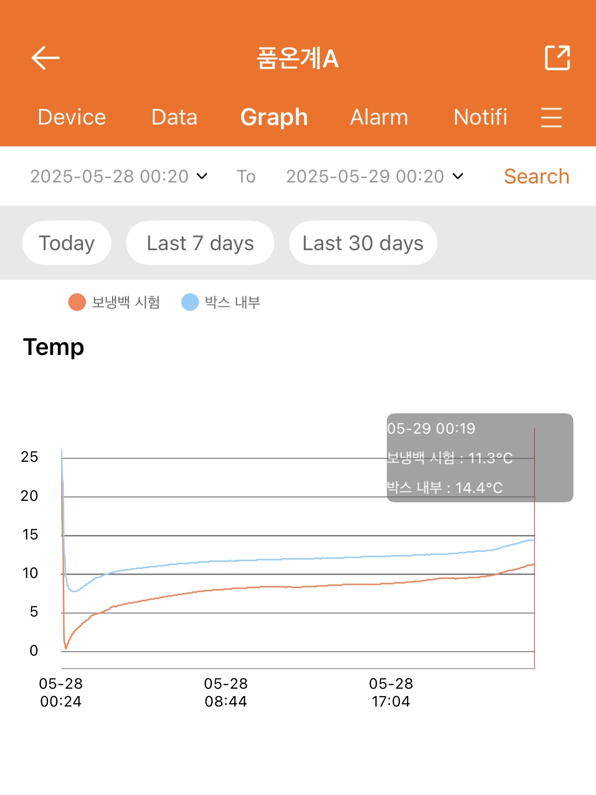 - 박스를 닫은 후 약 30분 후 최저온도인 11.2℃에 도달.