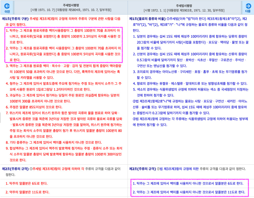 제1조 주세법 제4조의 규정에 의하여 각 주류의 종류의 구분을 다음과 같이 정한다. 1. 탁주라 함은 곡류 기타 전분을 함유하는 물료와 그 원료곡류(粒麴을 包含한다) 총량의 백분의 10이상의 국자, 입국 또는 효모 및 물을 원료로 하여 발효시킨 주료를 여과하지 아니하고 제성한 것을 말한다. 단, 원료 곡류중 백미 사용량은 그 총량중 백분의 70을 초과하지 못한다. 2. 약주라 함은 곡류 기타 전분을 함유하는 물료와 그 원료곡류(粒麴을 包含한다) 총량의 백분의 10이상의 국자, 입국 또는 효모 및 물을 원료로 하여 발효시킨 주료를 여과하여 제성한 것을 말한다. 단, 원료곡류중 백미 사용량은 그 총량중 백분의 70을 초과하지 못한다. ... (중략) ... [전문개정 1961ㆍ12ㆍ30] |