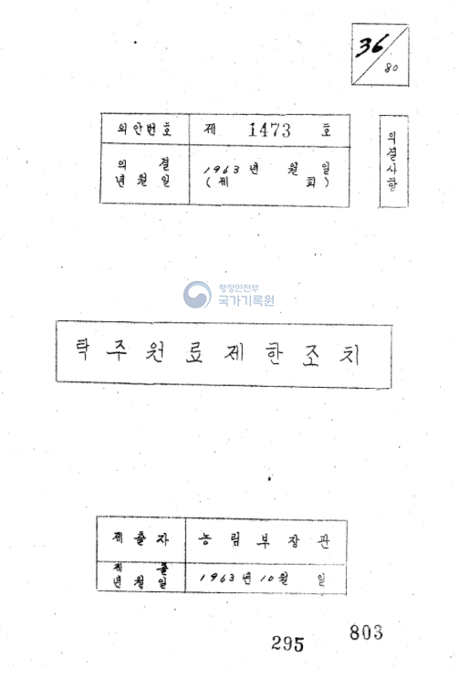 "제15차 각의(1963.2.22.)에서 의결된 1963.3.1부터 1963.12.31까지 탁주원료로서의 백미사용 금지 조치는 별도 농림부장관의 지시 있을 때까지 신년도에도 계속 금지한다."