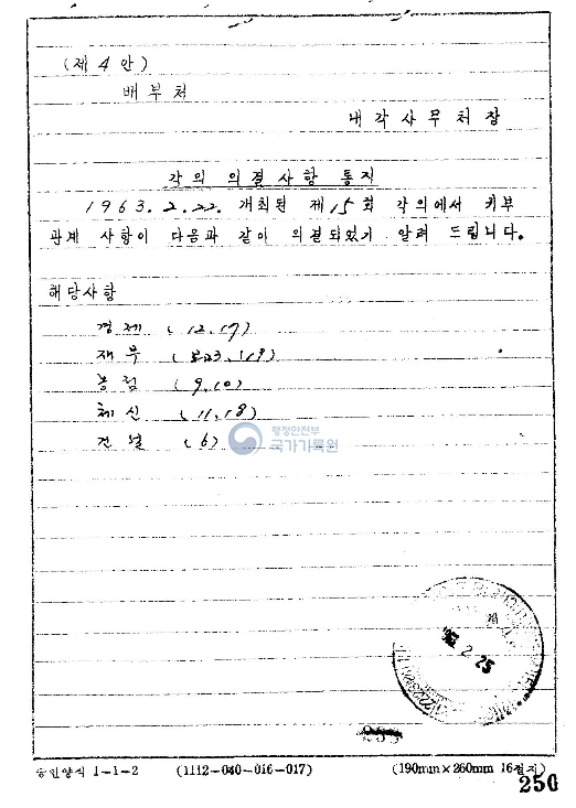 위 [참조.14], [참조.15]와 같이 1963년 2월 22일에 재무부의 안건이 각의에서 의결된 이후 이 안건은 [참조.19]와 같이 당해 92회, 95회, 97회 각의에서도 논의되었다.