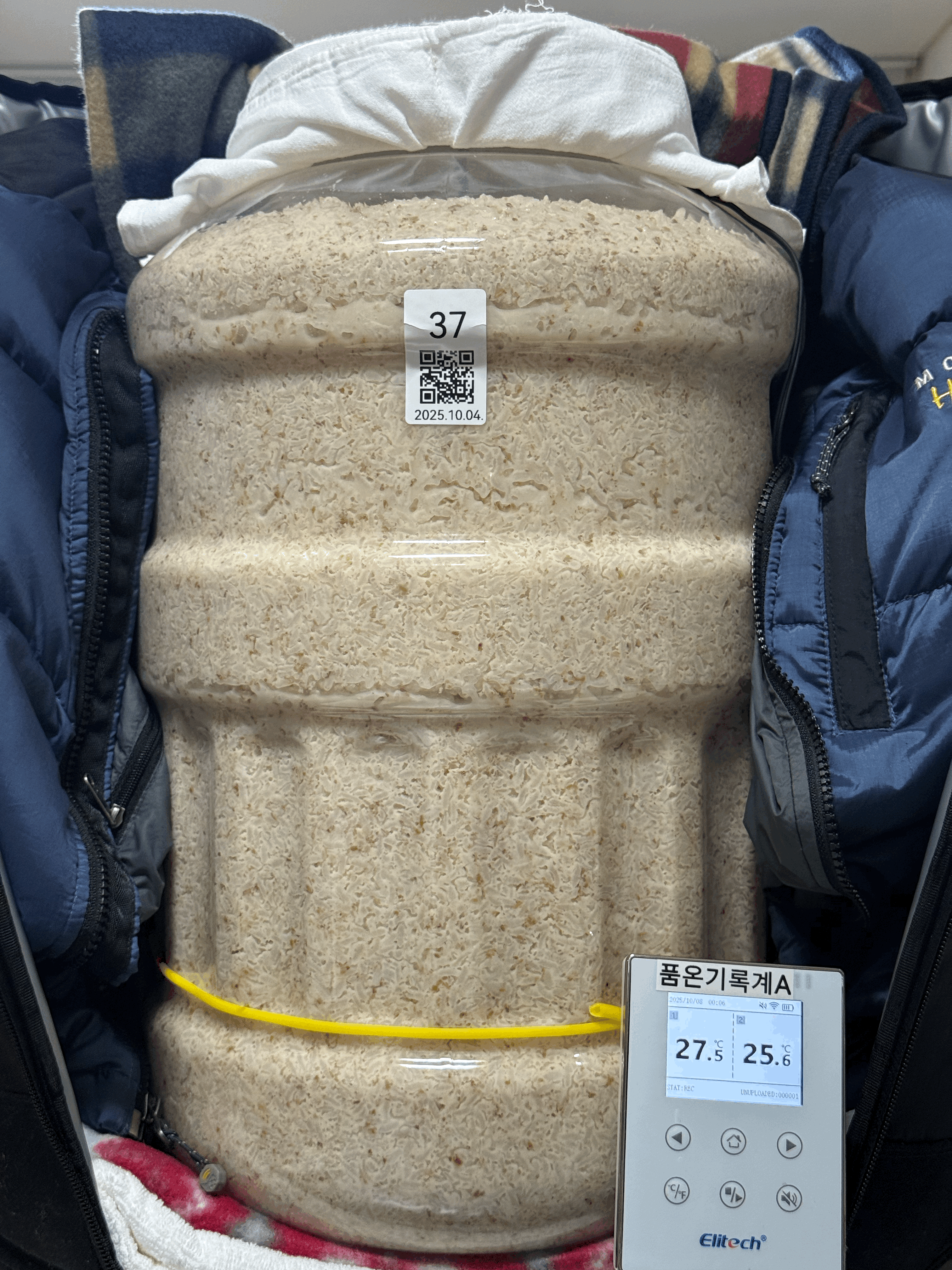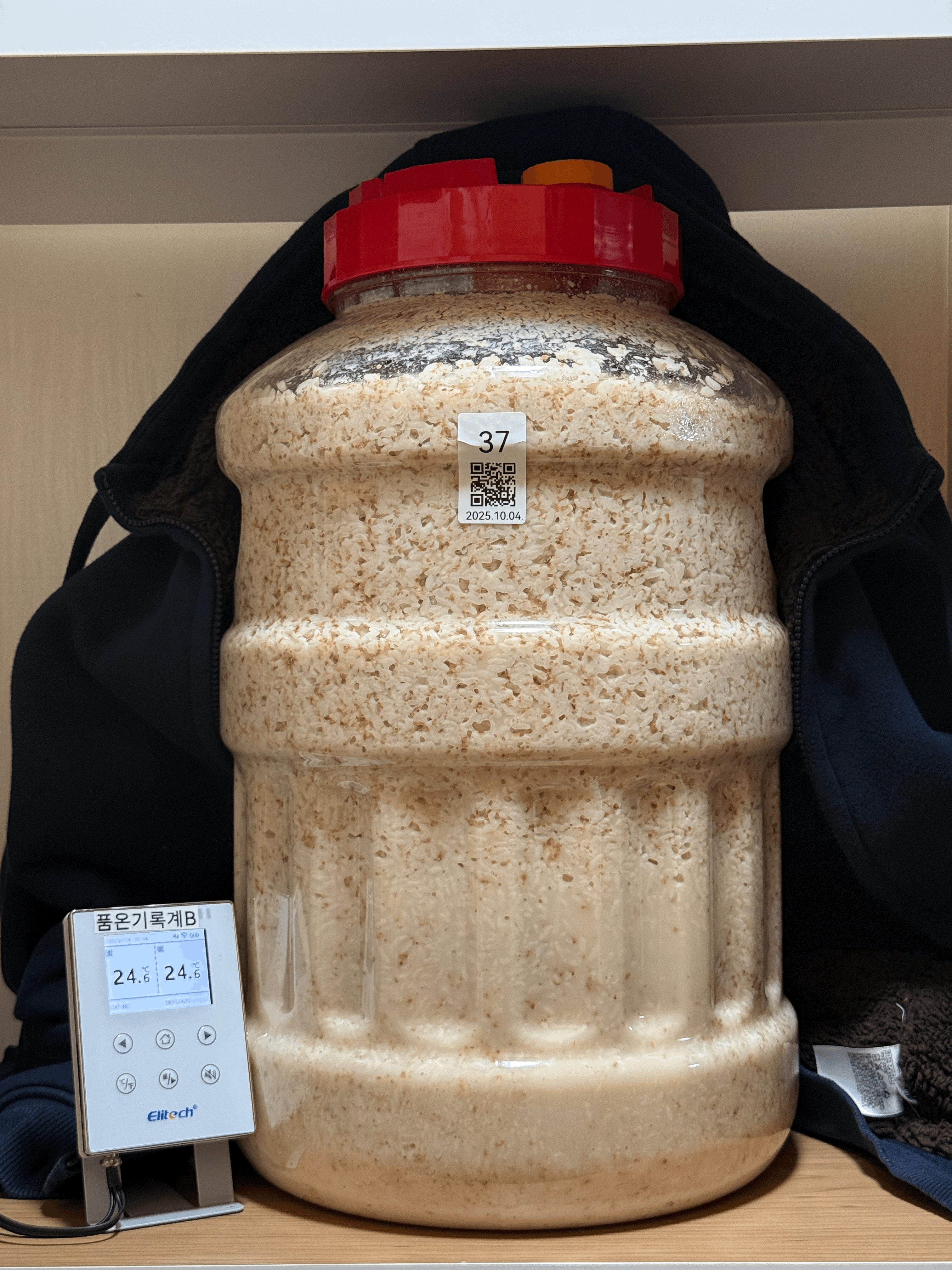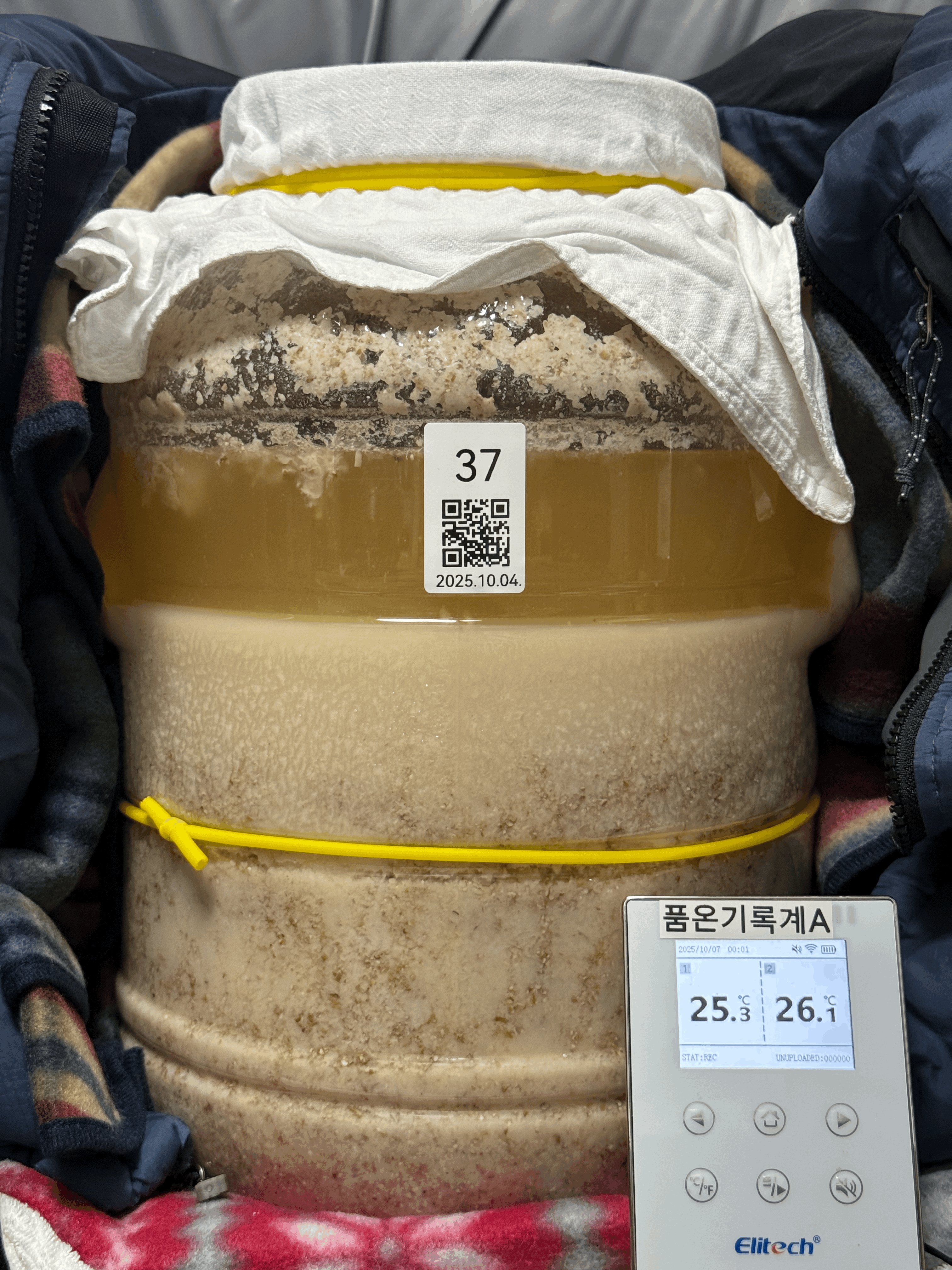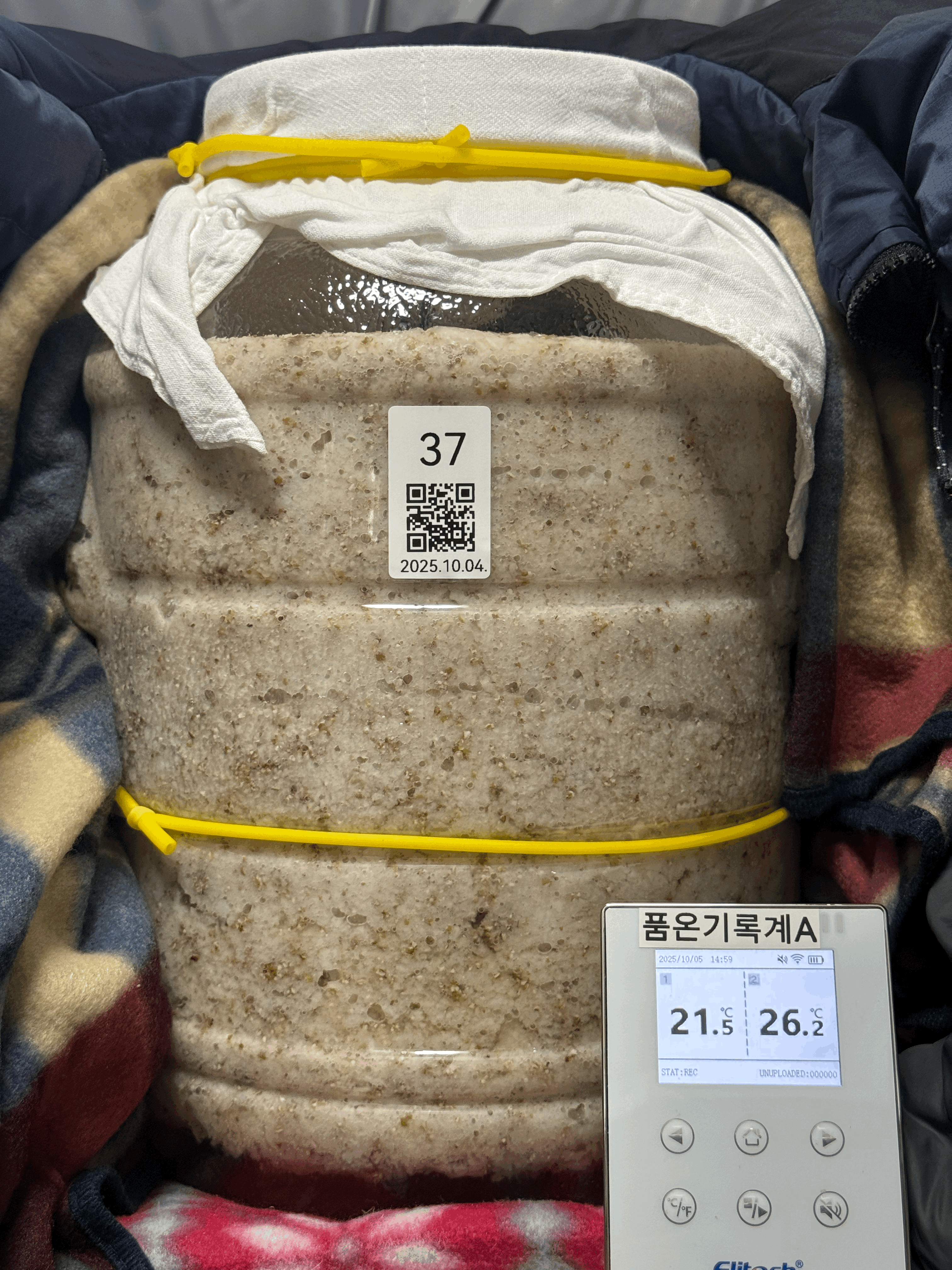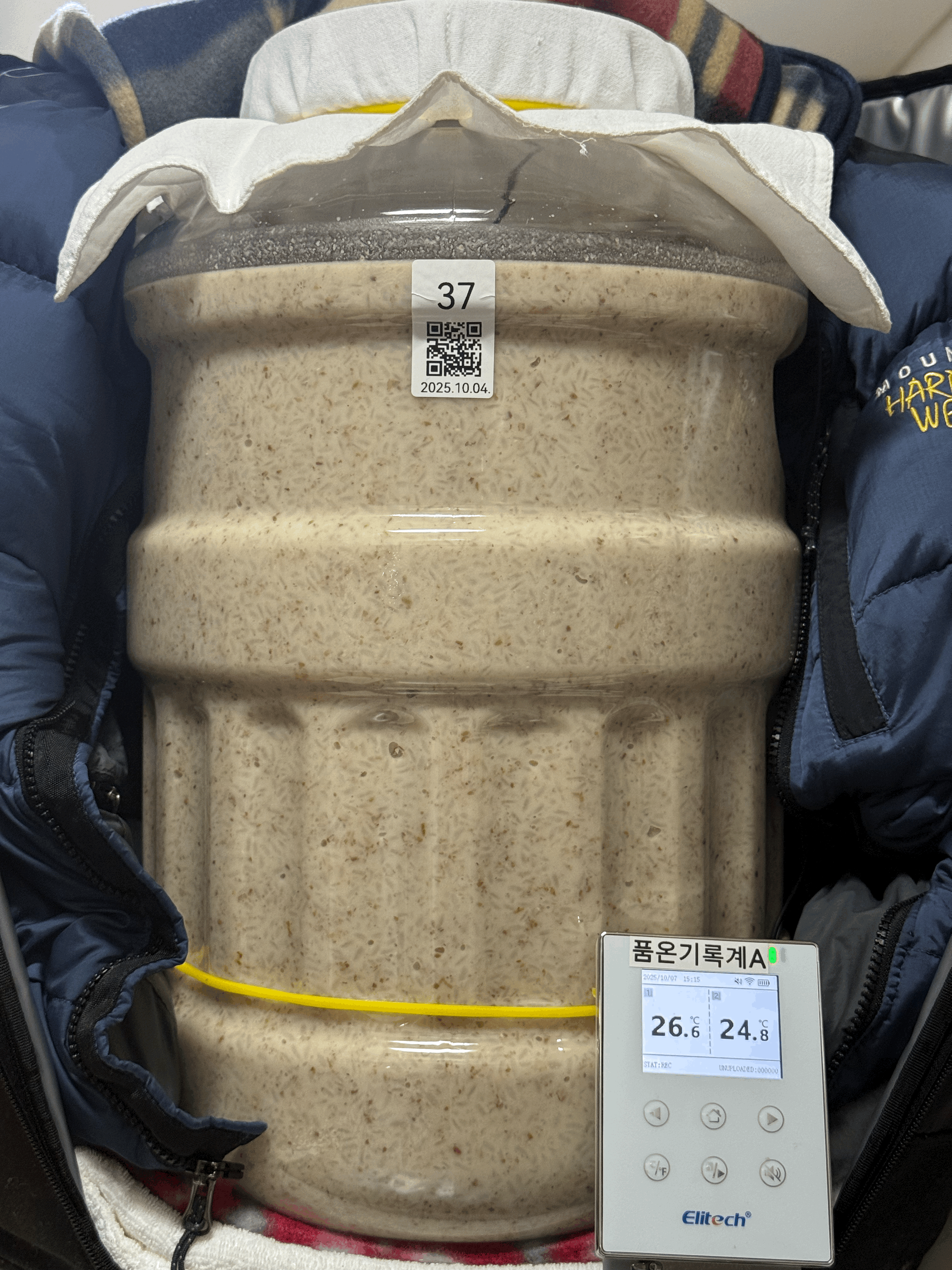 품온이 34.5℃까지 올랐길래 보쌈했던 다운 패딩을 벗겨 술독 옆면을 만져보니 미지근했다. 찹쌀이 아닌 멥쌀이다보니 당화를 좀 더 진행시키는 편이 좋을 것 같아 술덧의 품온이 너무 높지는 않은 채로 좀 더 유지할 목적으로 패딩을 벗기고 보냉백 지퍼를 완전히 열고 빛 차단을 위해 얇은 무릎 담요만 덮어줬다.