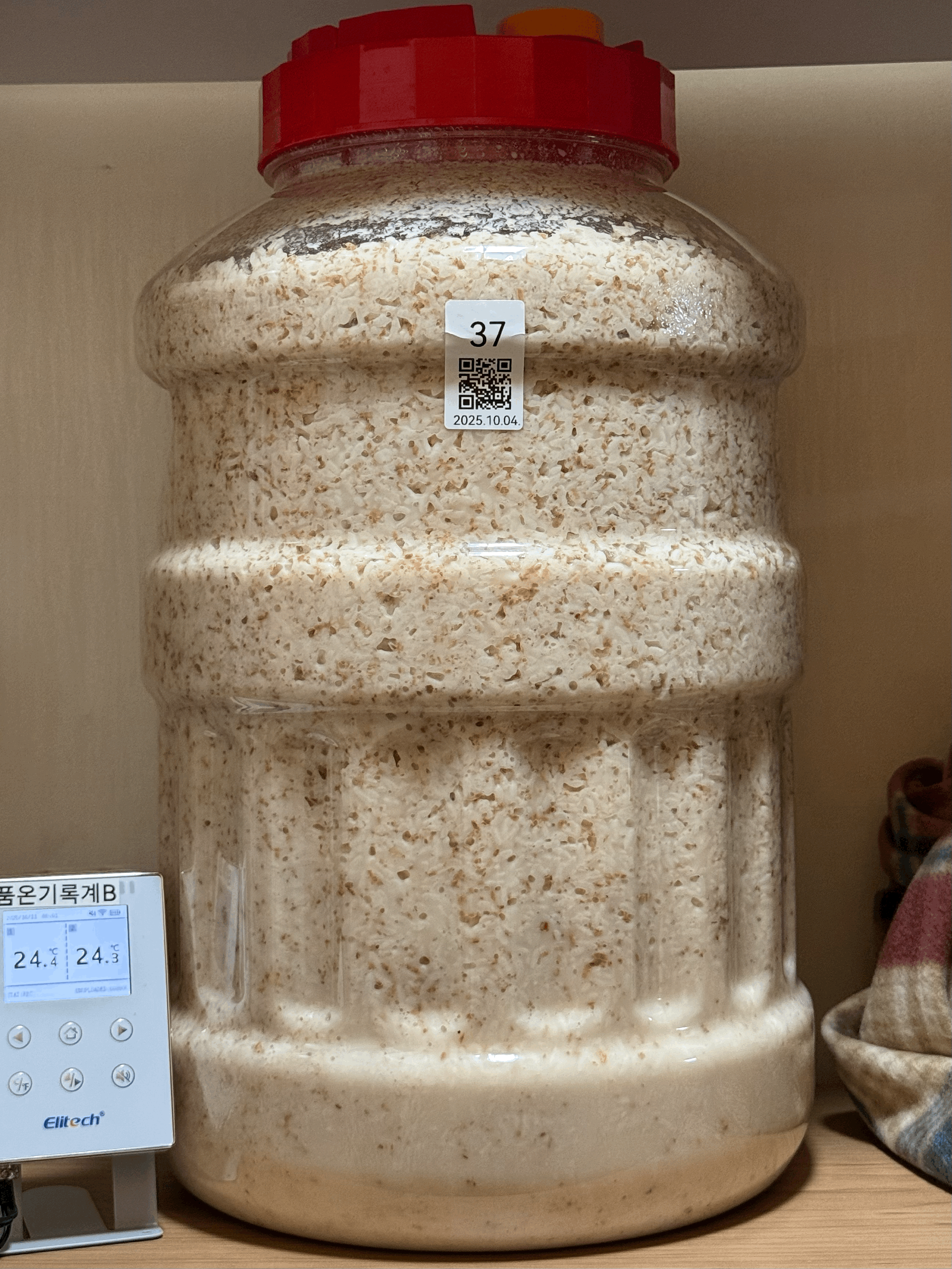 이제 품온 센서를 빼고 뚜껑 닫고 보쌈하지 않은 채 실온에서 후발효한다. 품온 기록은 여기까지.